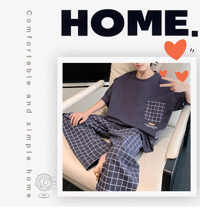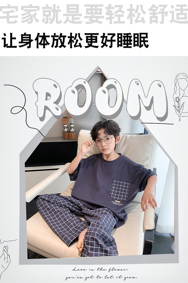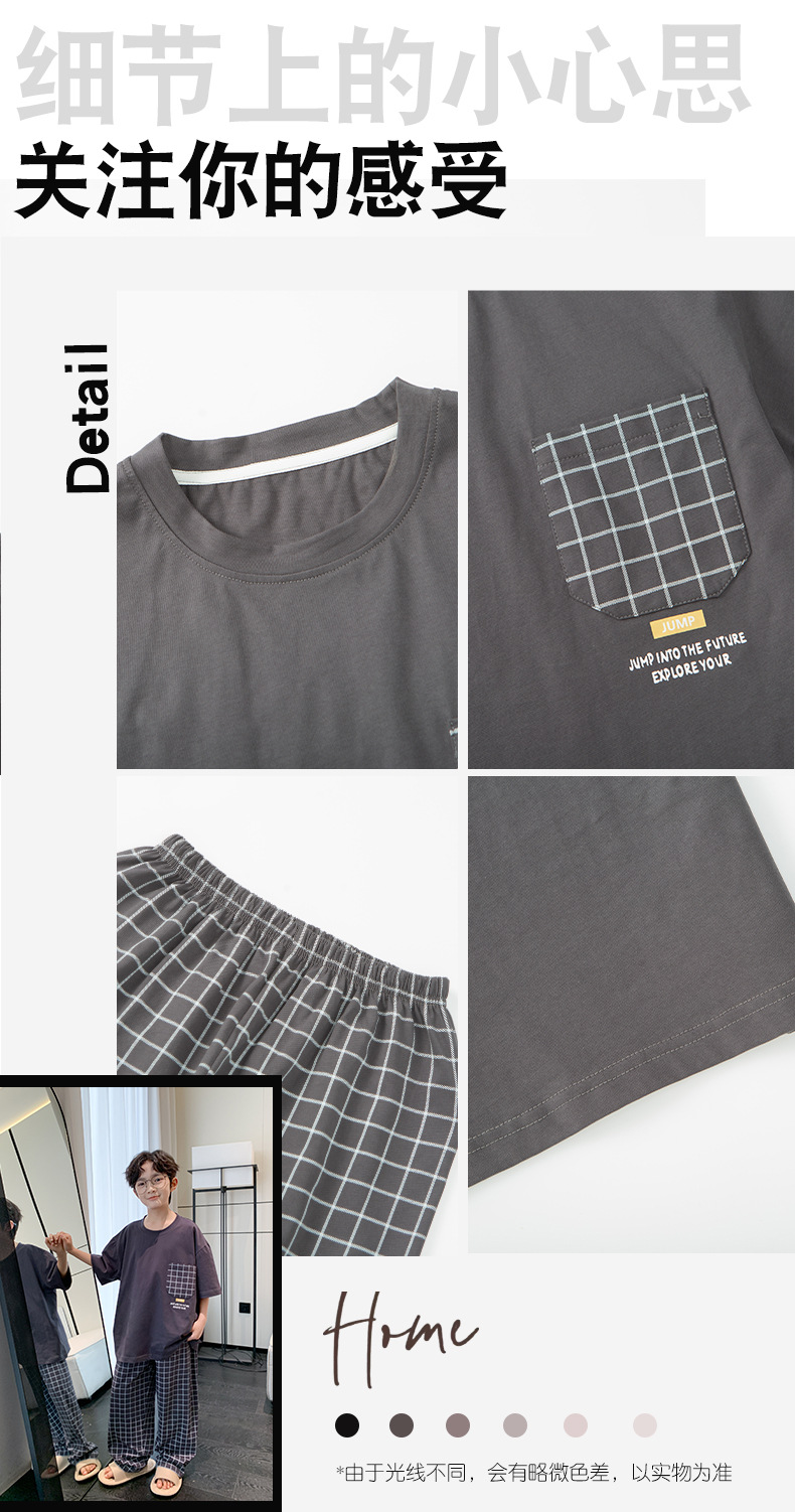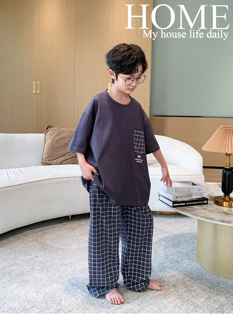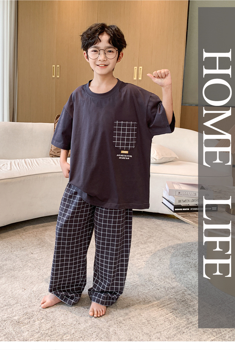 소년 여름 소년 및 청소년을위한 순면 잠옷 중대형 어린이를위한 반팔 3 피스 세트 에어컨 가정복 어린이 여름 스타일스토어 가기