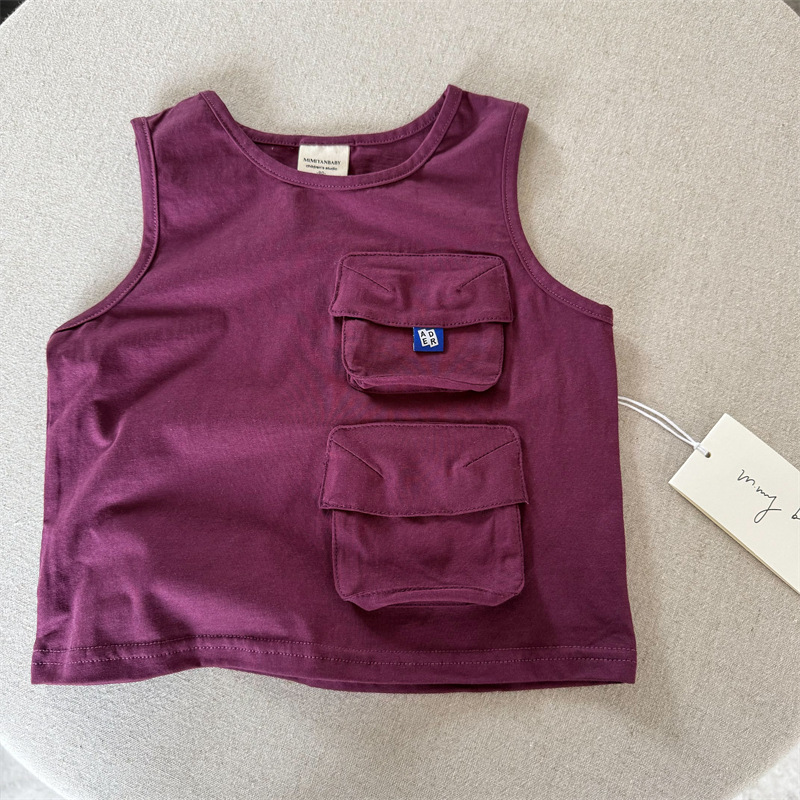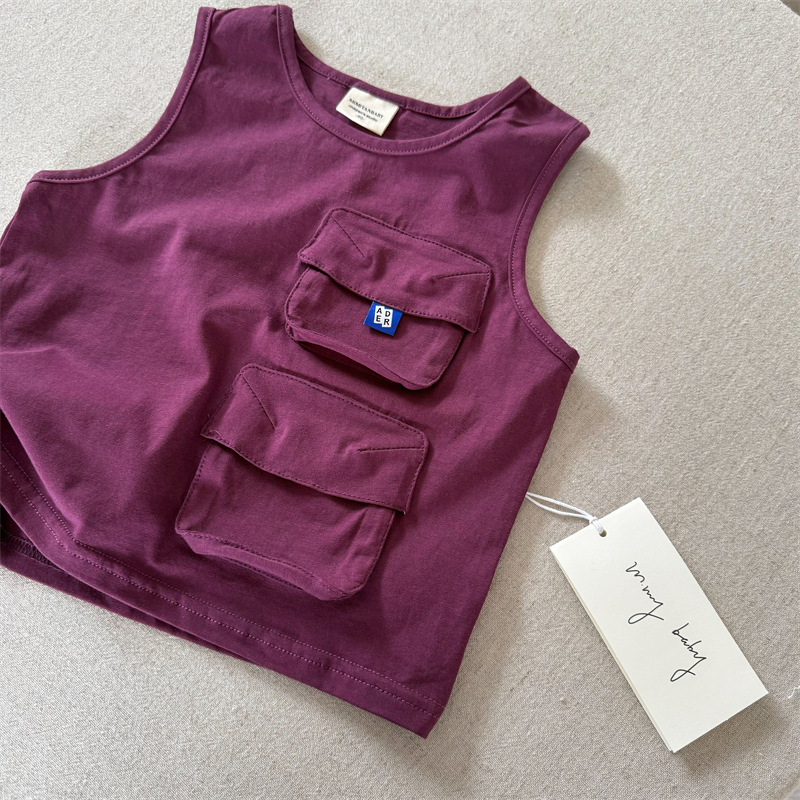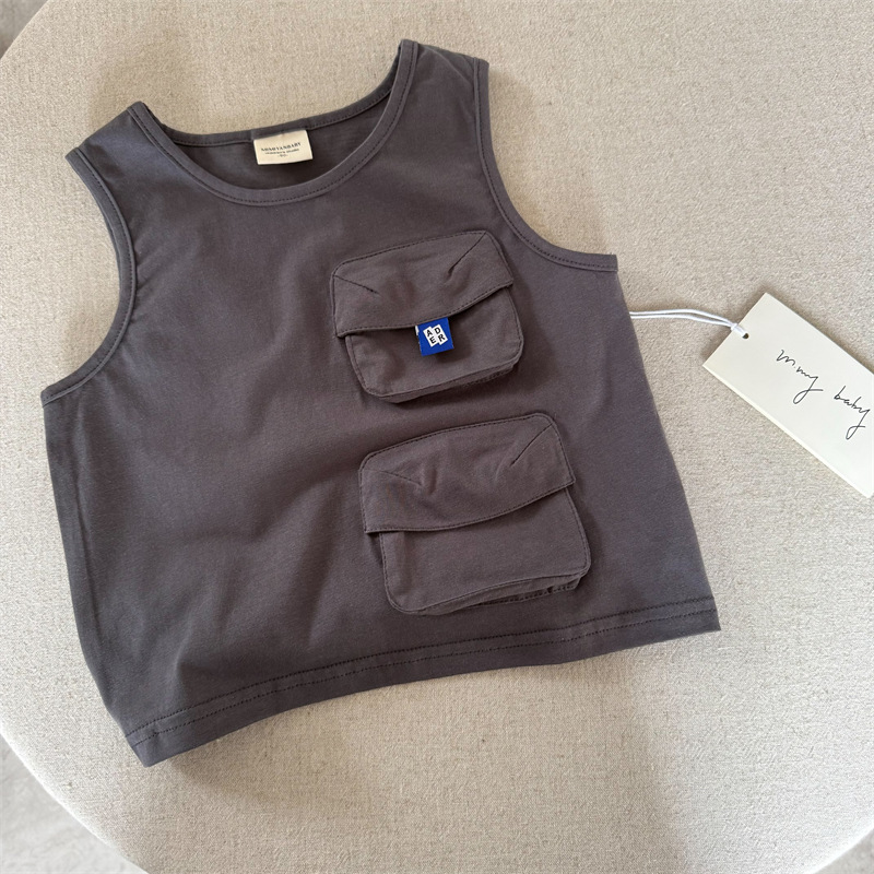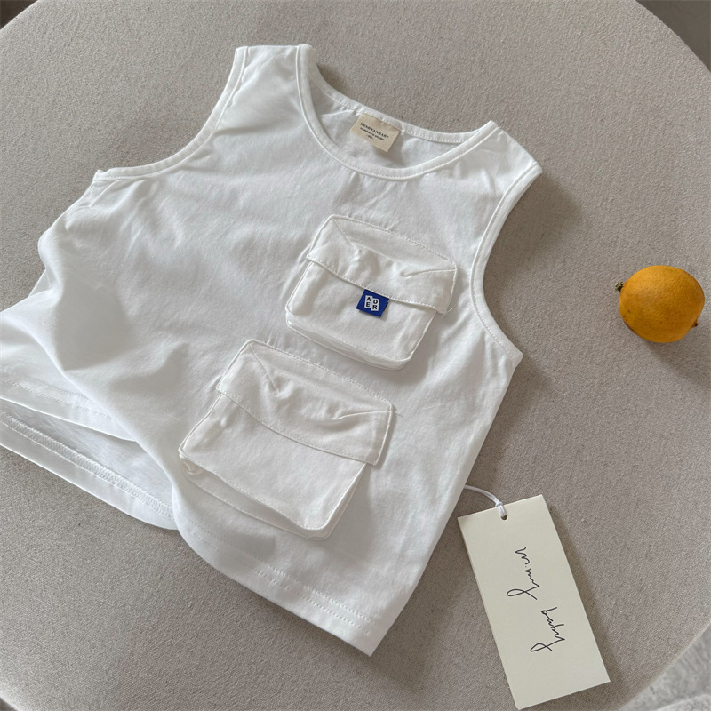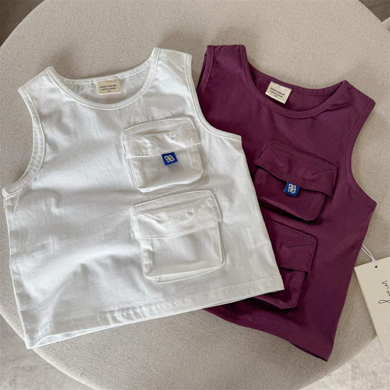 어린이 조끼 2025 스팽글 여름 새 소년과 소녀 간단한 포켓 조끼 아기 솔리드 컬러 민소매 패션스토어 가기