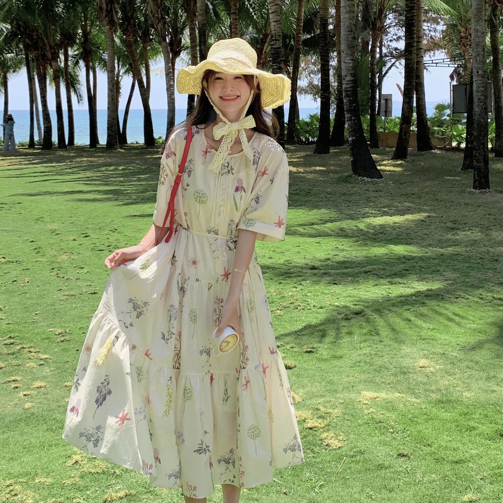 실제 촬영 프랑스 연령 감소 꽃 원피스 2025 새로운 달콤한 소녀 크루 넥 허리 레이스 업 슬림 A 라인 스커트스토어 가기