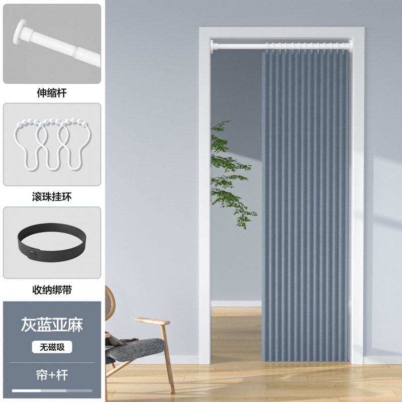 • [양면자석흡입] 그레이블루 접이식 도어커튼 (커튼+봉+화이트 볼링)