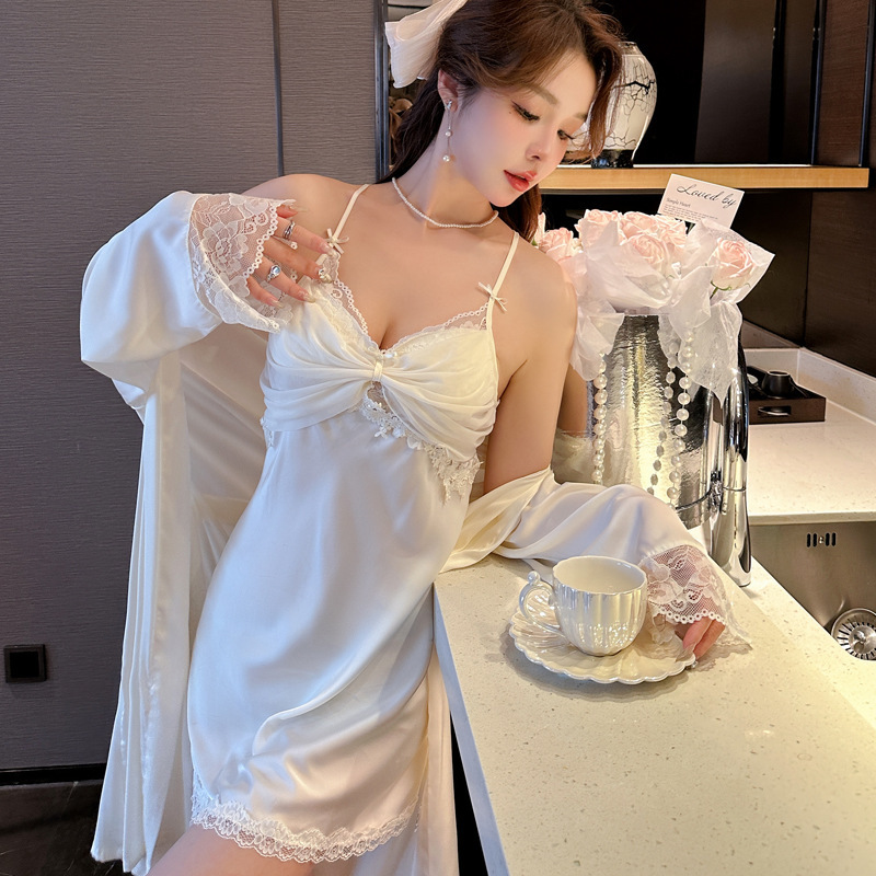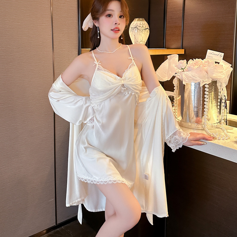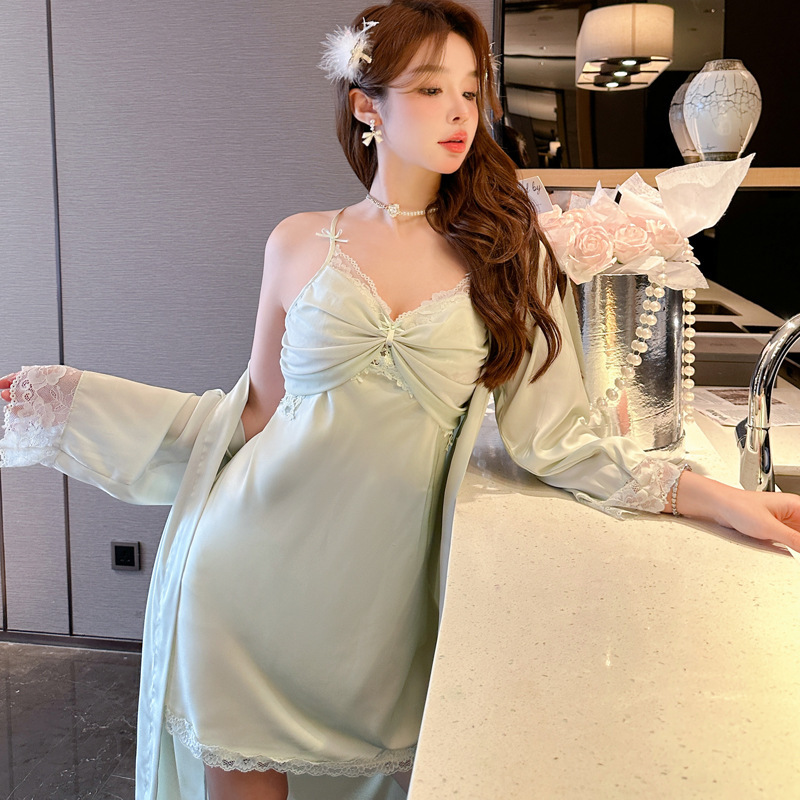 새로운 여성 여름 얼음 실크 잠옷 얇은 서스펜더 잠옷 섹시한 잠옷 투피스 양복 봄과 가을 목욕 가운 홈웨어