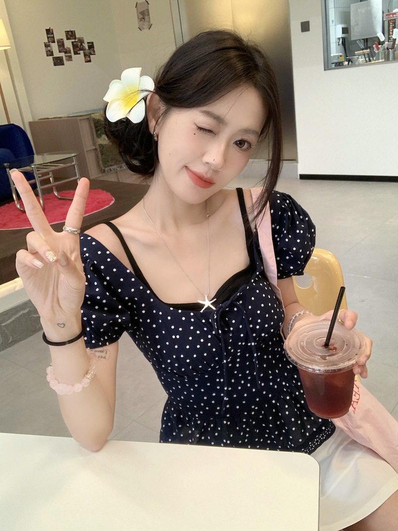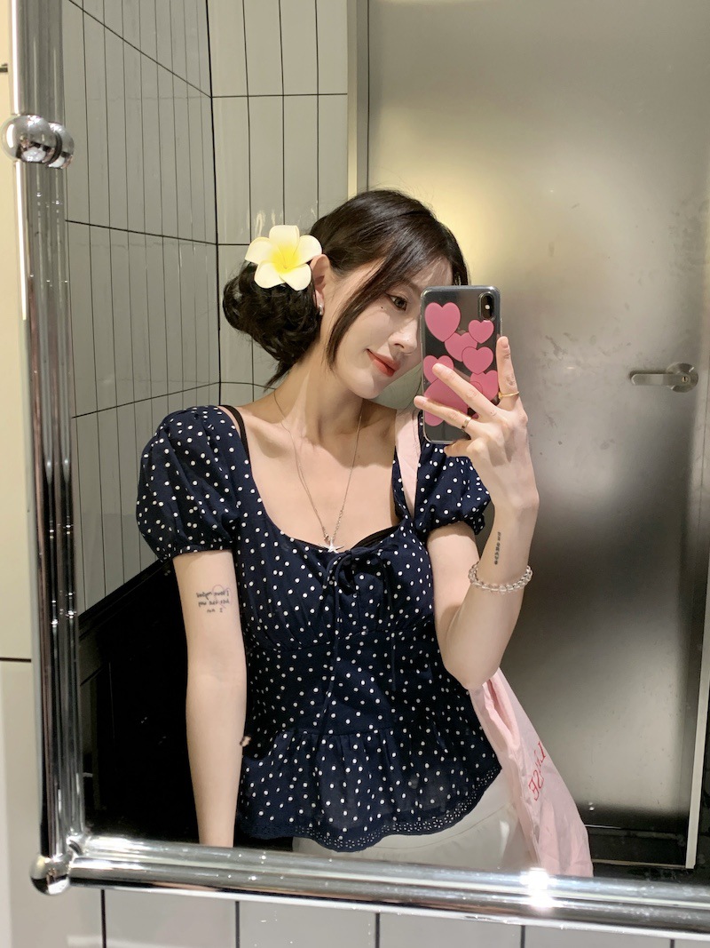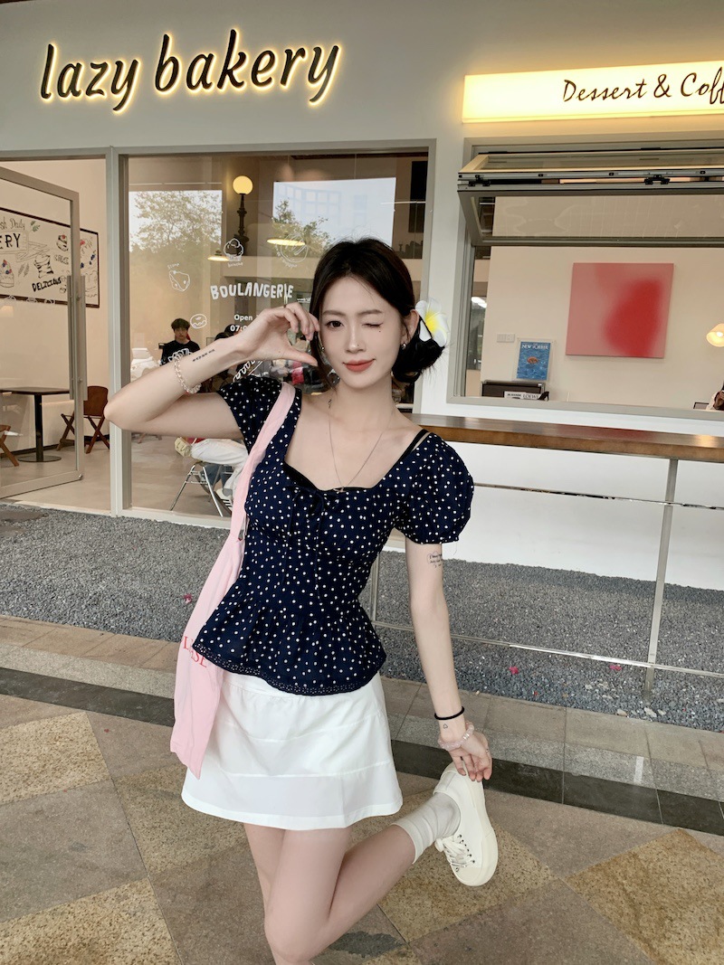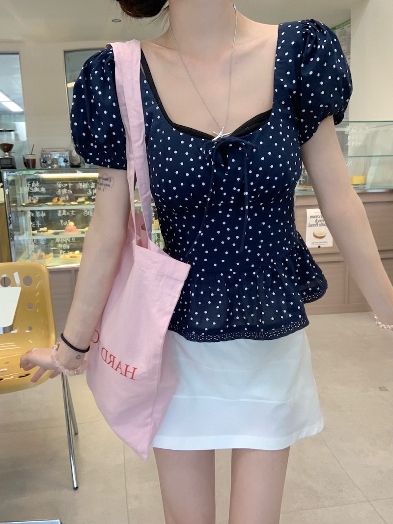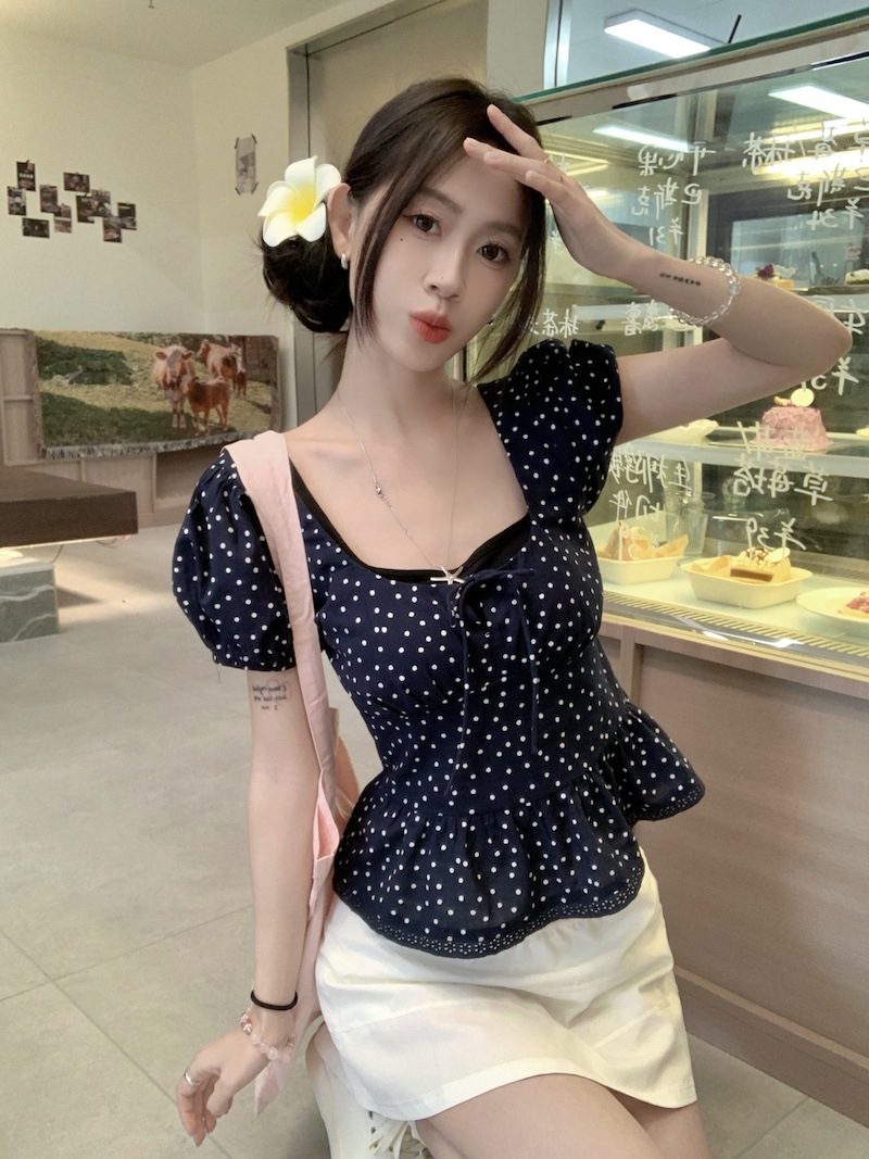 폴로 도트 반팔 티셔츠 여성 여름 2025 새로운 타이트 허리 슬림 핏 슬리밍 디자인 센스 한국 우아한 쇼트 탑스토어 가기
