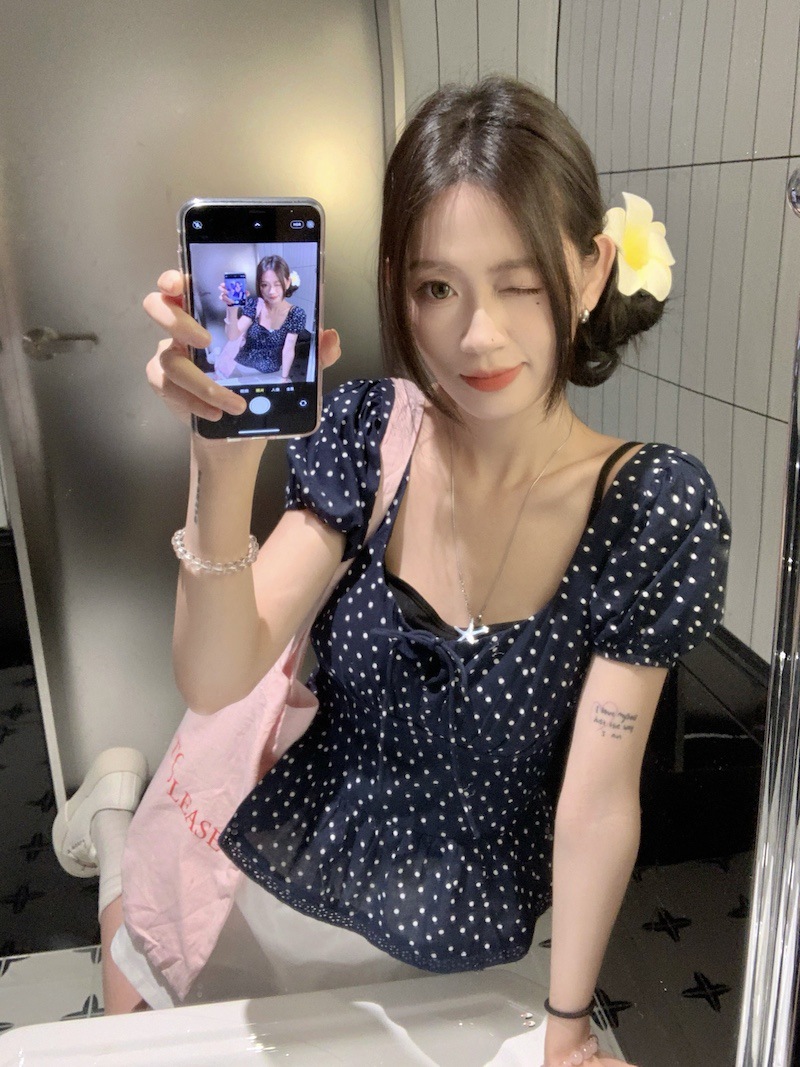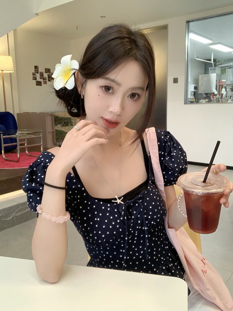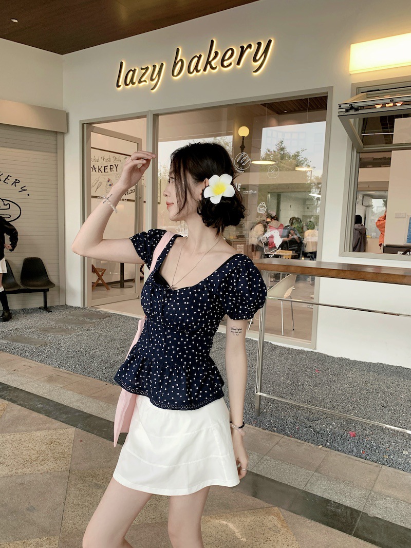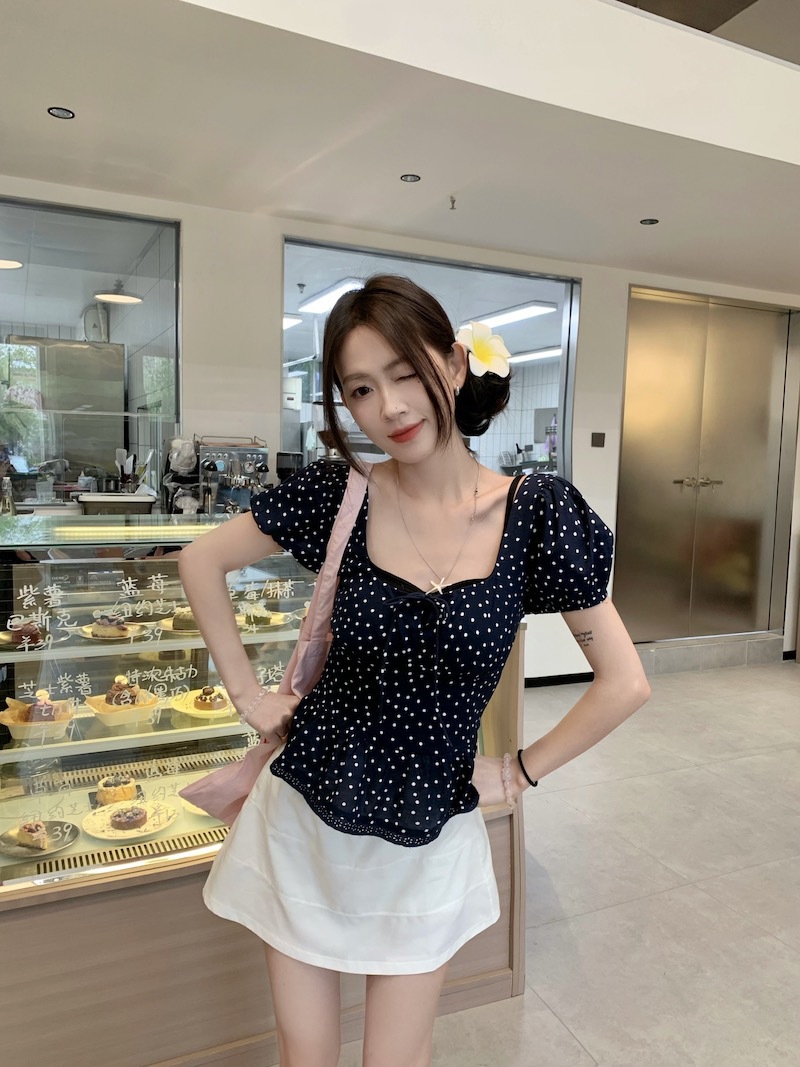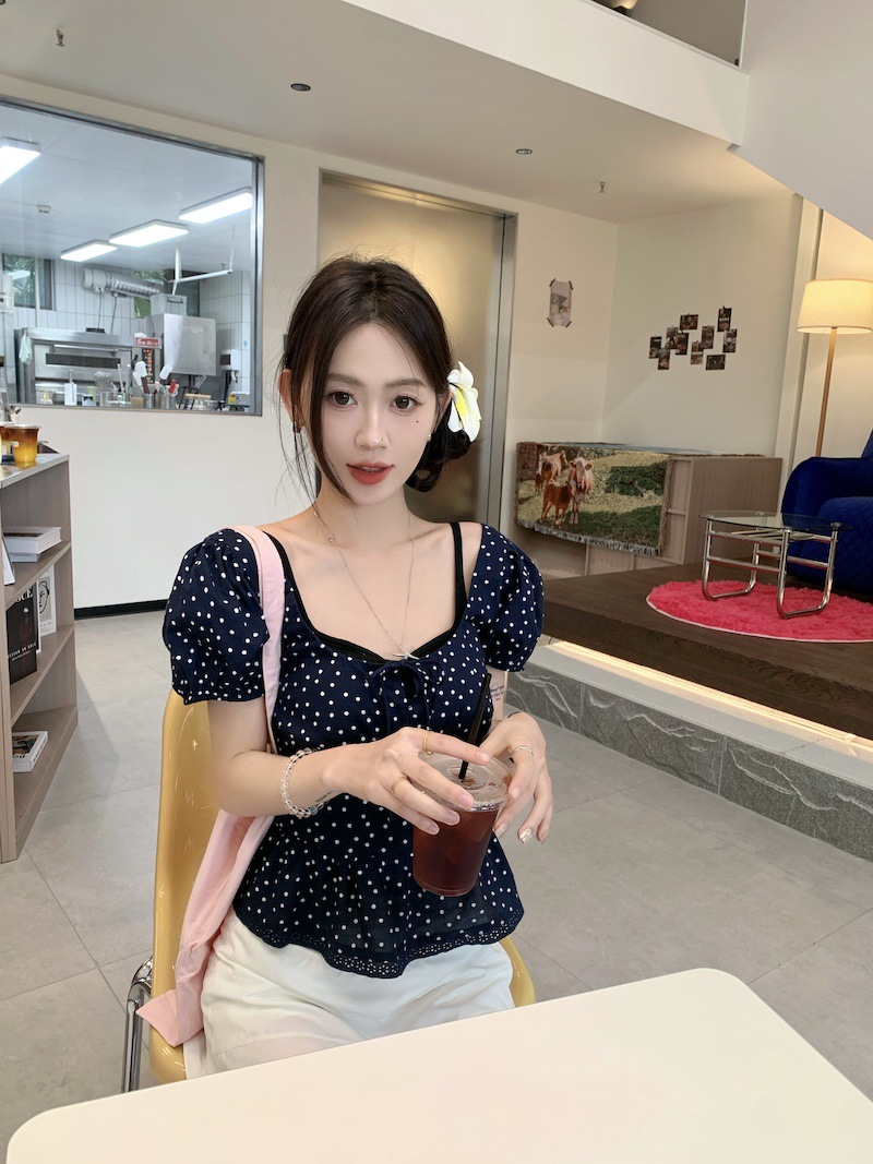 폴로 도트 반팔 티셔츠 여성 여름 2025 새로운 타이트 허리 슬림 핏 슬리밍 디자인 센스 한국 우아한 쇼트 탑스토어 가기
