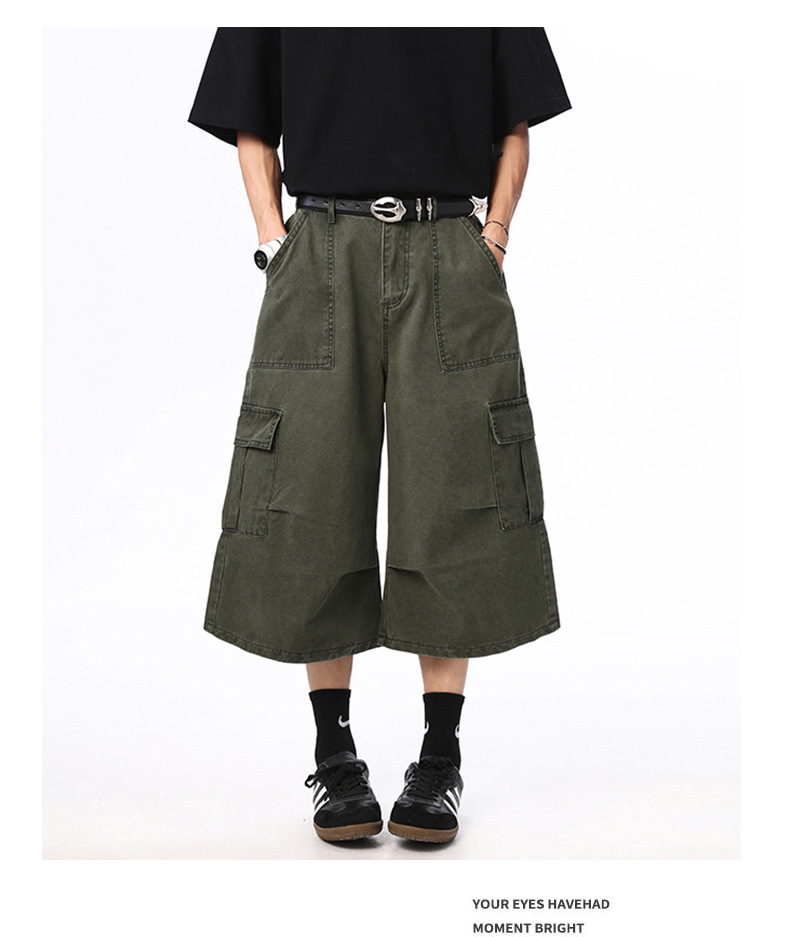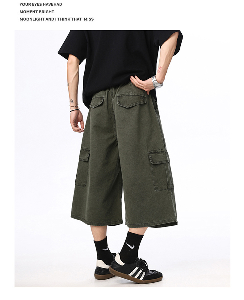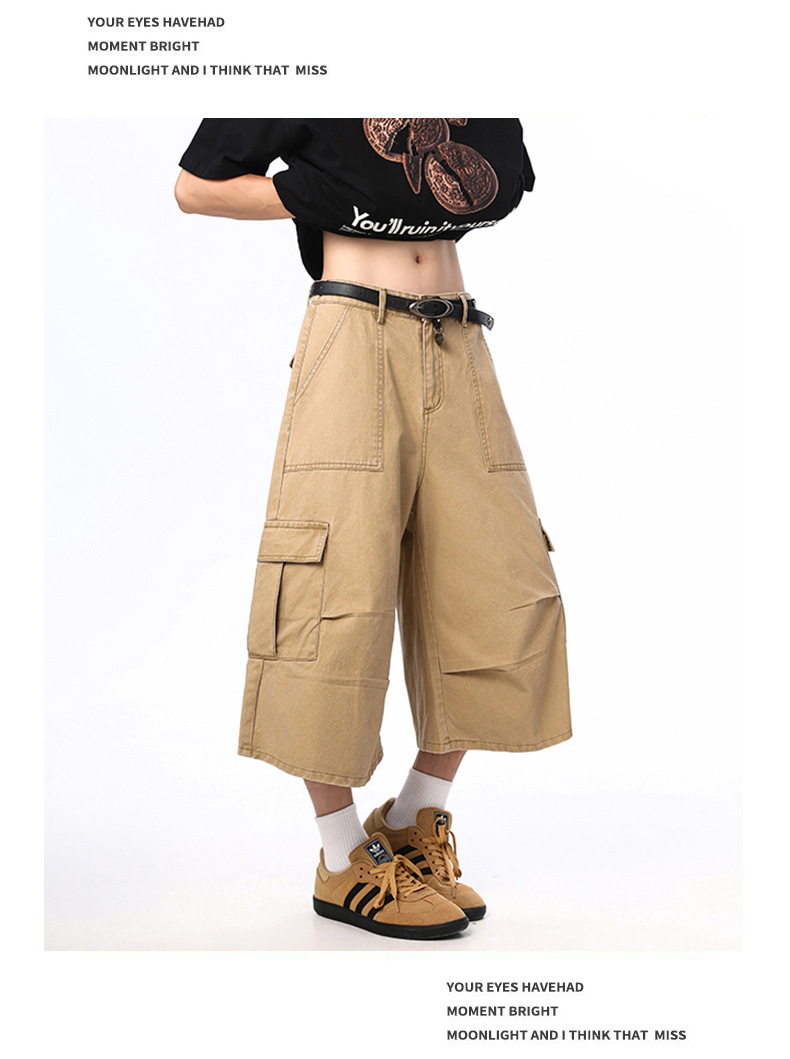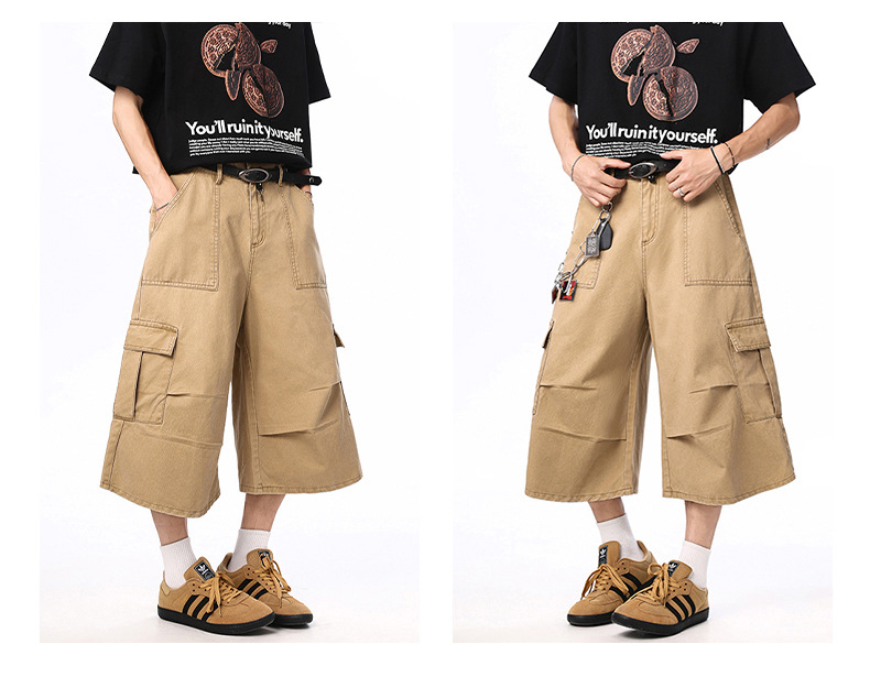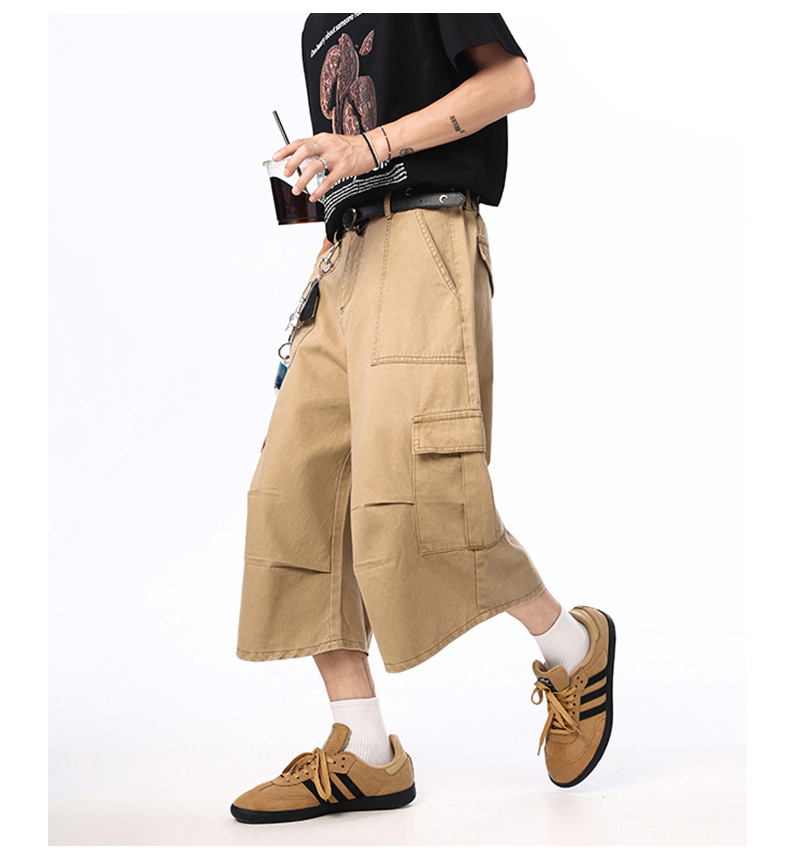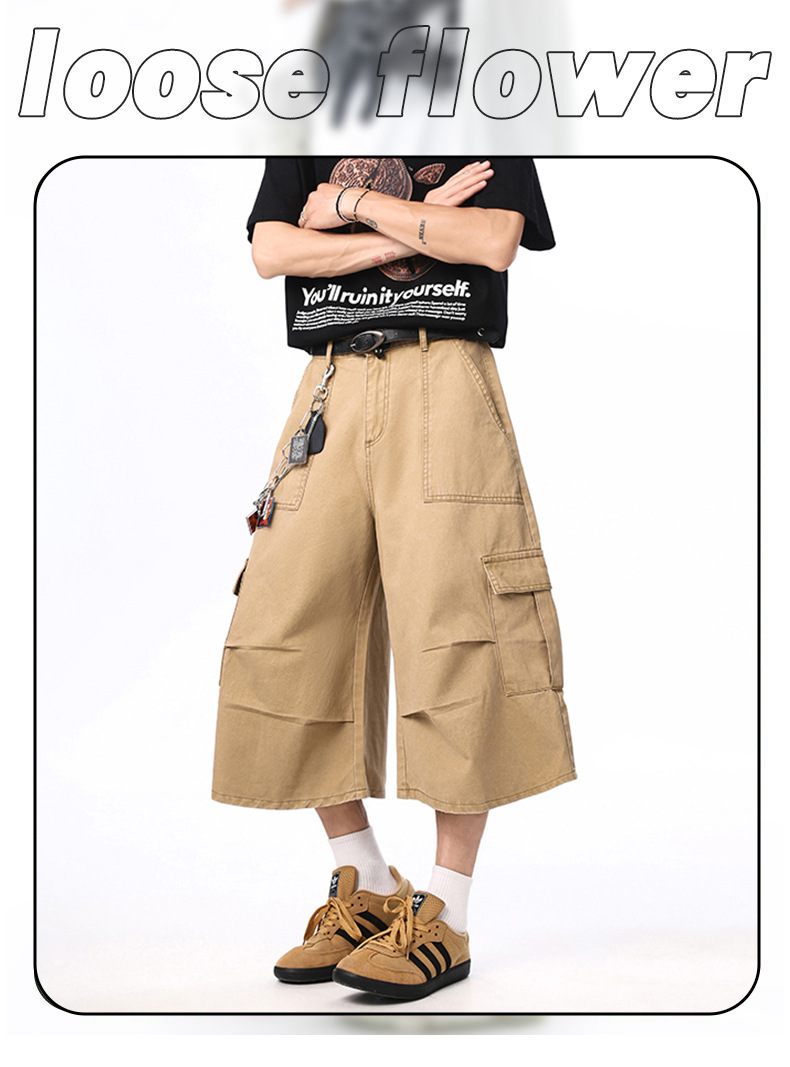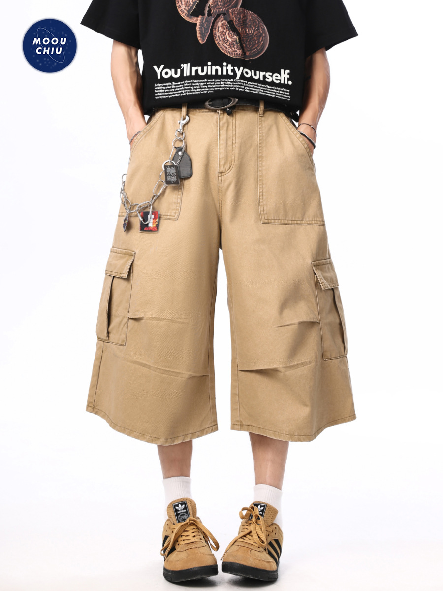 Muqiu 남성복 ∠ 미국 스타일 트렌디 브랜드 멀티 포켓 크롭 캐주얼 오버볼 남성 여름 느슨한 스트레이트 빈티지 반바지
