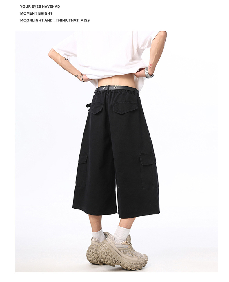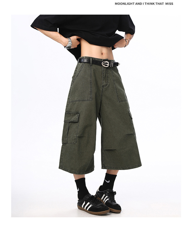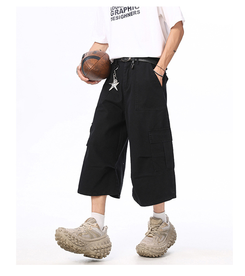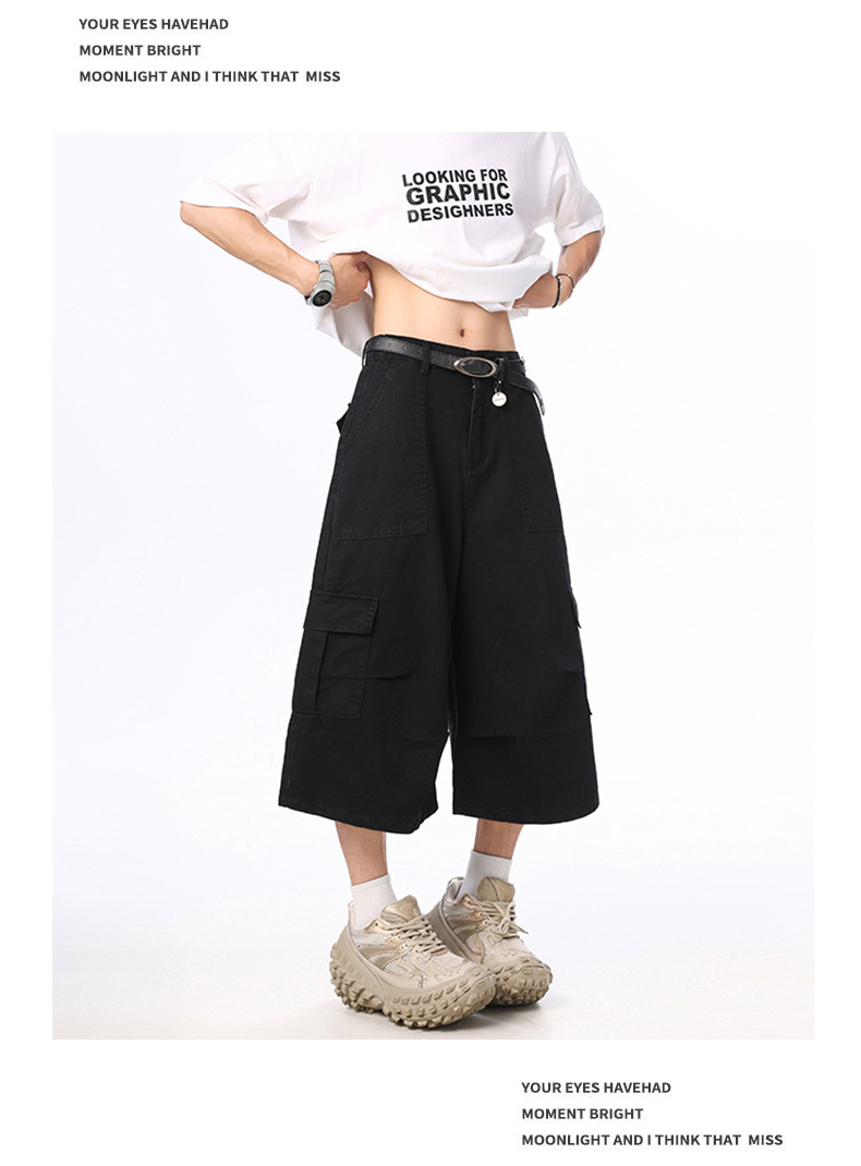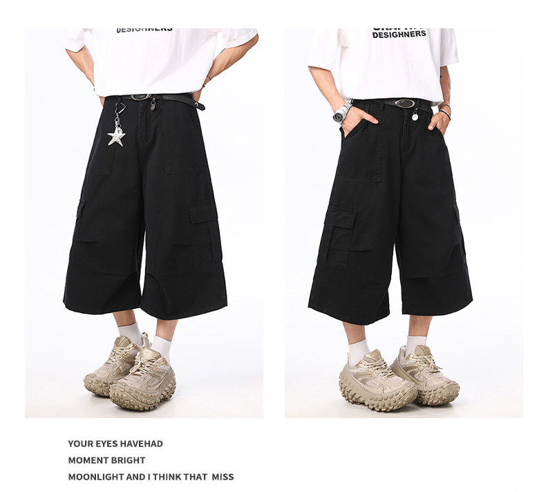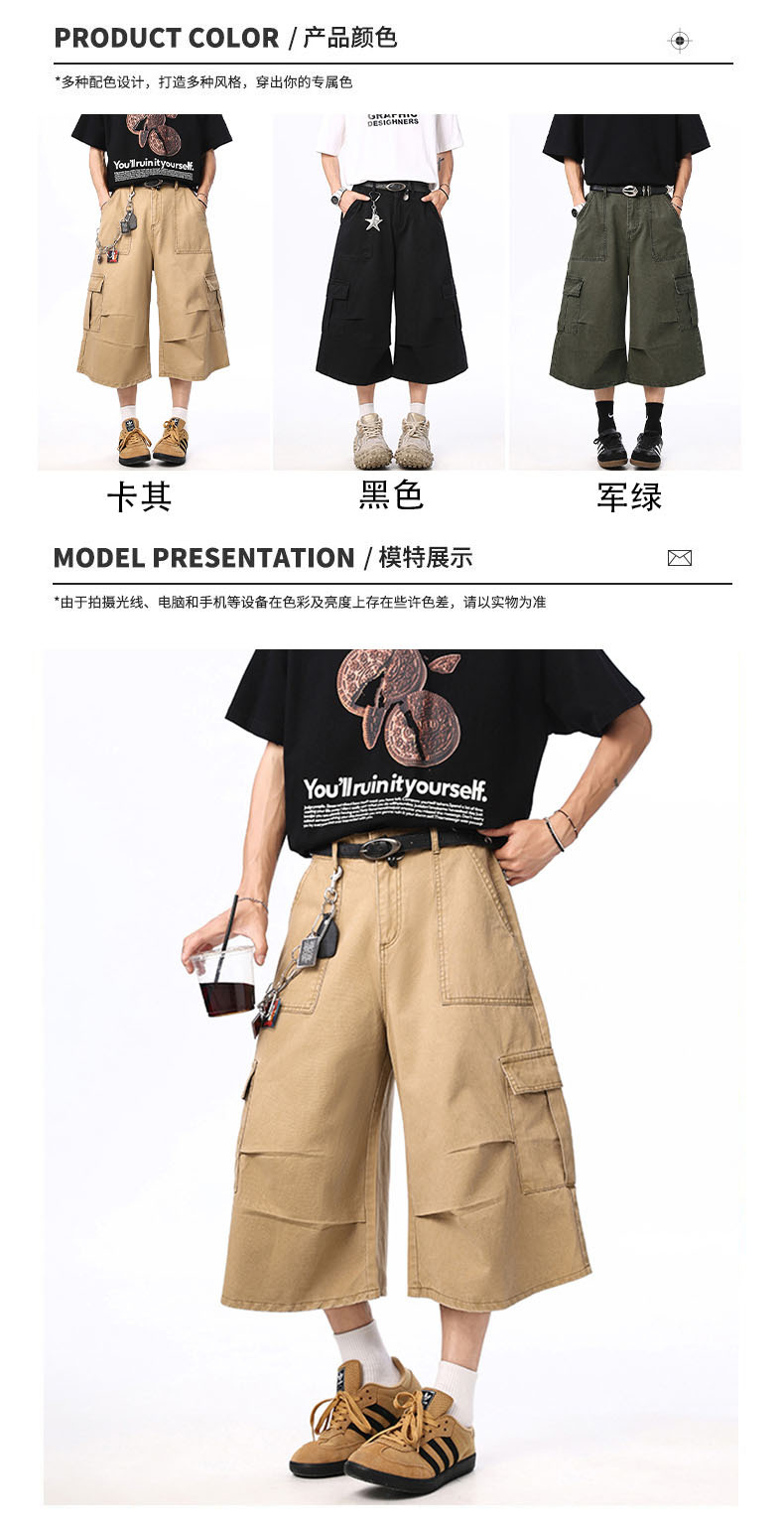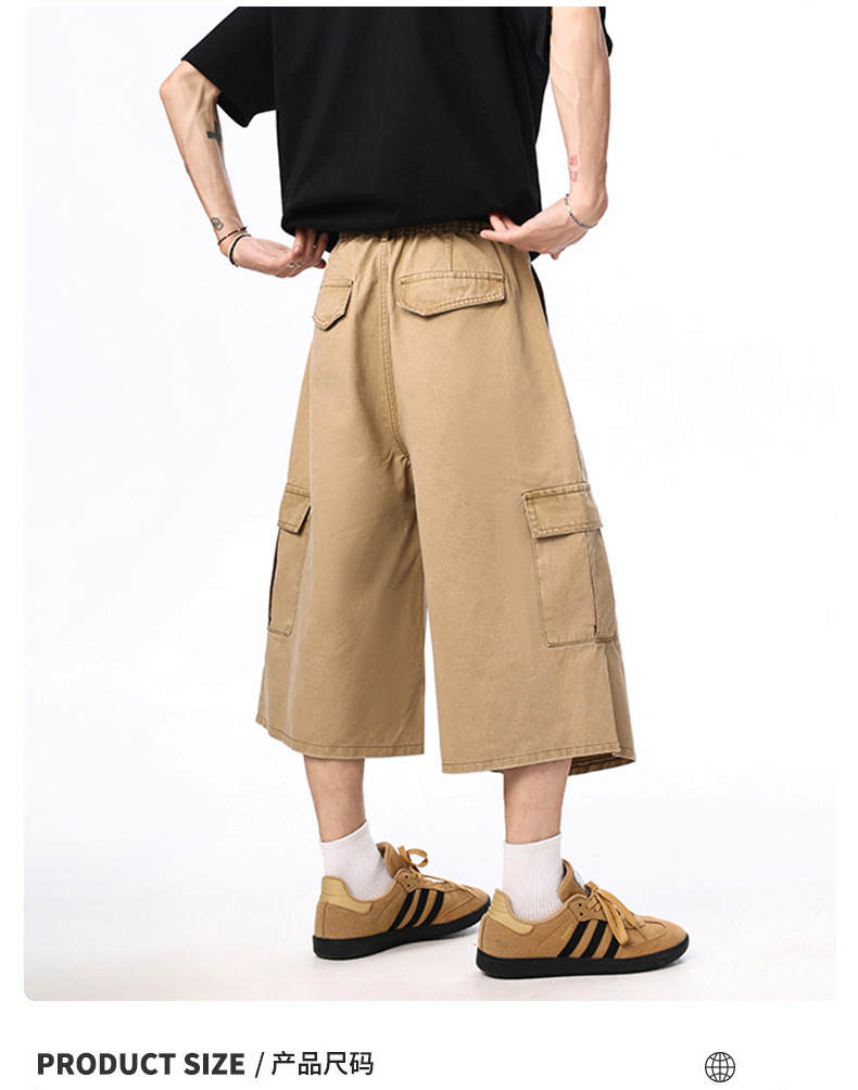 Muqiu 남성복 ∠ 미국 스타일 트렌디 브랜드 멀티 포켓 크롭 캐주얼 오버볼 남성 여름 느슨한 스트레이트 빈티지 반바지