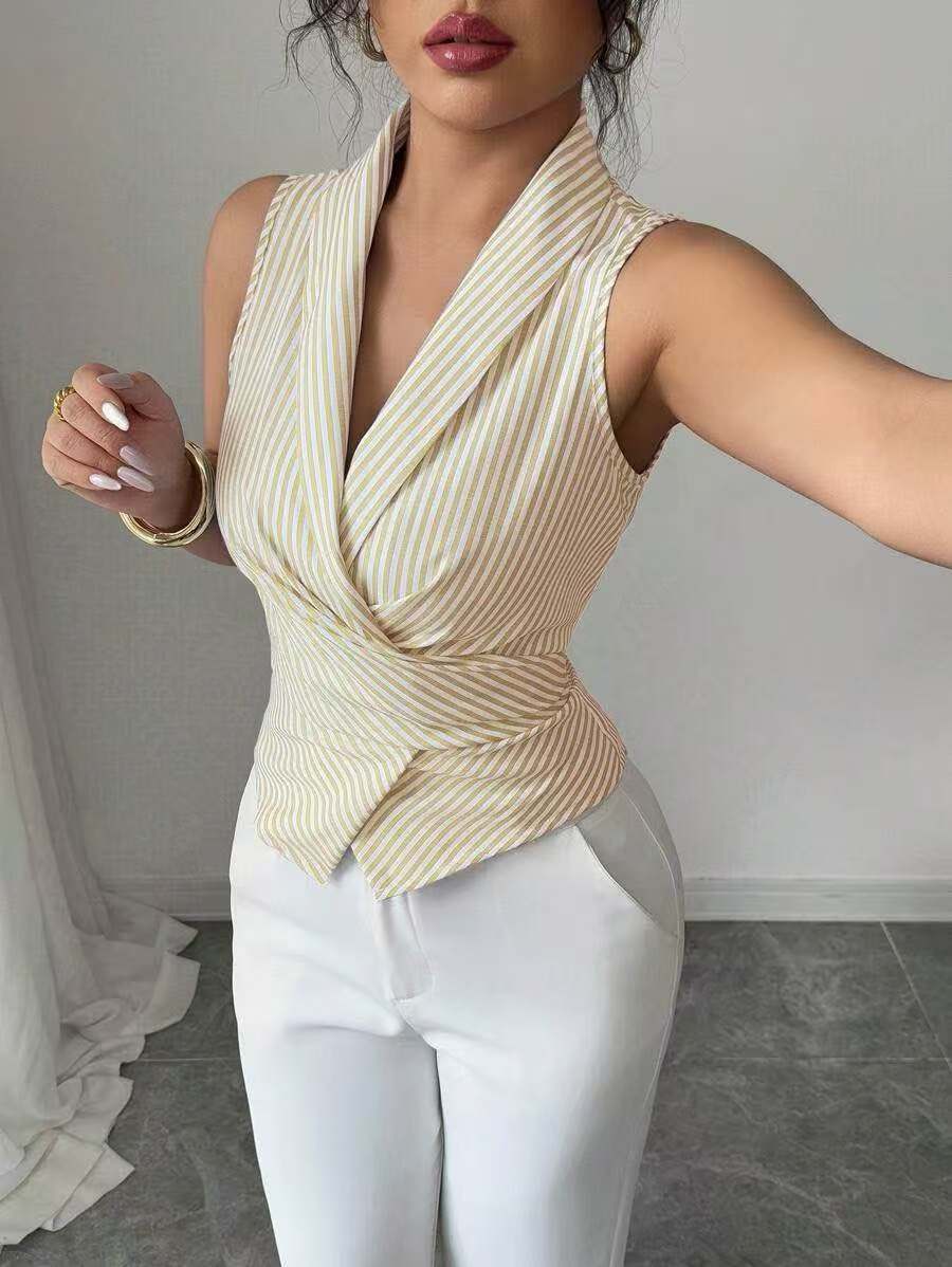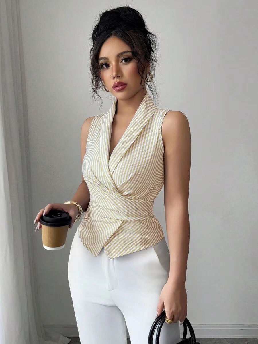 국경 유럽과 미국의 줄무늬 민소매 셔츠 2025 여름 스트랩 허리 슬리밍 조끼 셔츠 이베이 대외 무역 여성 의류
