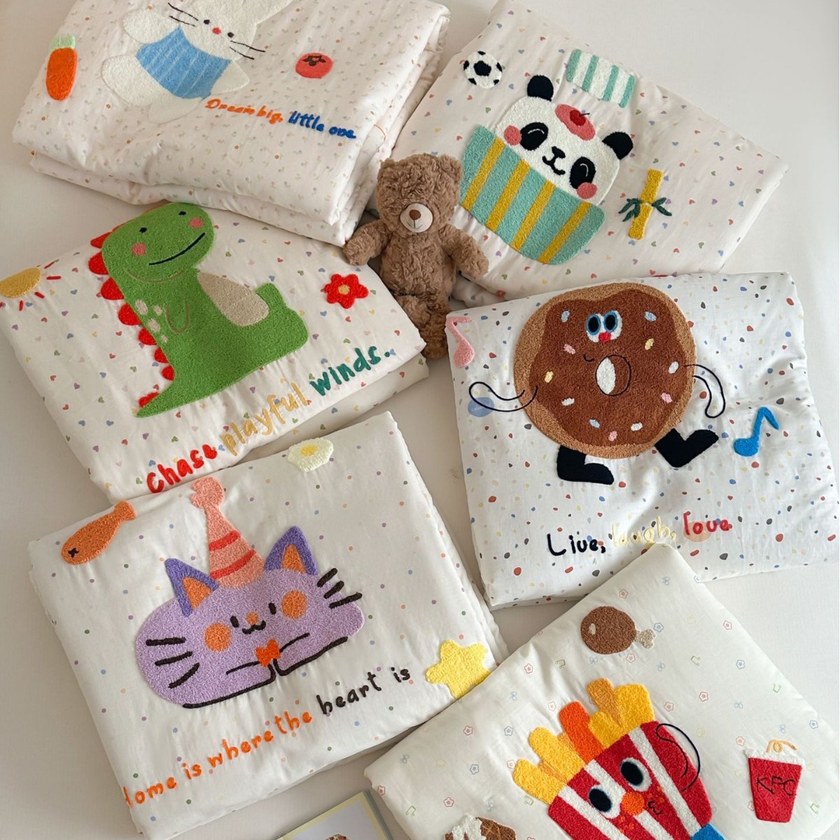 织梦街夏被系列采用毛巾绣工艺,精心打造出软萌萌、蓝绒兔、巧乐圈、薯宝宝、盼盼、皮皮龙六种可爱卡通形象。毛巾绣工艺赋予图案立体触感,让卡通形象跃然被面,可爱又时尚,为卧室增添一抹童趣。无论是童心未泯的大人,还是充满幻想的孩子,都能找到心仪图案。