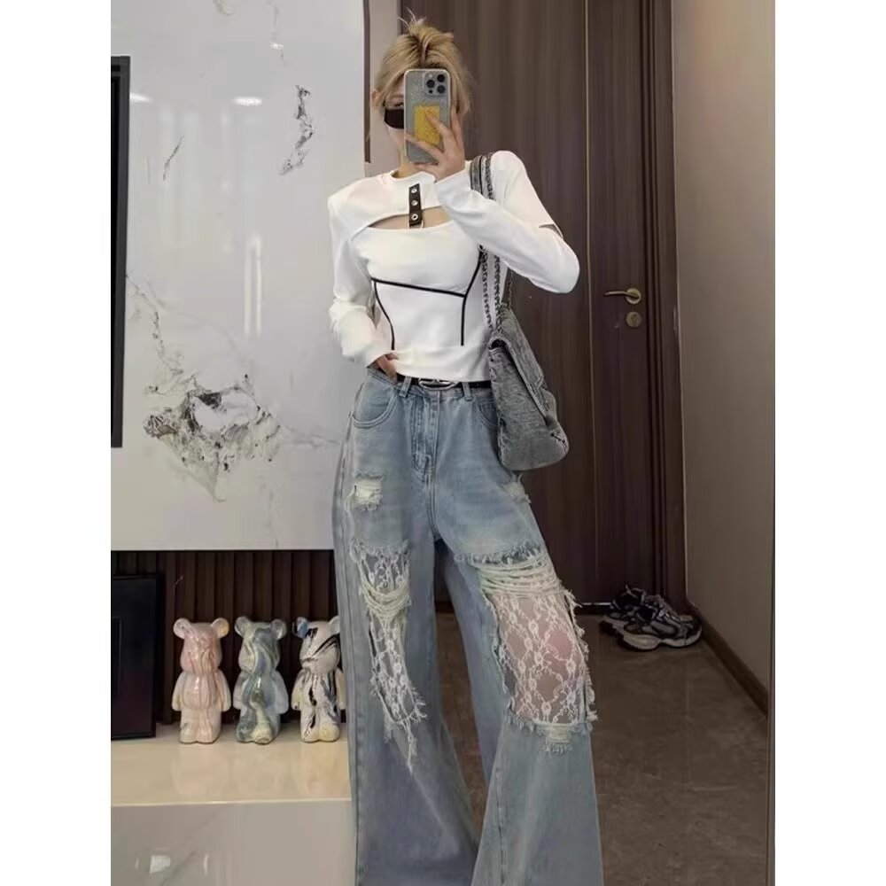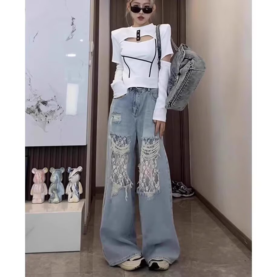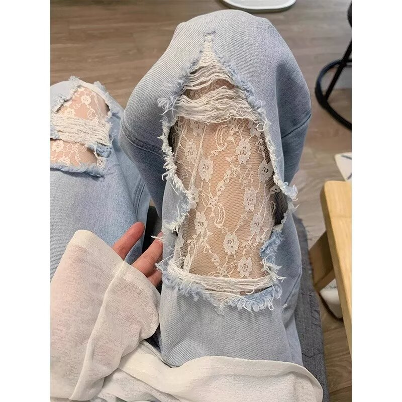 레트로 찢어진 청바지 여성의 봄과 여름 새로운 미국 스타일 높은 허리 슬리밍 레이스 스티칭 디자인 센스 루즈 스트레이트 팬츠