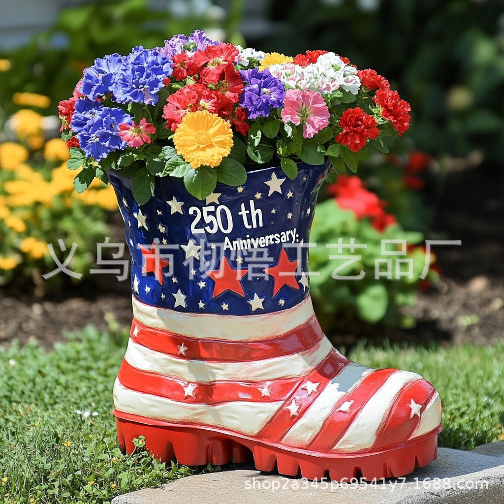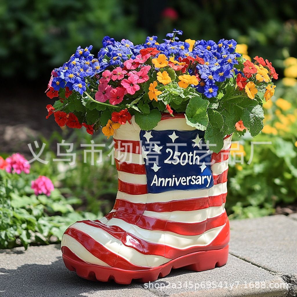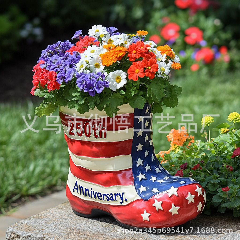 국경을 넘어 미국의 자유 250주년을 기념하여 국기 장화 꽃병을 축하합니다.
