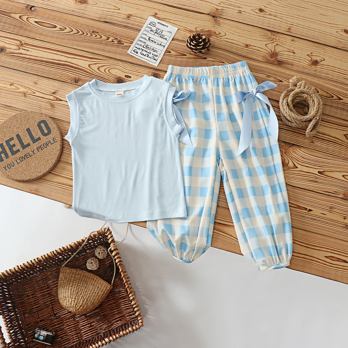 여자 여름 정장 2025 새로운 스타일 여자 스포츠 어린이 민소매 격자 무늬 조끼 투피스 세트스토어 가기