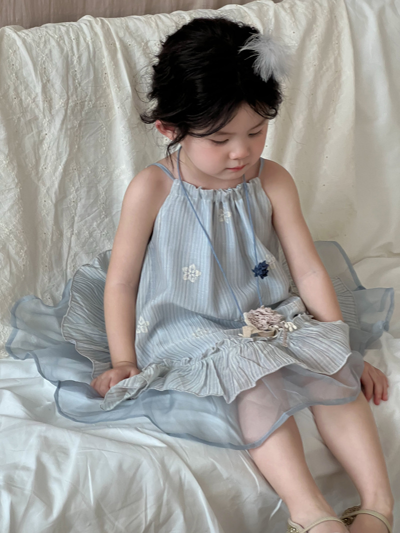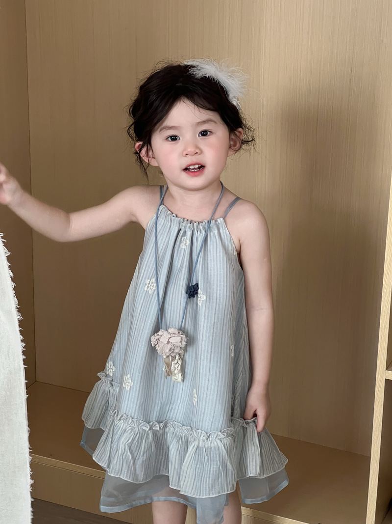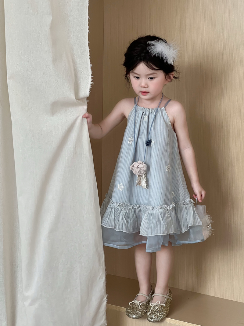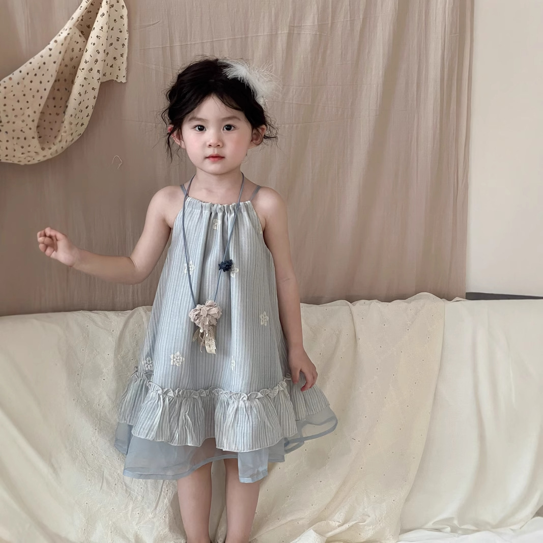 2025 년 여름 새 한국 스타일 소녀의 자수 꽃 공주 슬립 스커트 어린이 목 원피스 아기의 선박 스커트