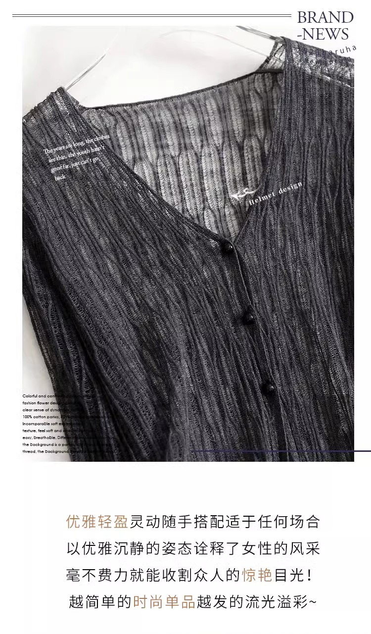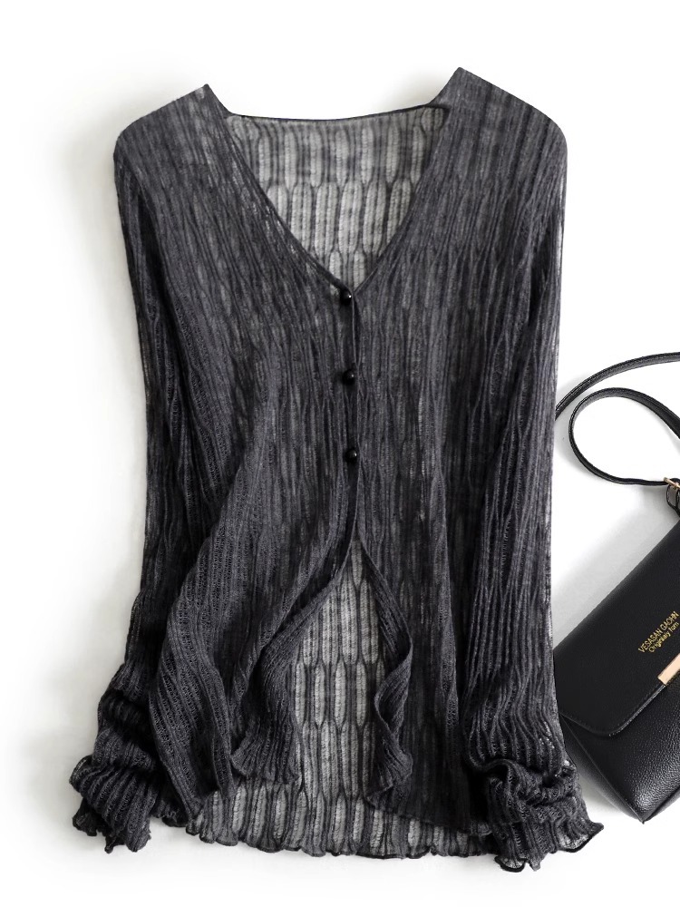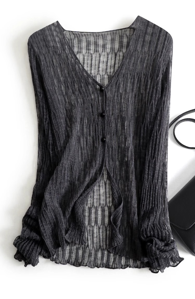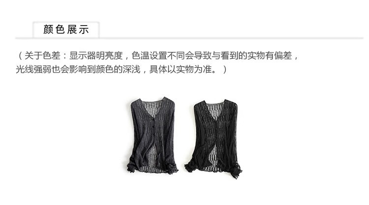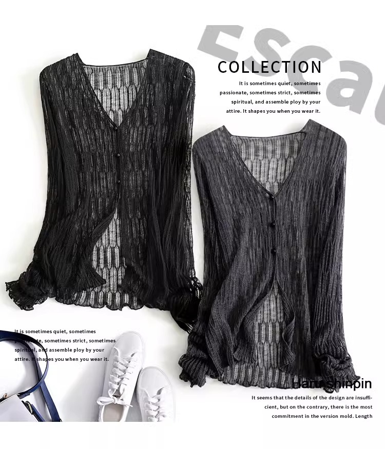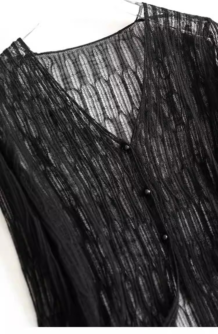 디자인 감각 게으른 스타일 블랙 아이스 실크 V 넥 할로우 아웃 태양 보호 카디건 여성의 여름 얇은 외부 니트 카디건