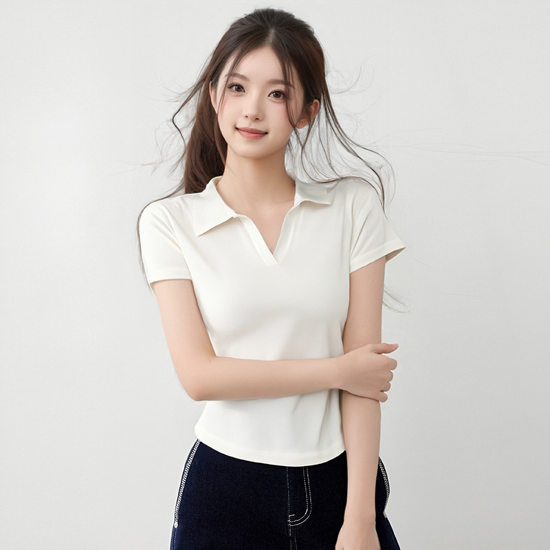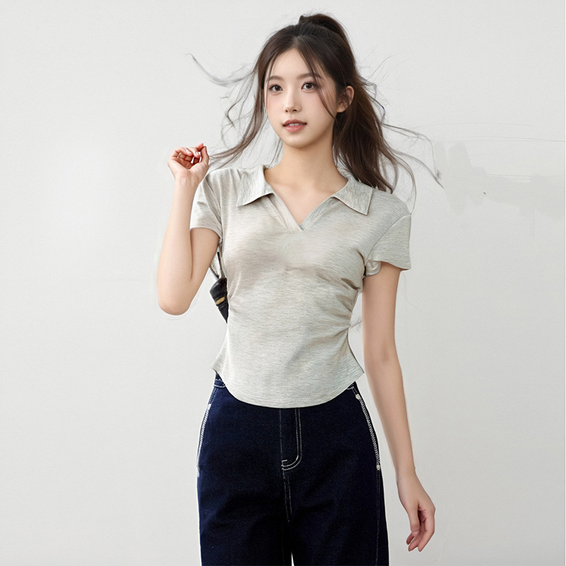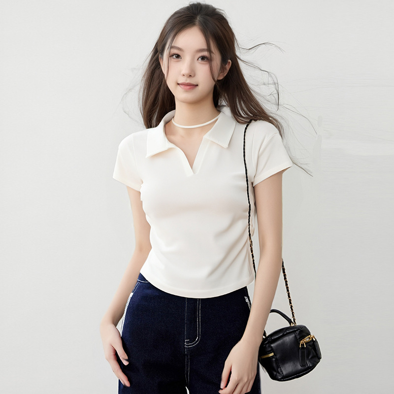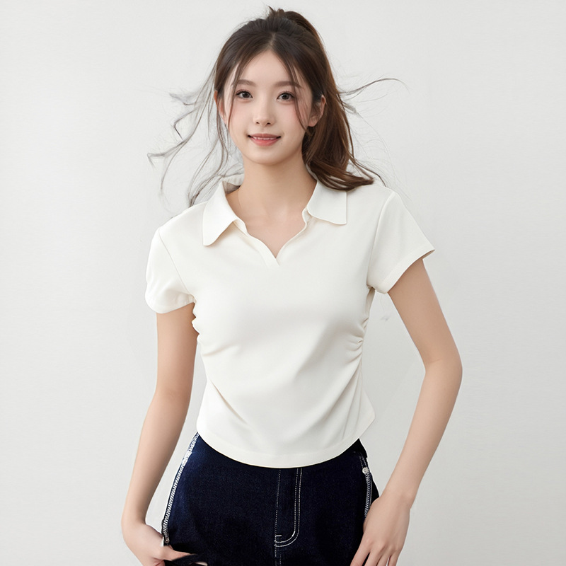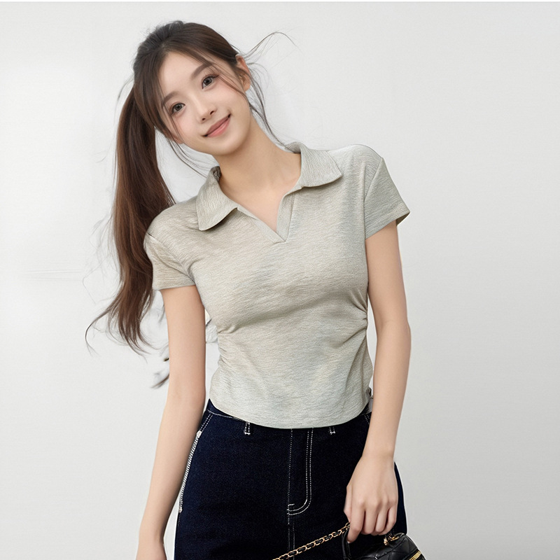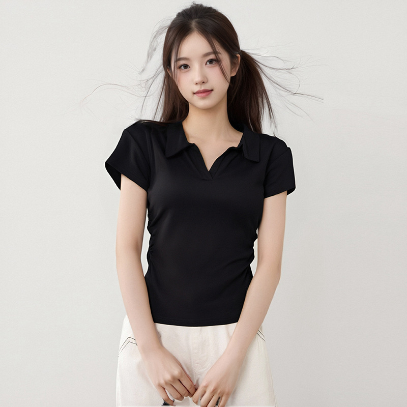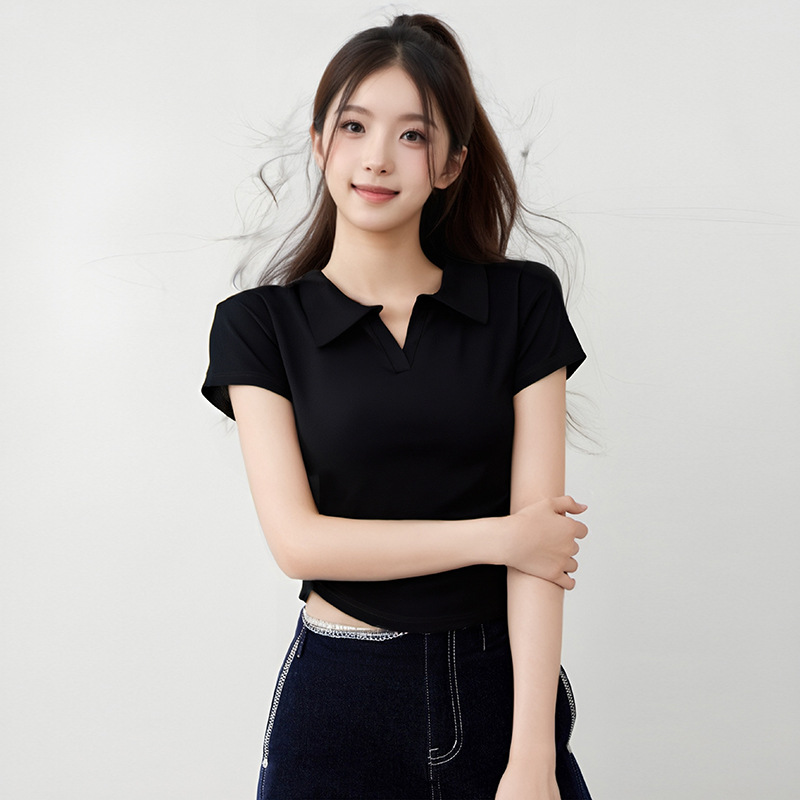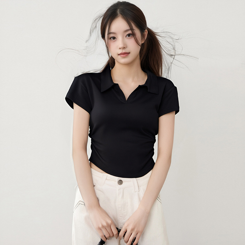 블랙 폴로 칼라 허리 어깨 짧은 소매 티셔츠 여성 봄과 여름 새로운 한국 디자인 짧은 재킷 도매스토어 가기