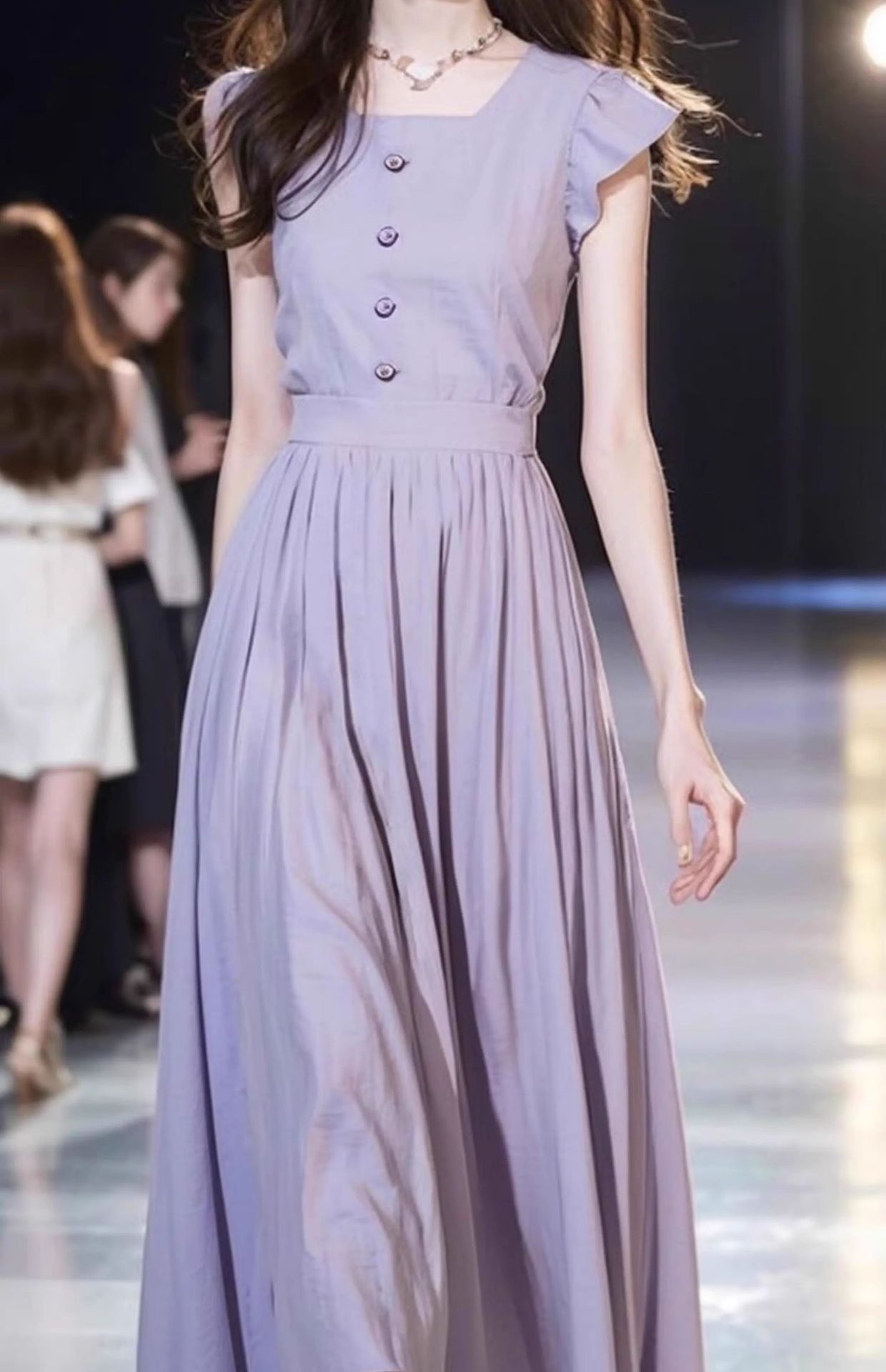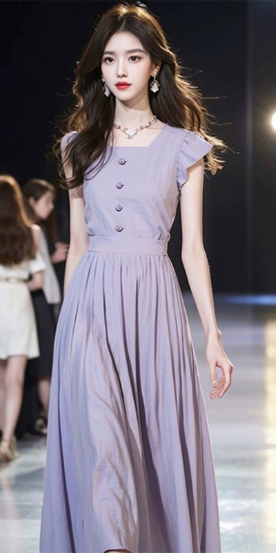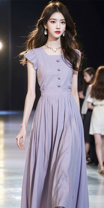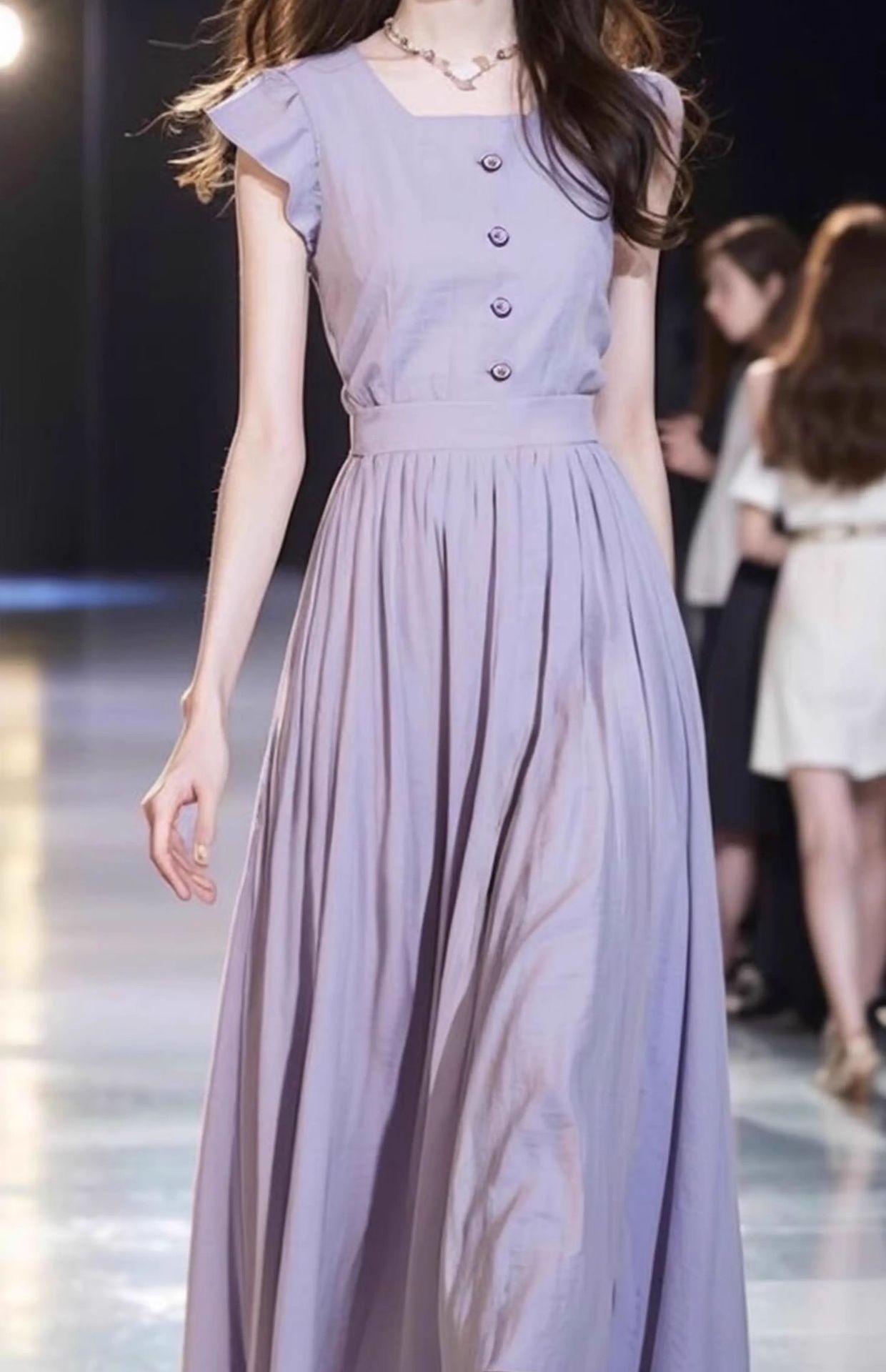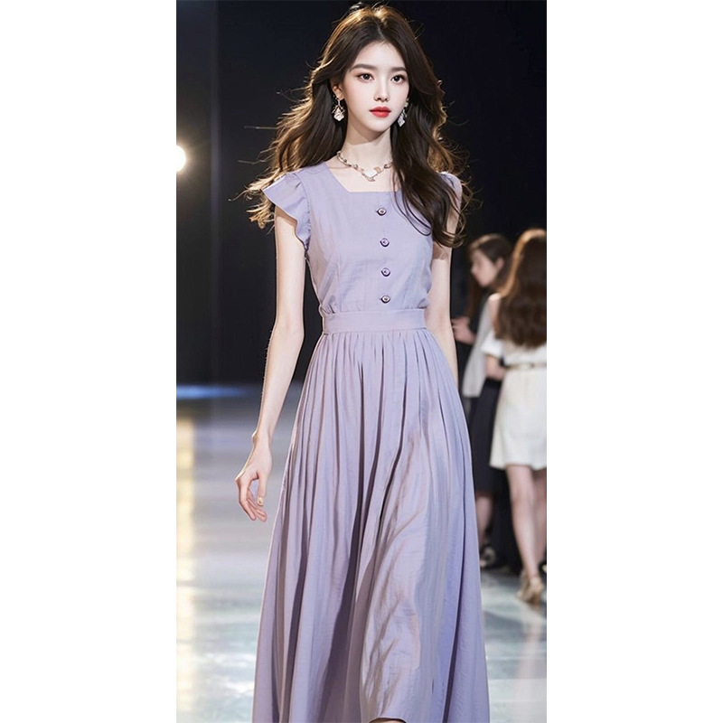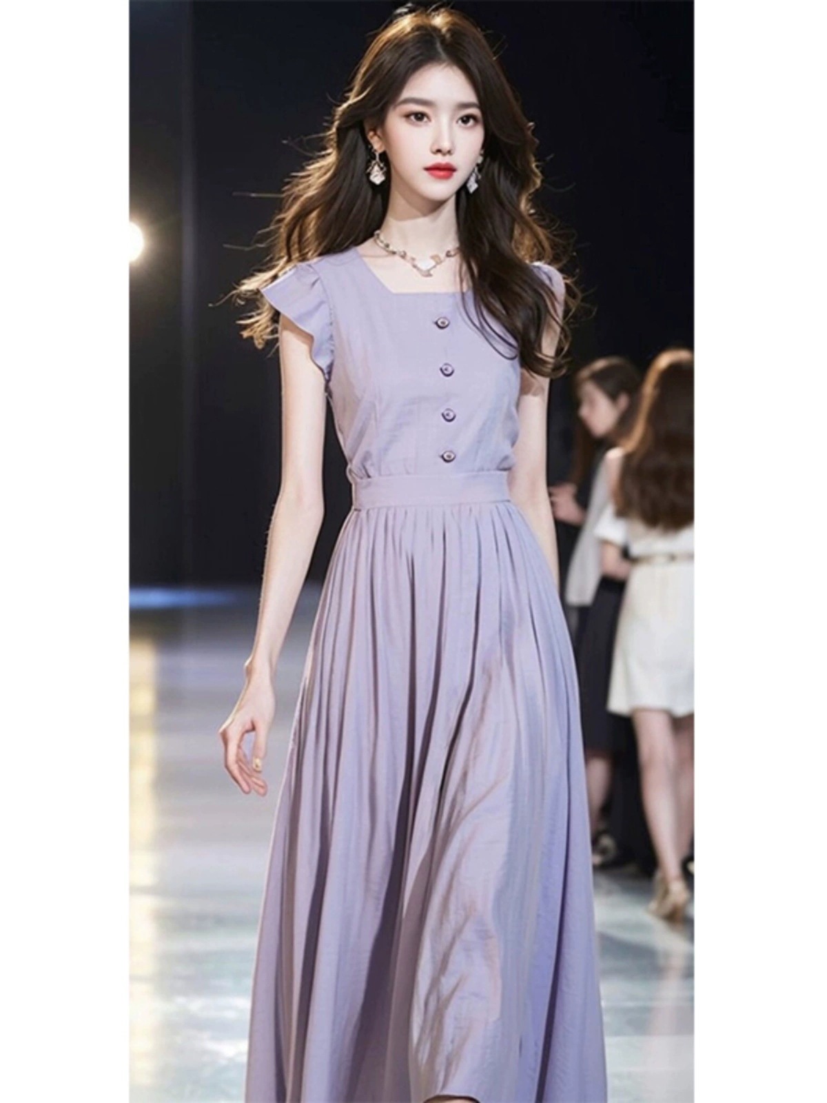 유능한 기질을 입은 배 모양의 인물 여성 민소매 슬림 스커트 여름 새로운 보라색 원피스 허리스토어 가기