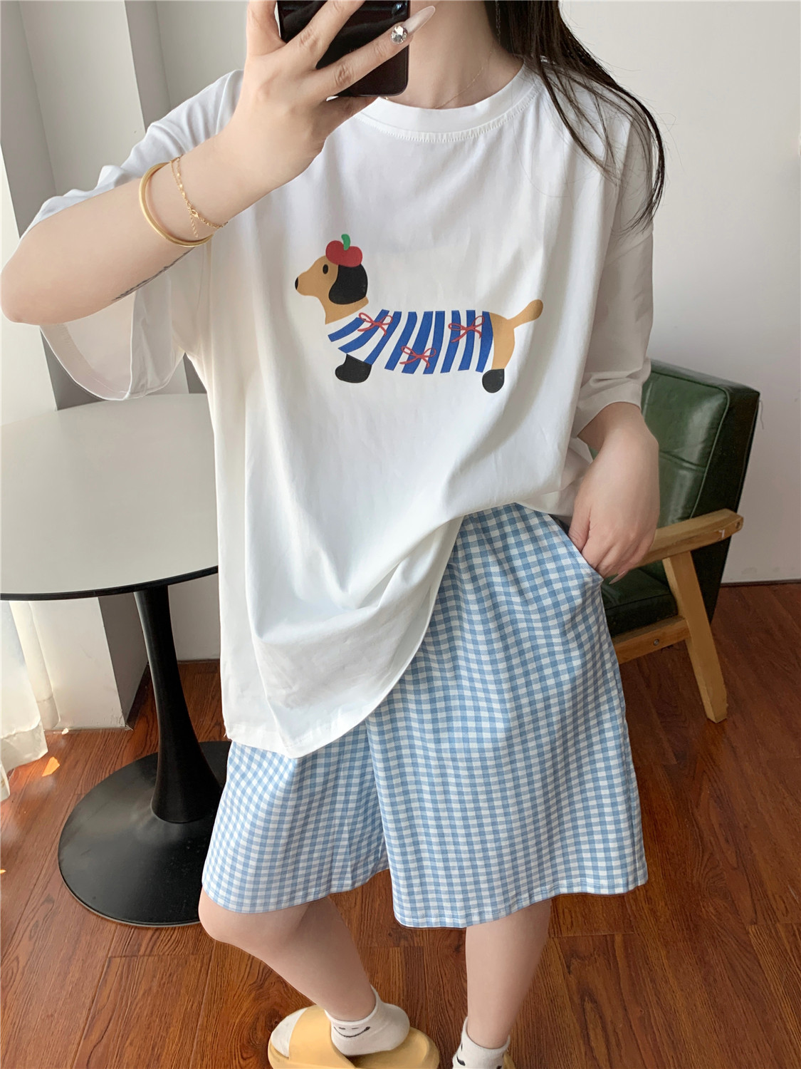 여성을위한 반팔 잠옷 여름 순수 코튼 강아지 프린트 홈웨어 플러스 사이즈 지방 mm 100kg 슬리밍 격자 무늬 반바지 정장스토어 가기