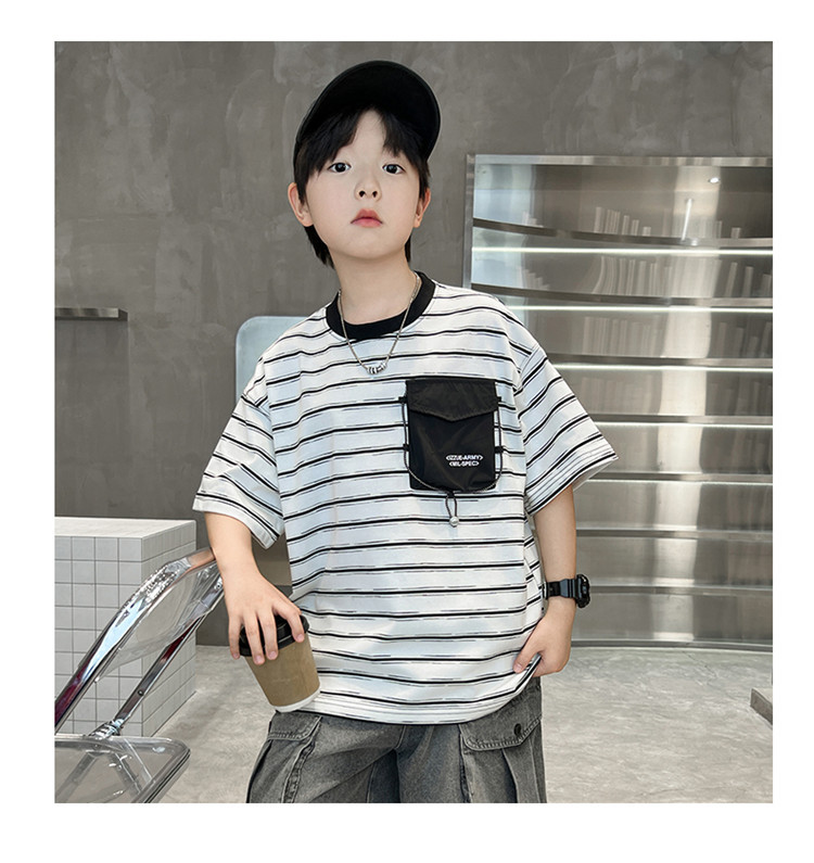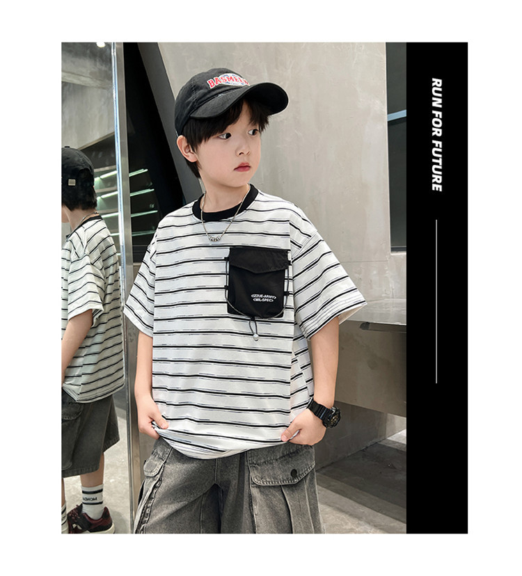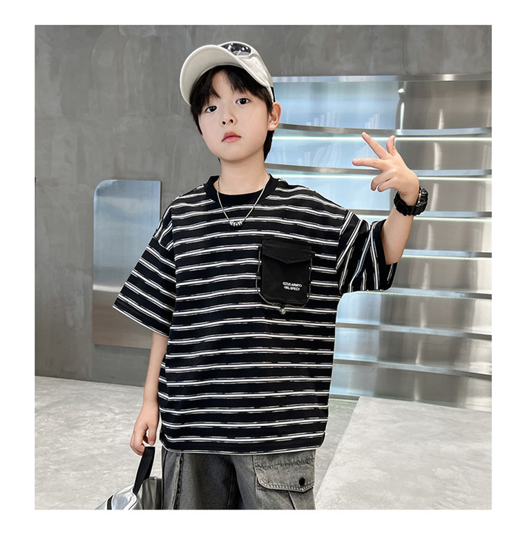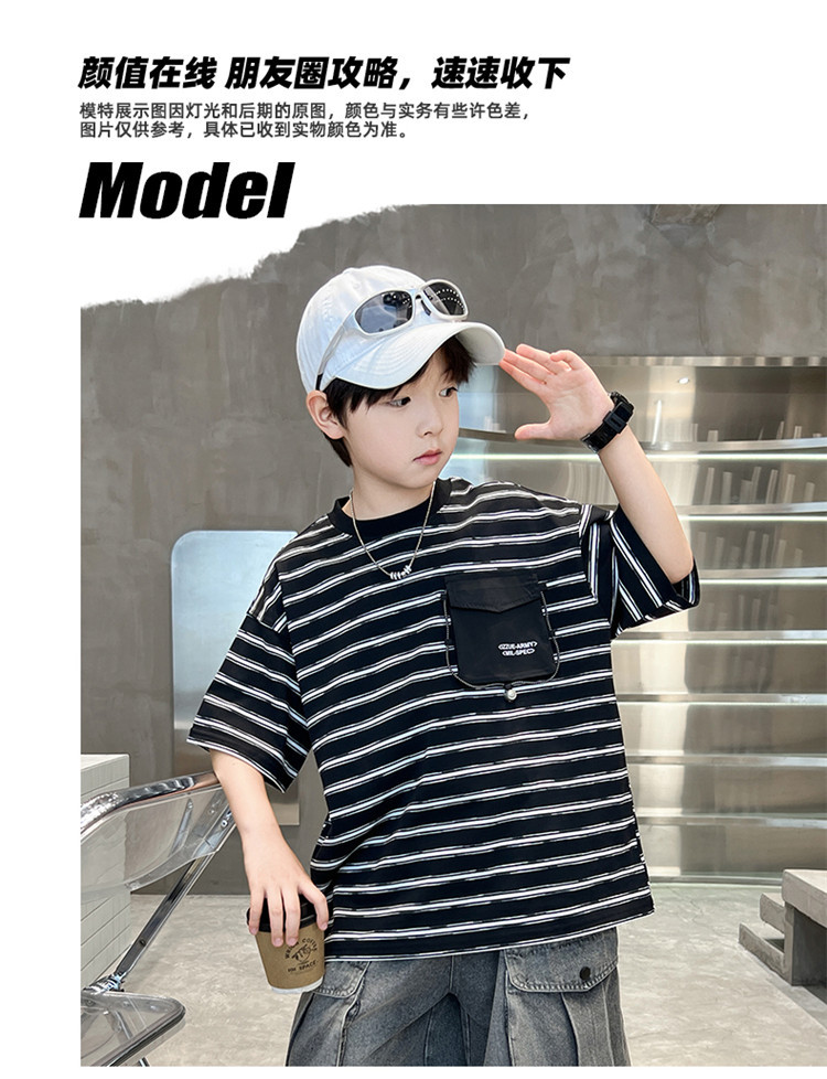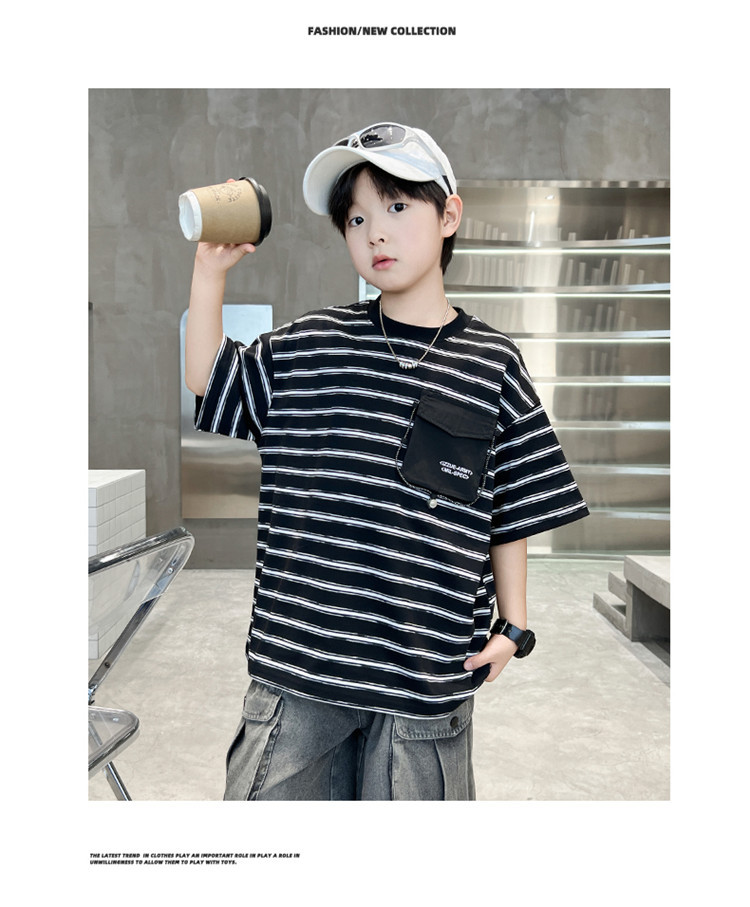소년 티셔츠 2025 새로운 여름 어린이 줄무늬 탑 유행 소년 반소매 중년 어린이 핫 여름 티셔츠스토어 가기