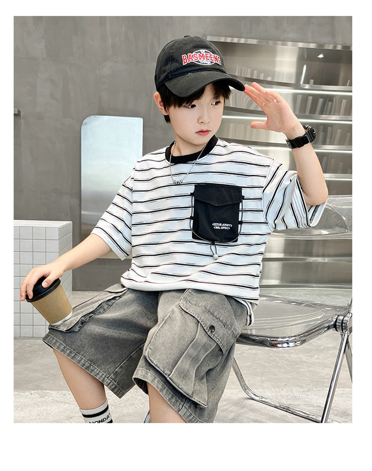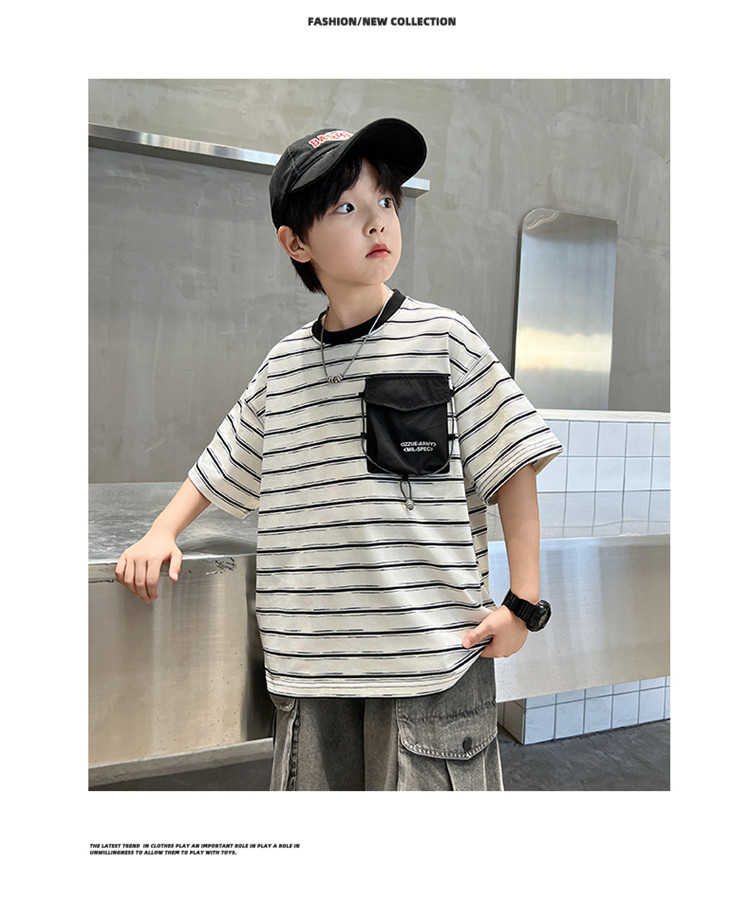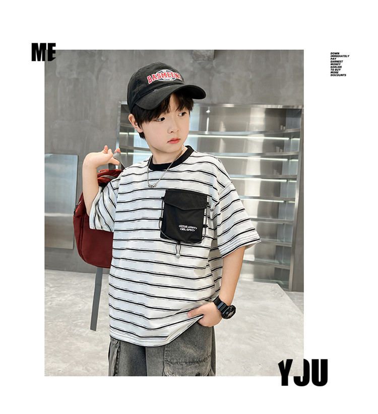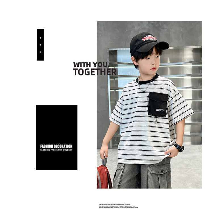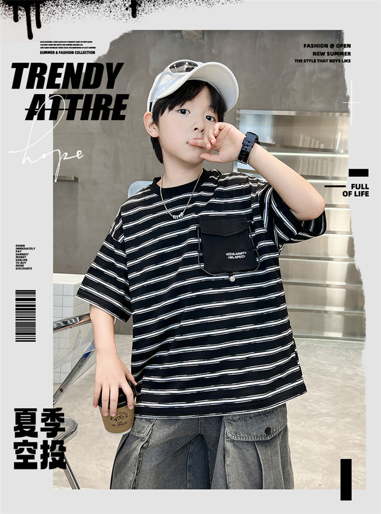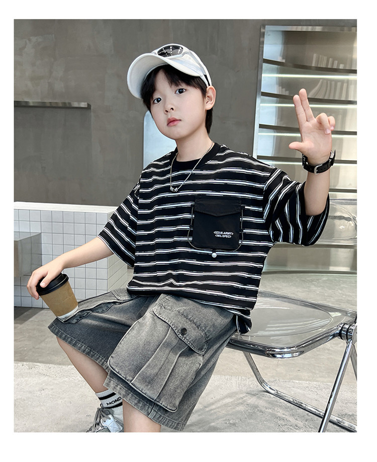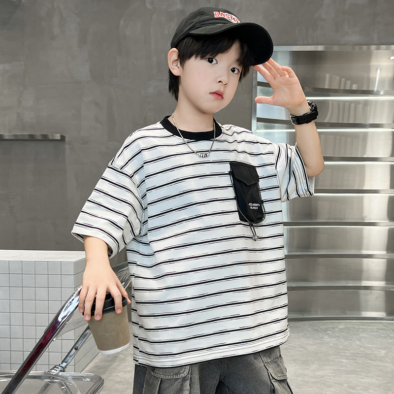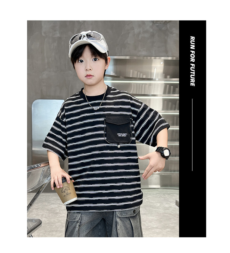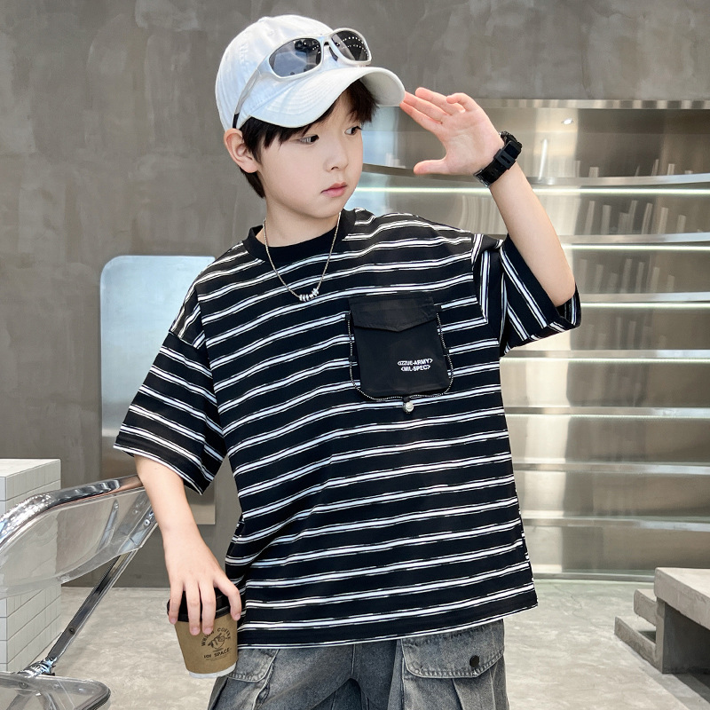 소년 티셔츠 2025 새로운 여름 어린이 줄무늬 탑 유행 소년 반소매 중년 어린이 핫 여름 티셔츠