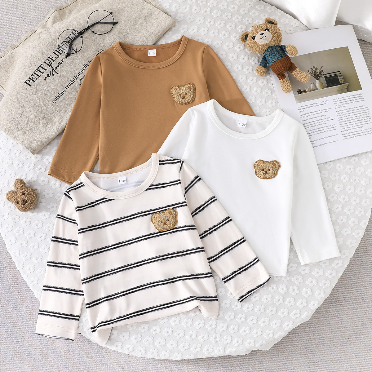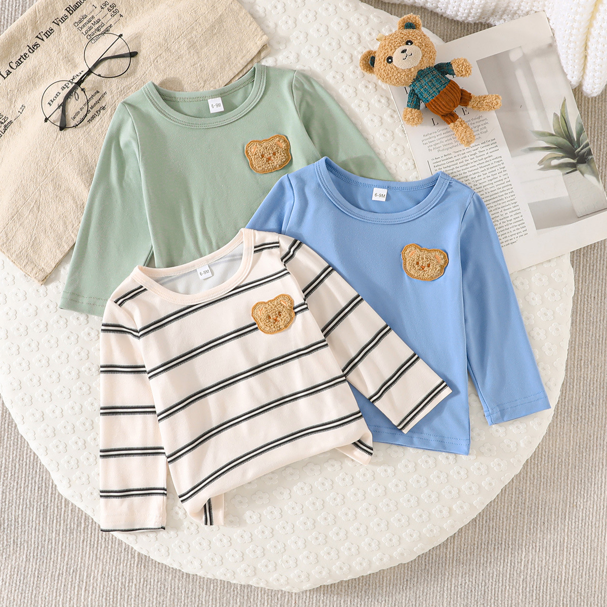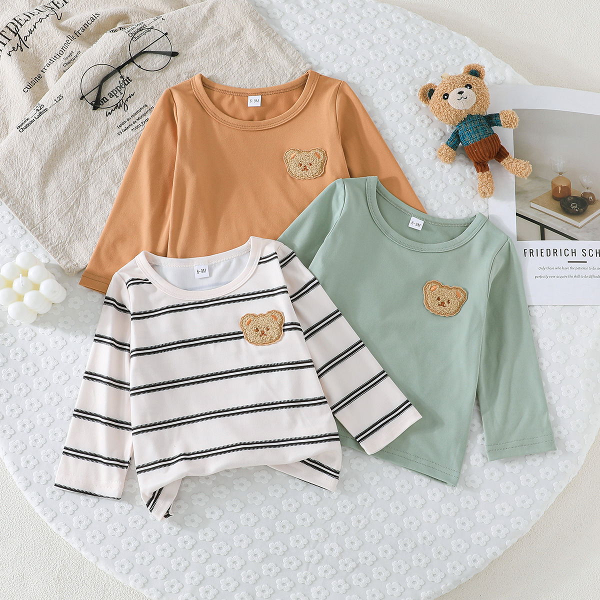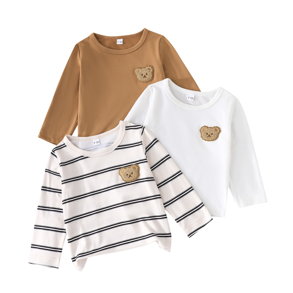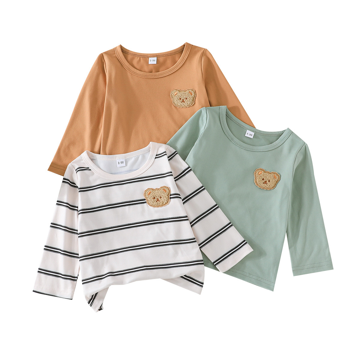 남아용 긴팔 라운드넥 티셔츠 3종 세트 고급 곰 자수 아동용 이너웨어 봄 가을 캐주얼 스트라이프 3종 세트