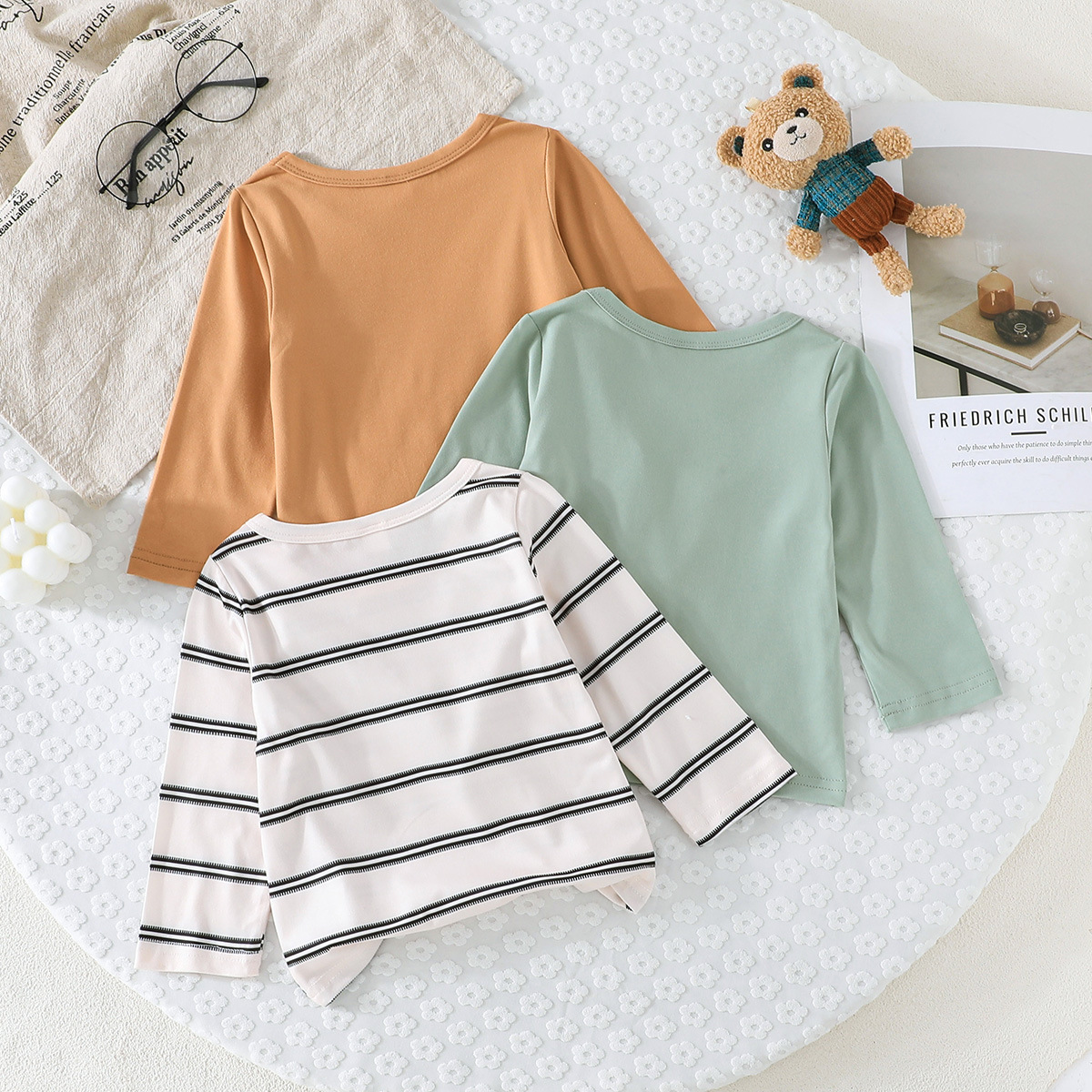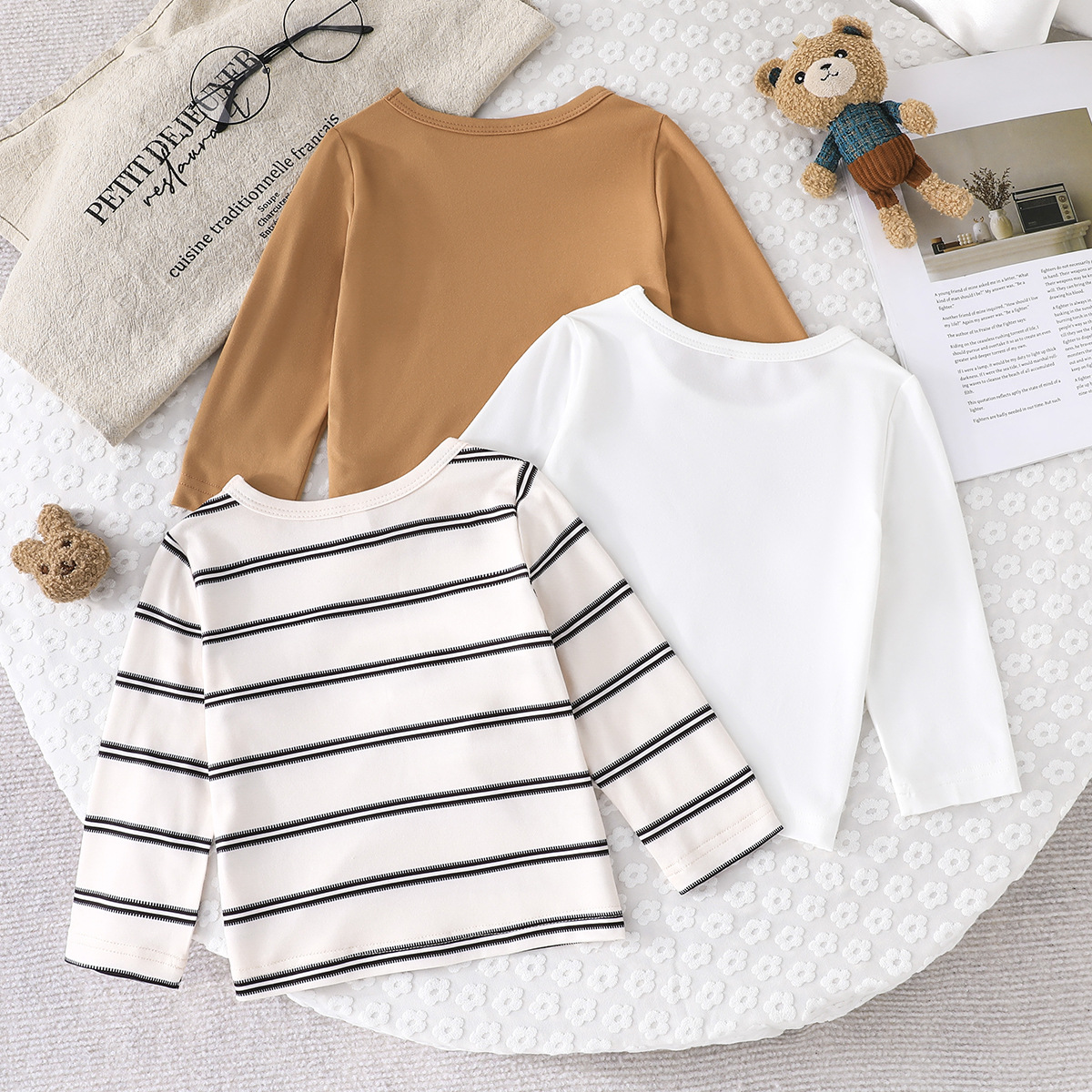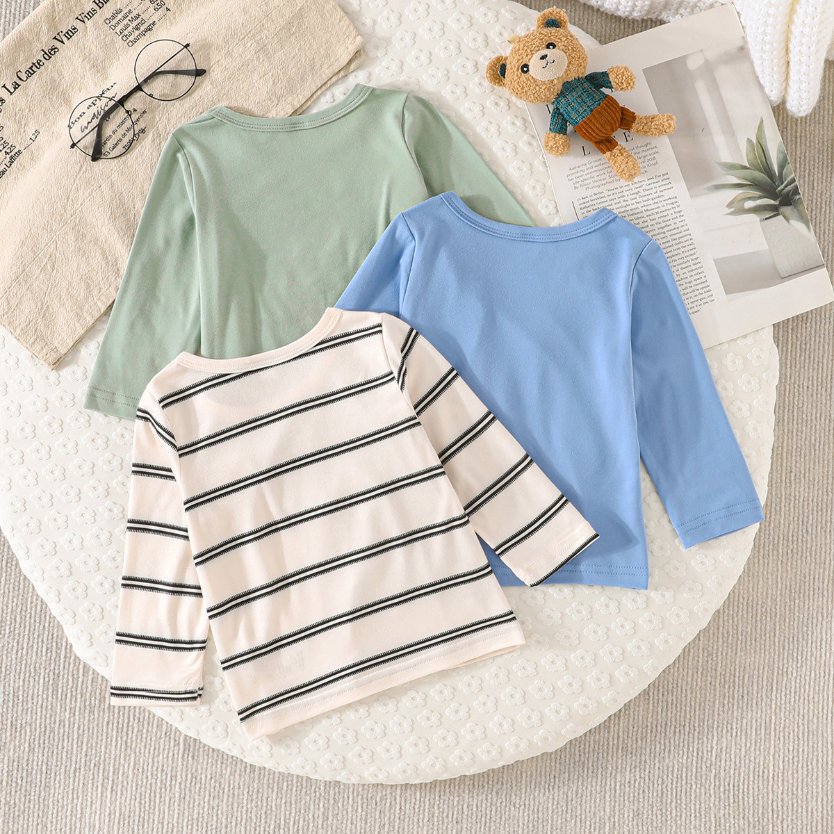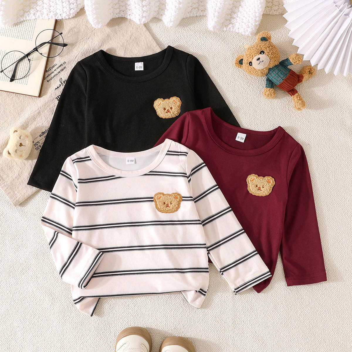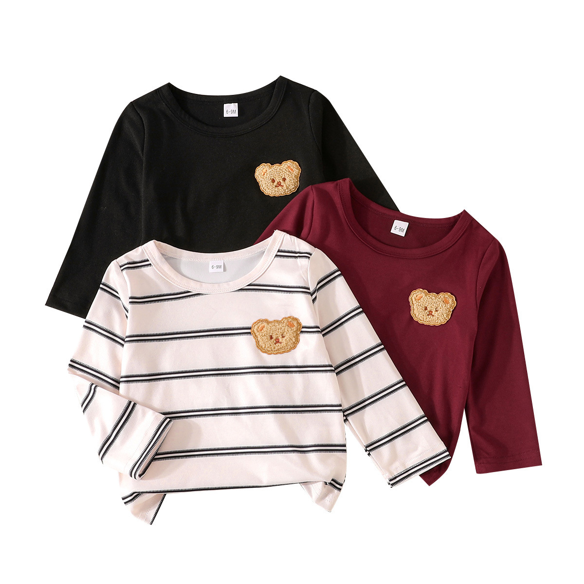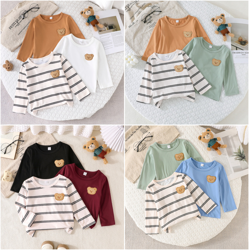 남아용 긴팔 라운드넥 티셔츠 3종 세트 고급 곰 자수 아동용 이너웨어 봄 가을 캐주얼 스트라이프 3종 세트