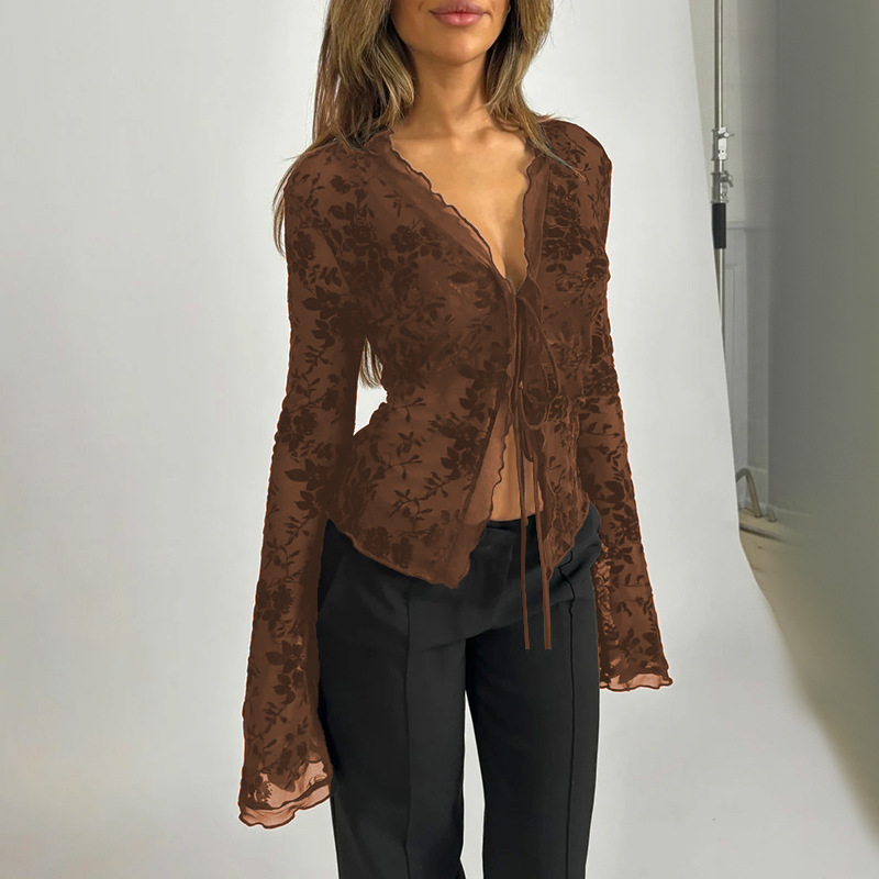 가을 2025 새로운 패션 쉬폰 셔츠 작은 향기 스타일 슬림 프릴 벨 슬리브 탑 여성을위한스토어 가기
