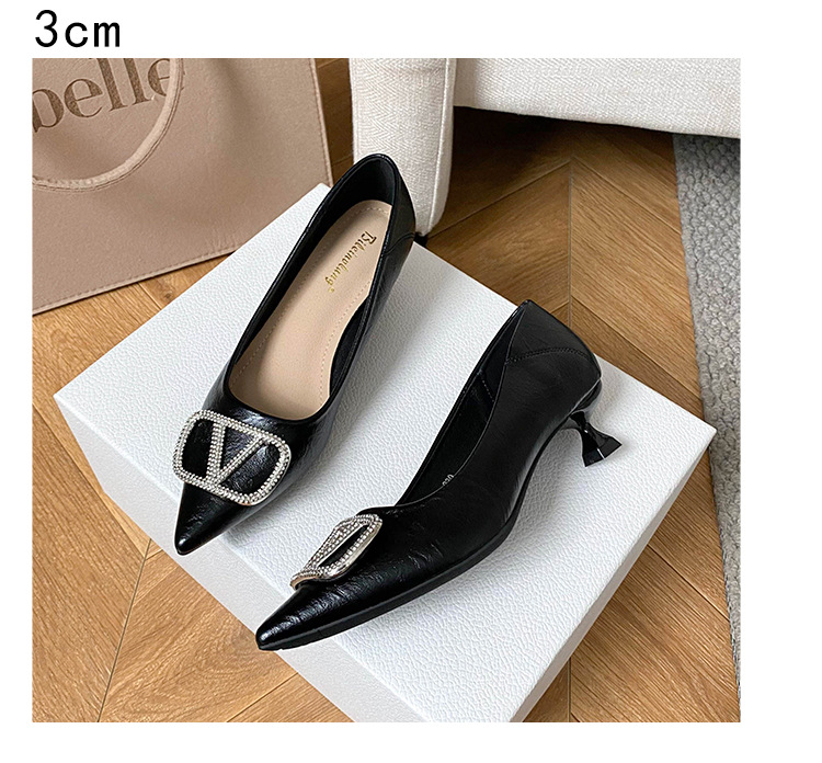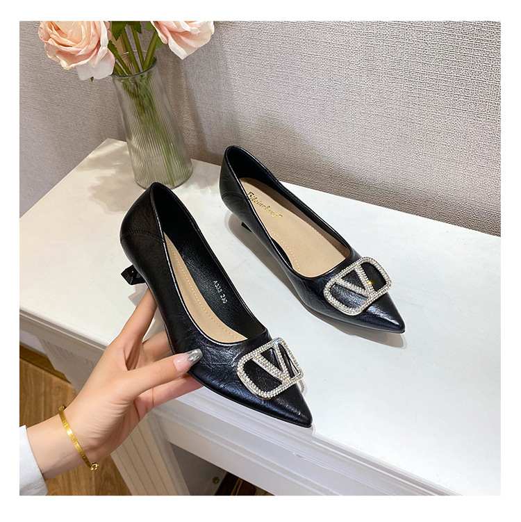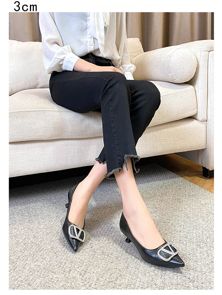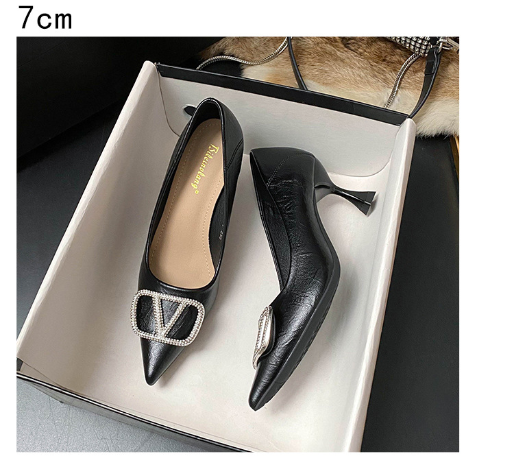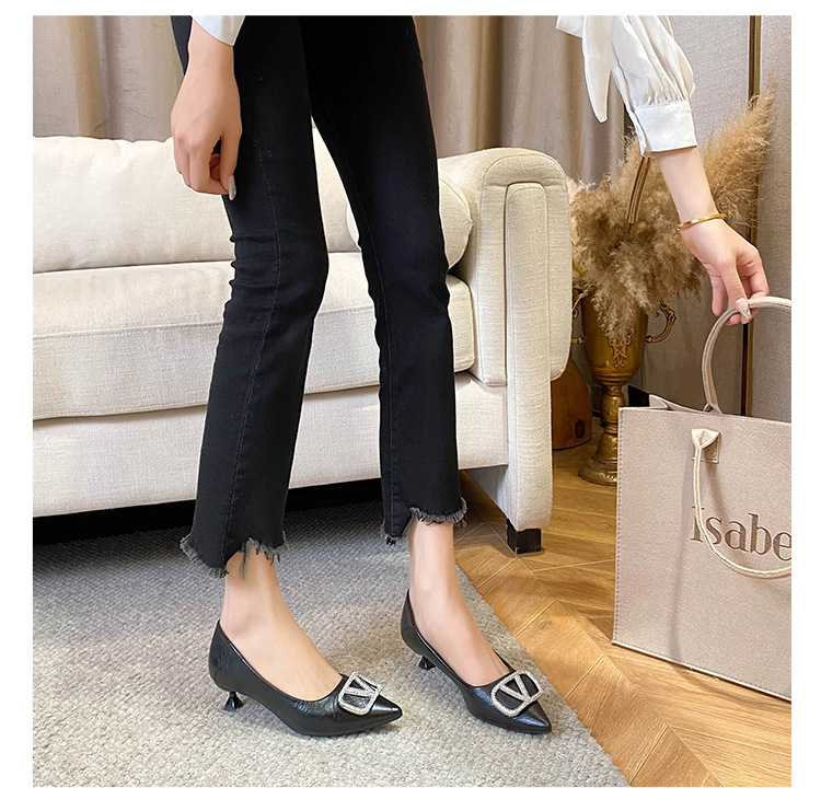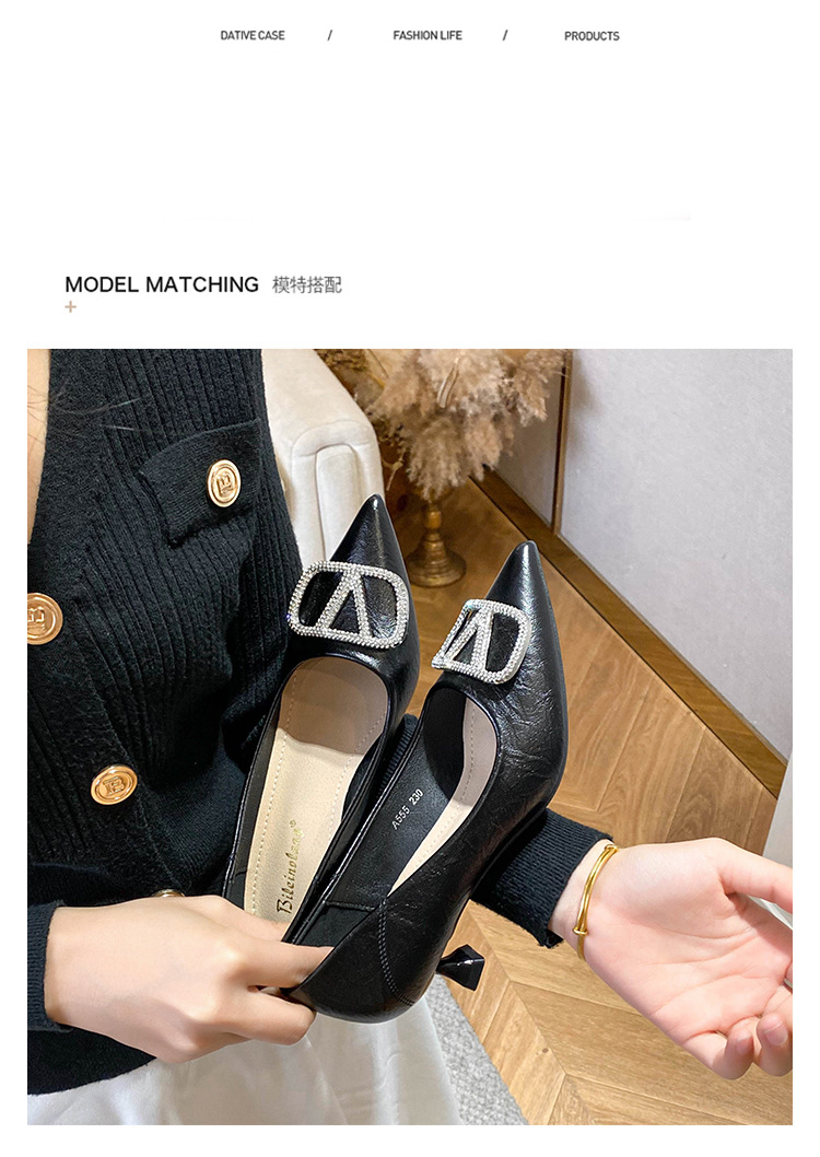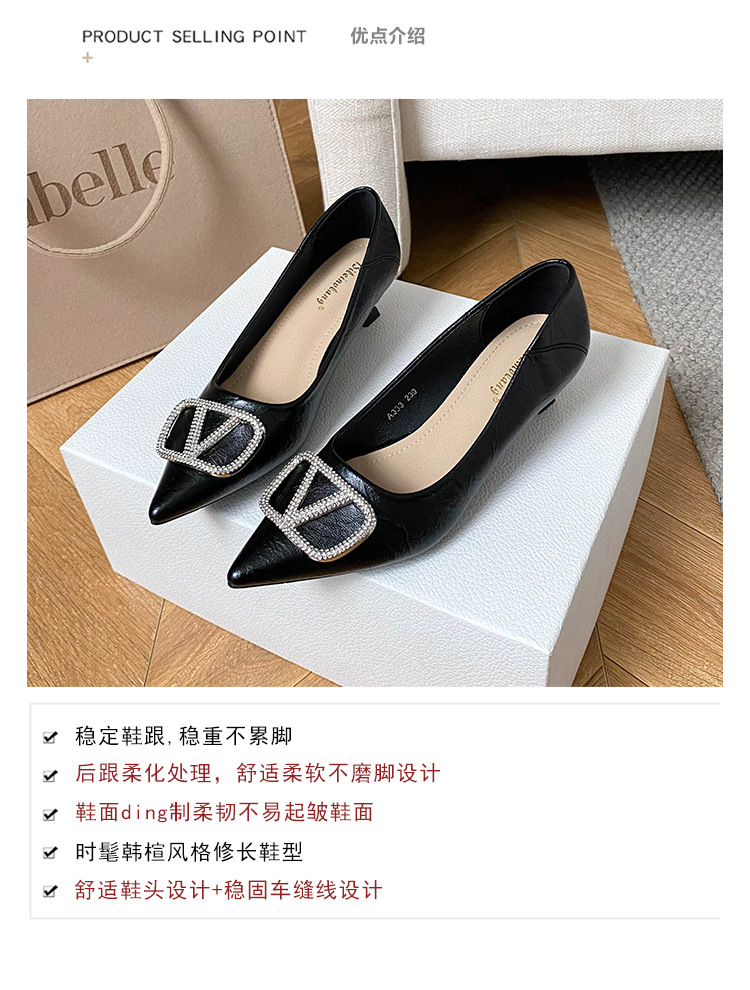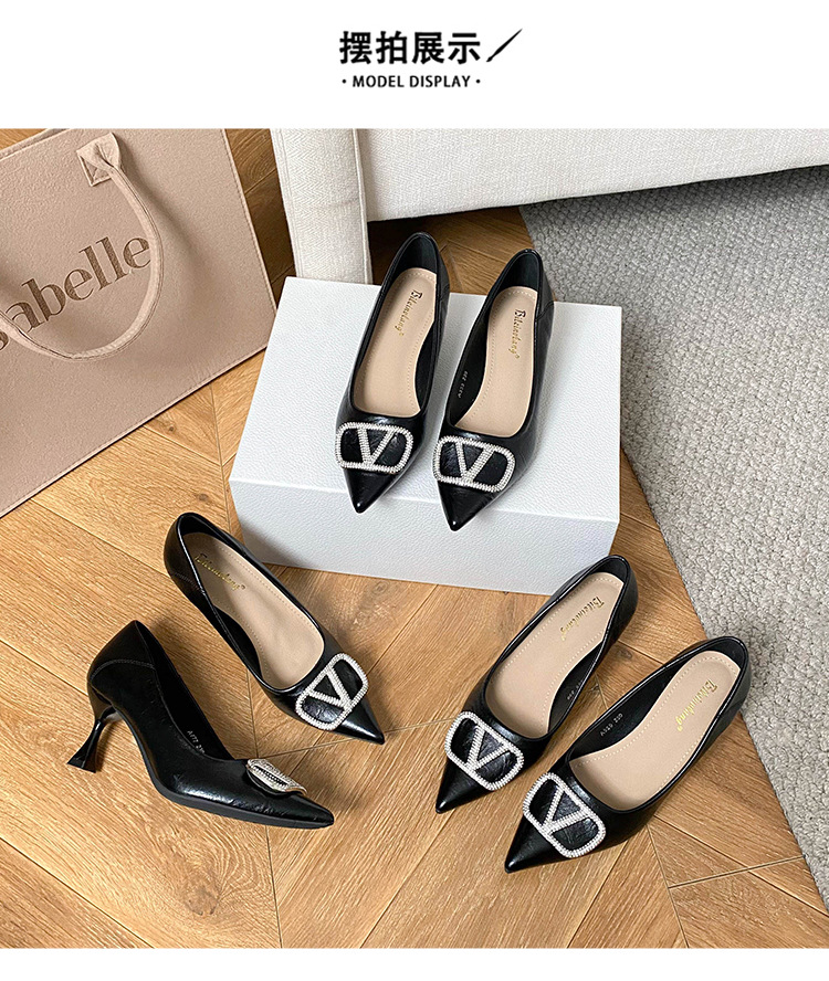 25 봄과 가을 뾰족한 금속 V-버클 특허 가죽 누드 플랫 얕은 입 연예인 스타일 내부 높이 증가 스몰 사이즈 싱글 신발 프리미엄 감각