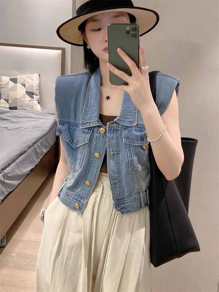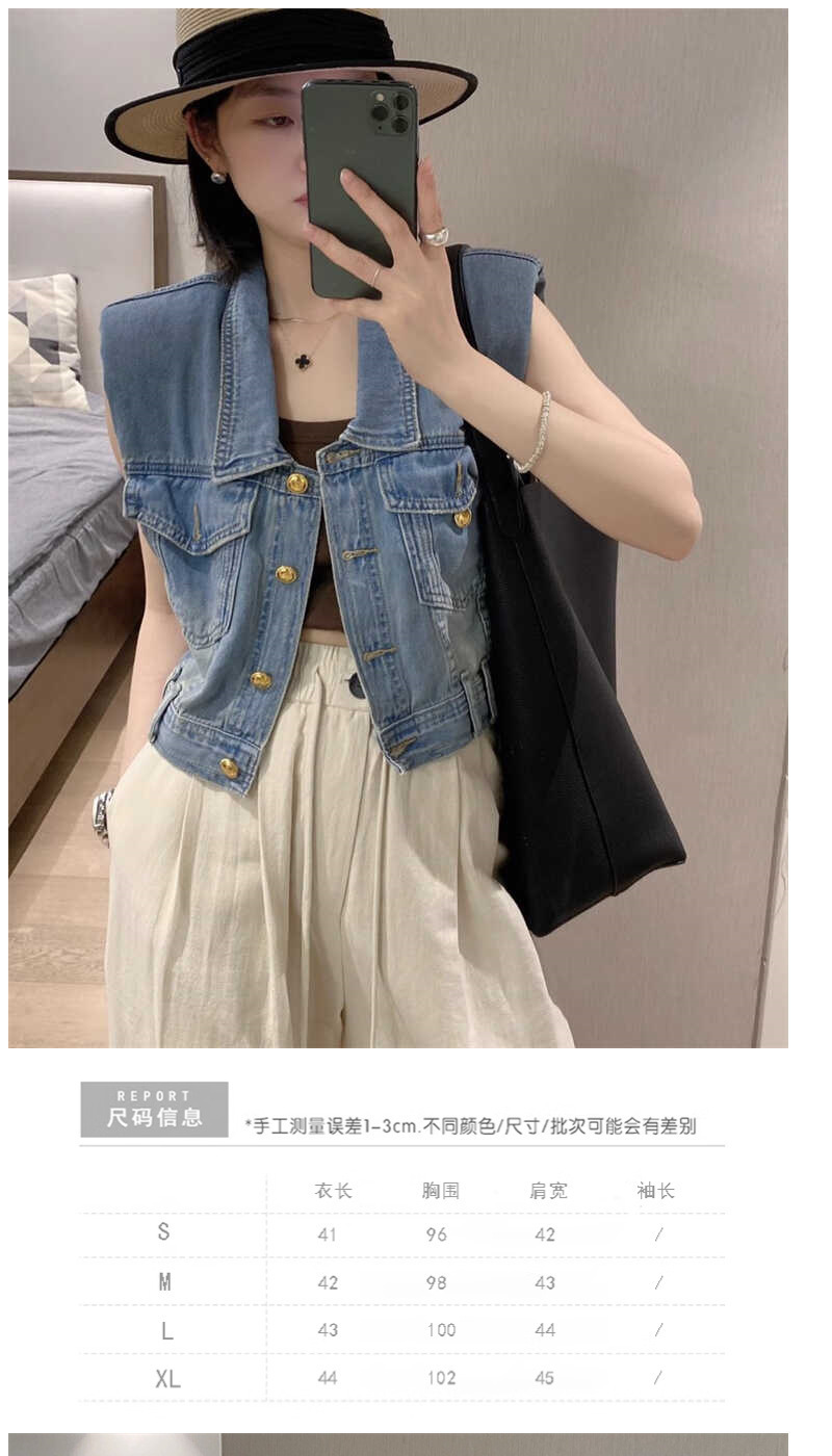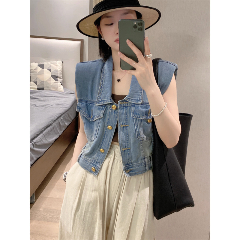 홍콩 스타일 빈티지 세련된 데님 조끼 여성 여름 하이 엔드 쇼트 외부 소매 자켓 웨이스트 코트 탑