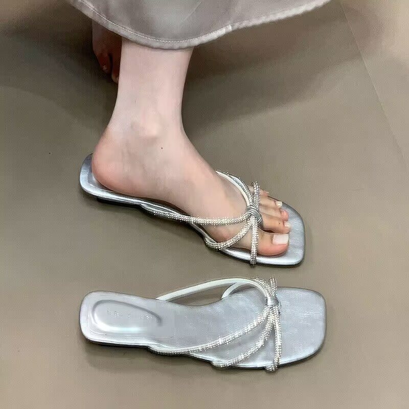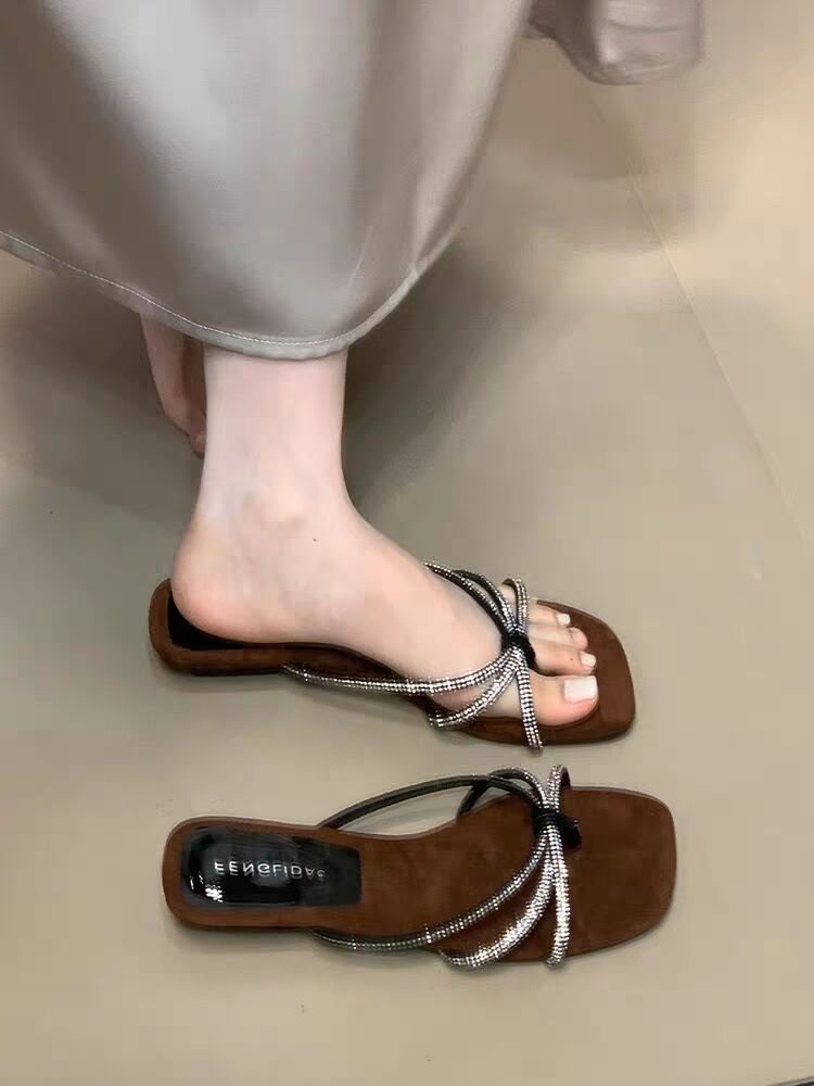 스퀘어 헤드 라인스톤 슬리퍼 여성용 아우터 2025 여름 새로운 프랑스 스타일 페어리 스타일 원통 플랫 플립 온 샌들