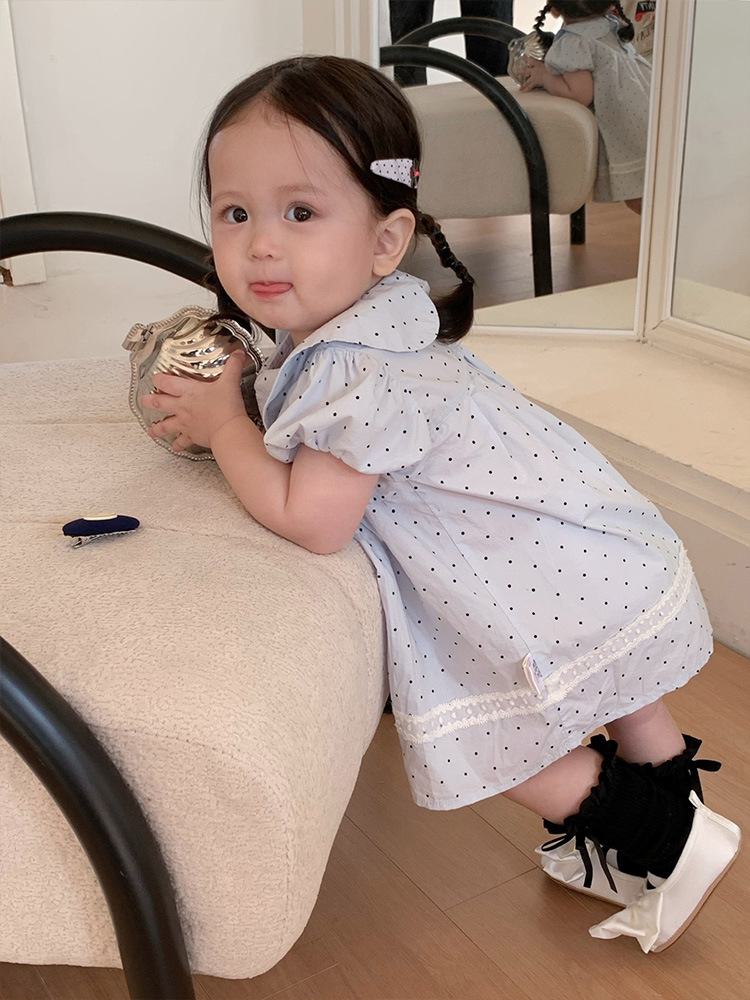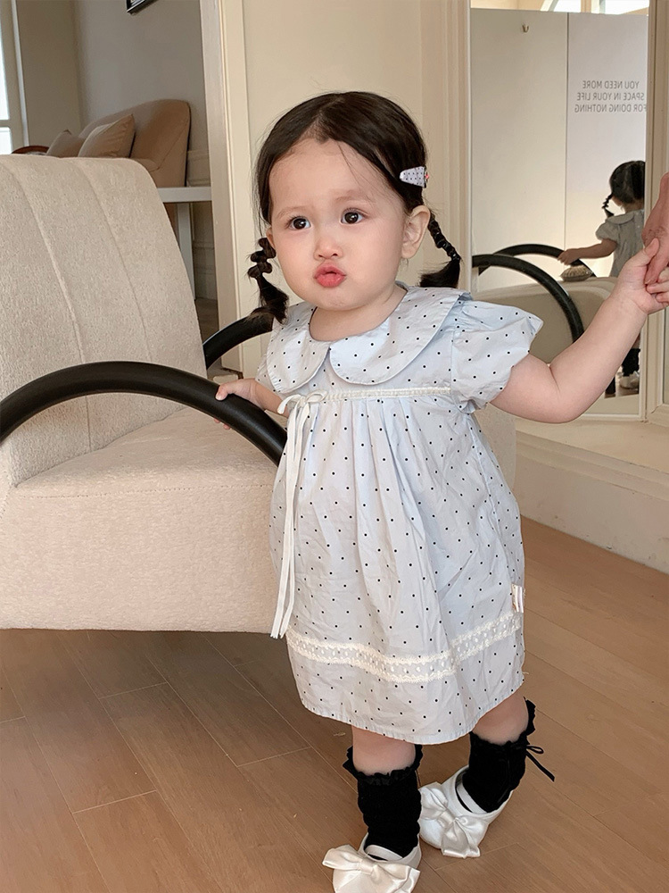 재고 XQ259496 소녀 원피스 2025 여름 새로운 웨이브 도트 넥타이 나비 버블 슬리브 원피스