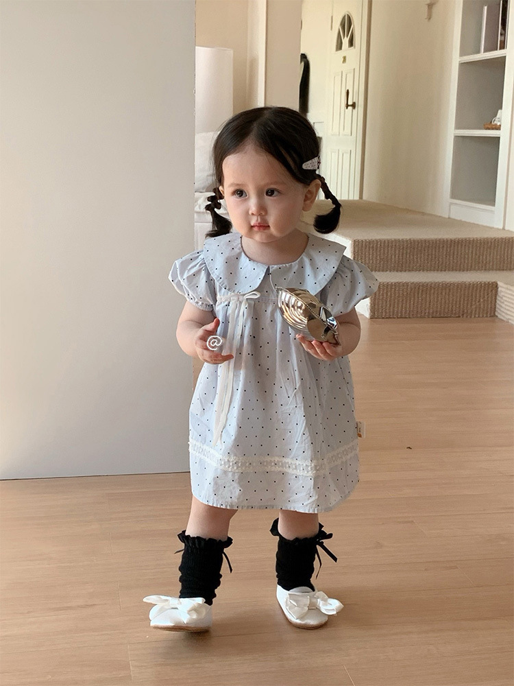 재고 XQ259496 소녀 원피스 2025 여름 새로운 웨이브 도트 넥타이 나비 버블 슬리브 원피스스토어 가기