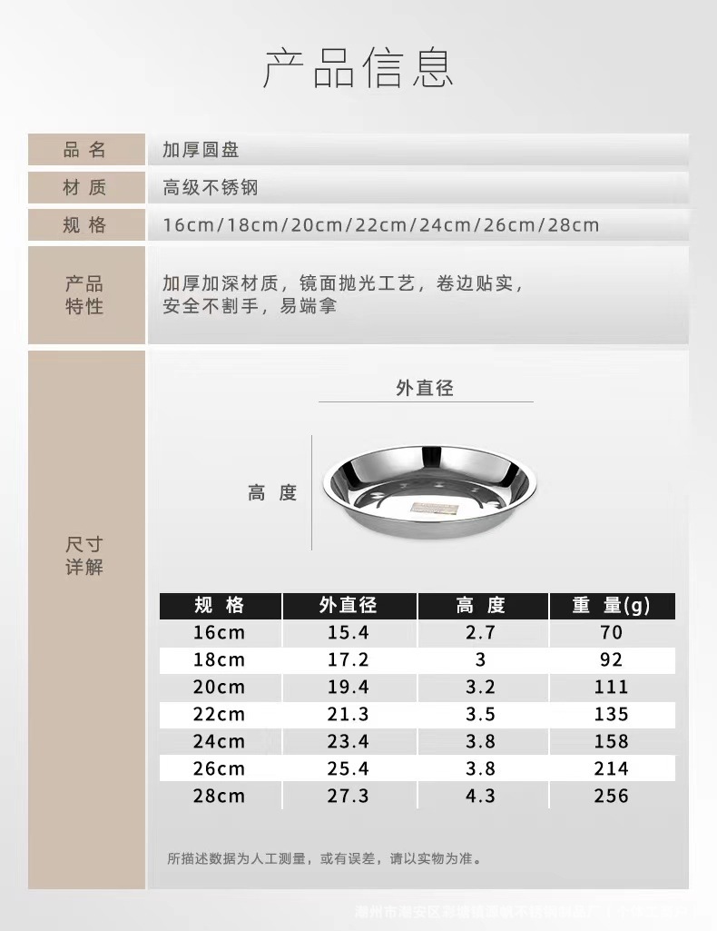 스테인리스 원형 접시 가정용 식기 호텔 원형 접시 주방 트레이 도매 간식 중국풍