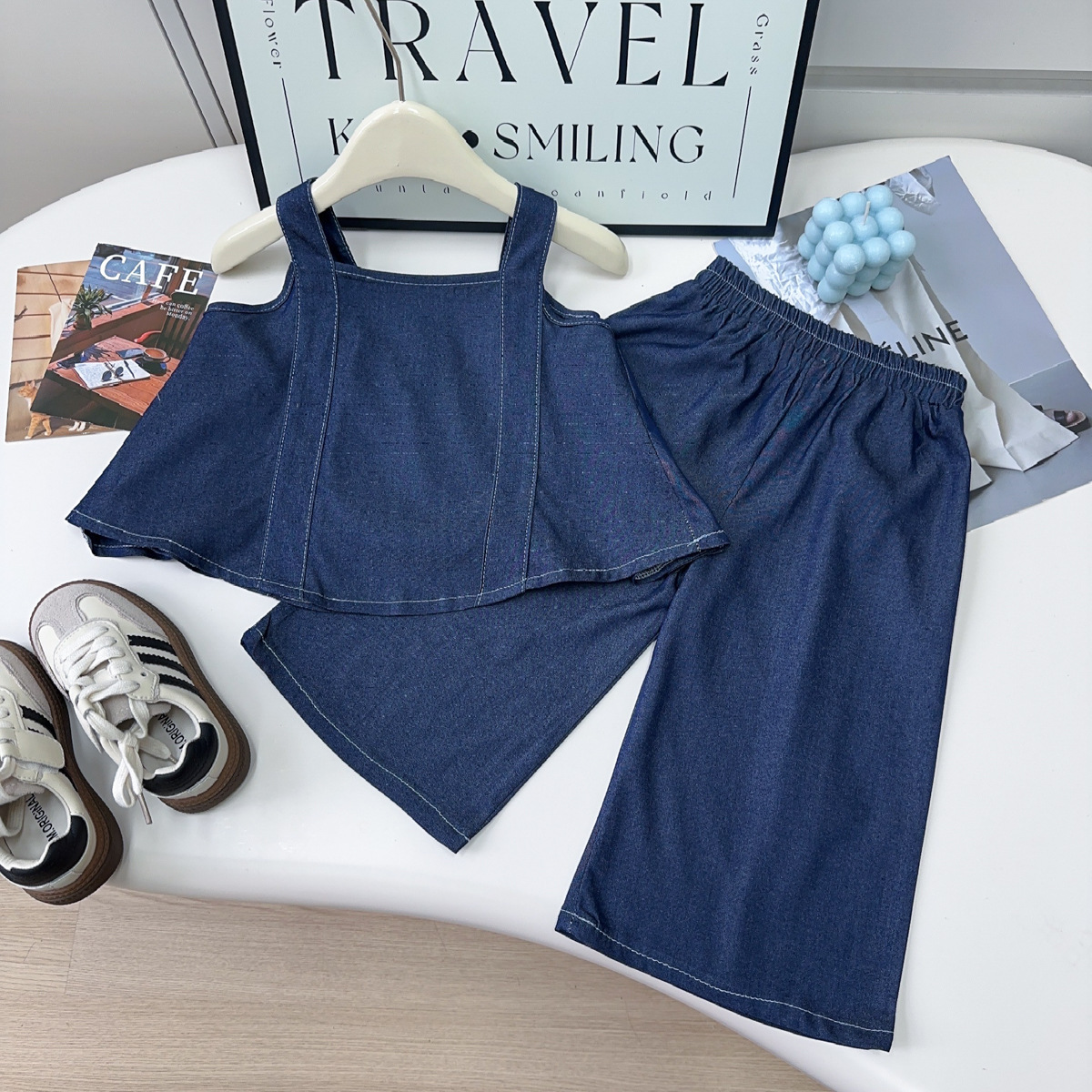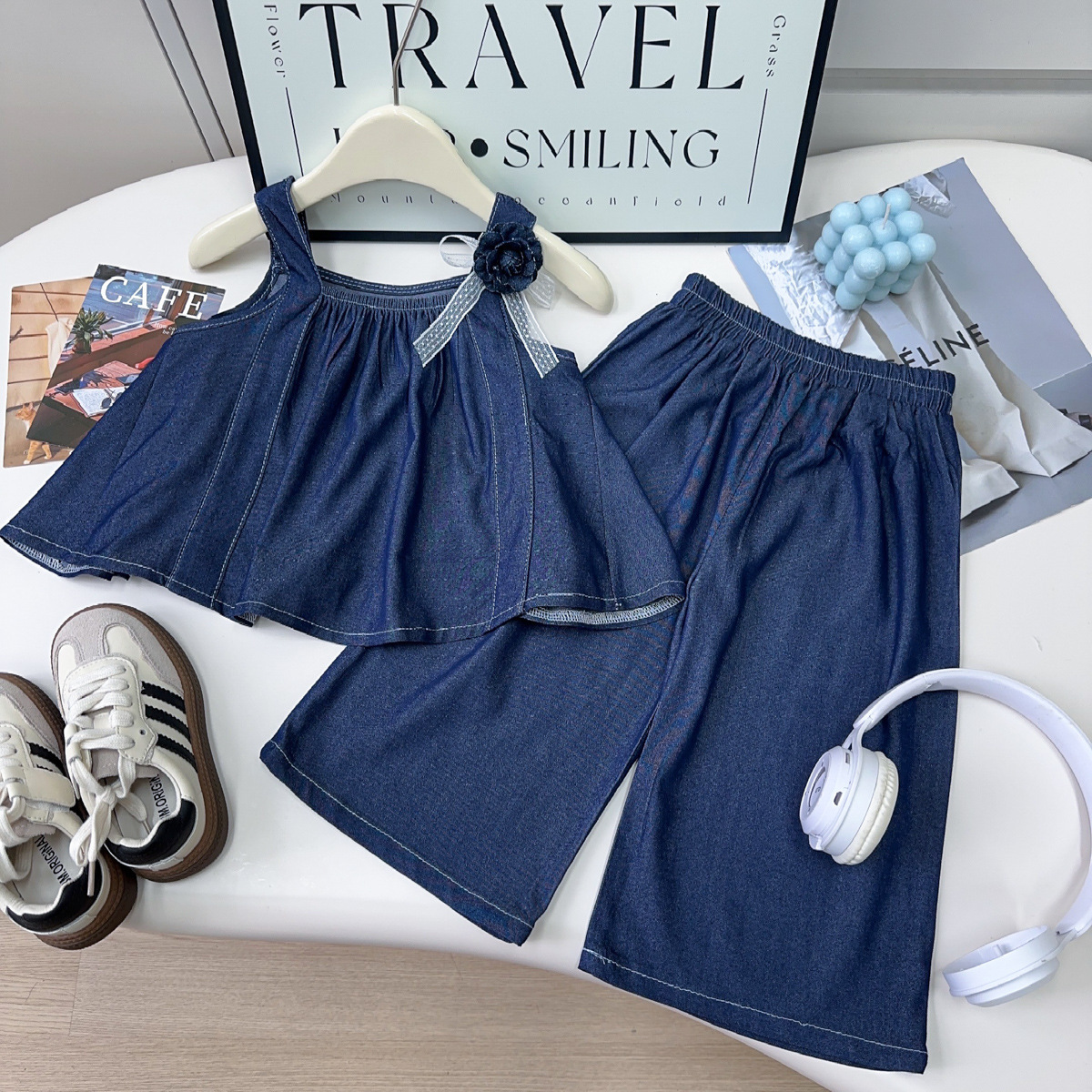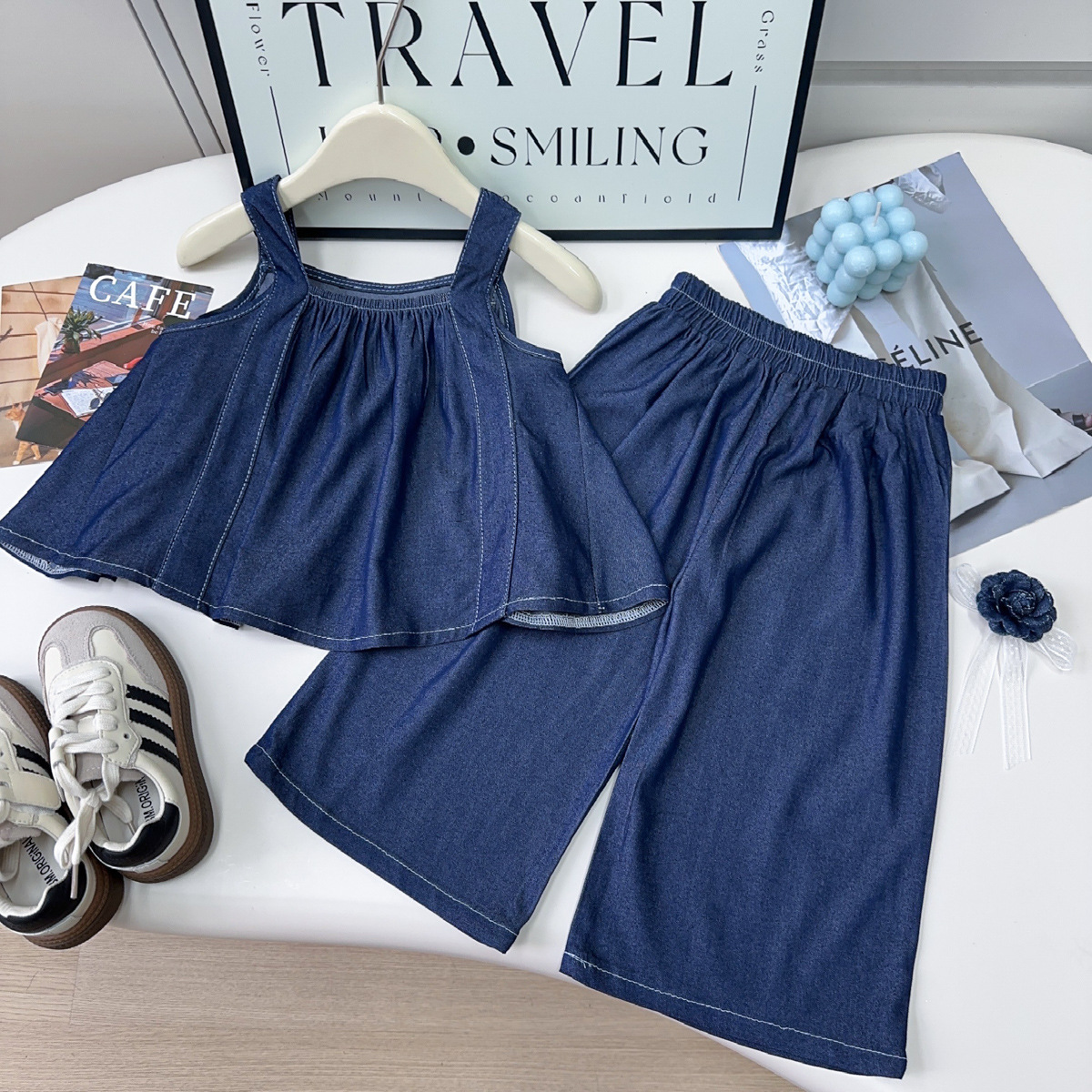 여자 데님 정장 여름 새 아기 소녀 달콤한 데님 서스펜더 스커트 와이드 레그 팬츠 투피스 세트스토어 가기