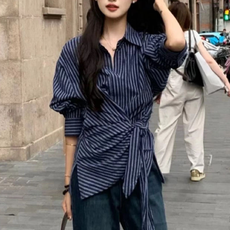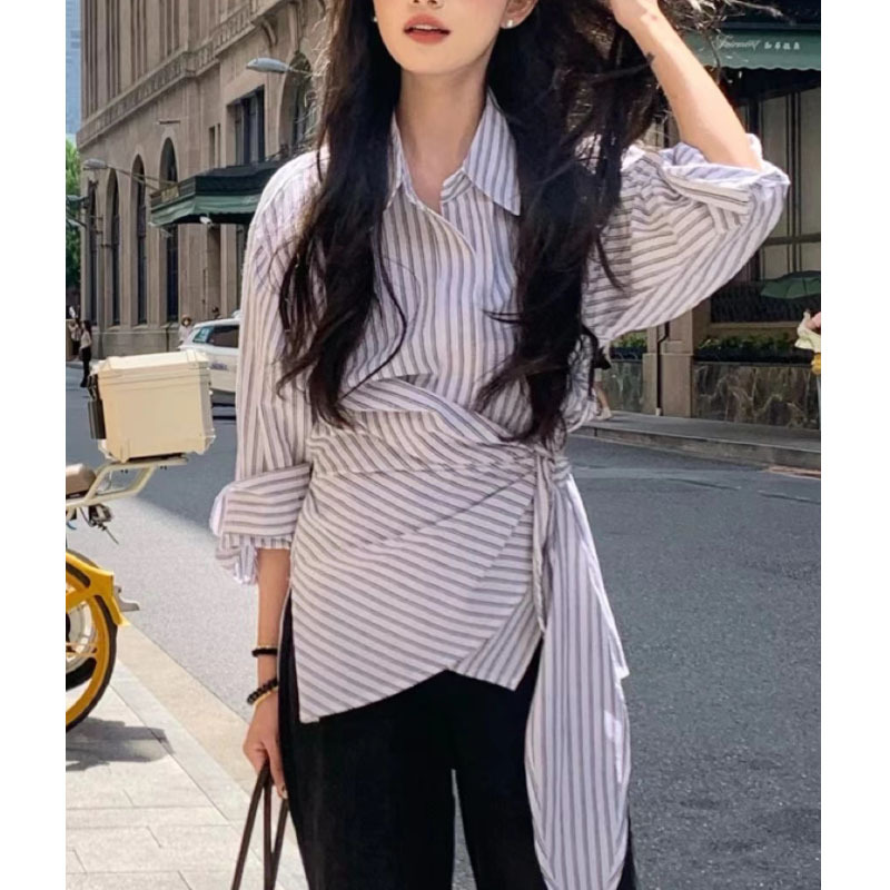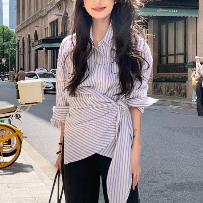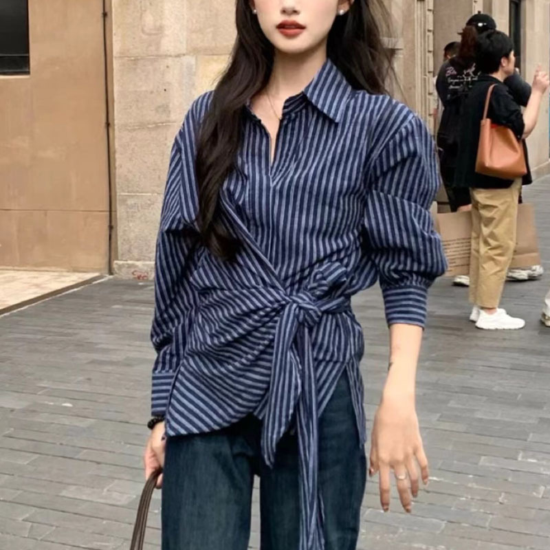 한국식 복고풍 디자인 불규칙 웨이스트 레이스 업 스트라이프 셔츠 여성용 긴팔 셔츠 유행 우아한 탑 트렌디스토어 가기
