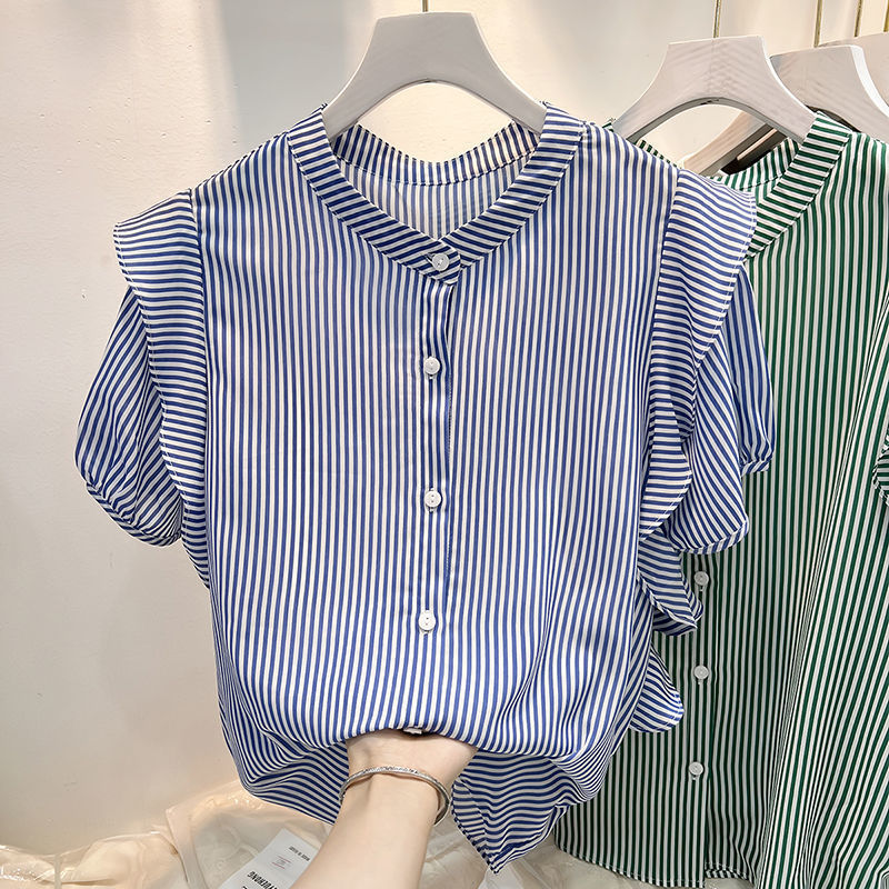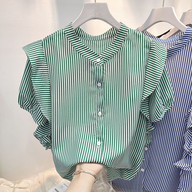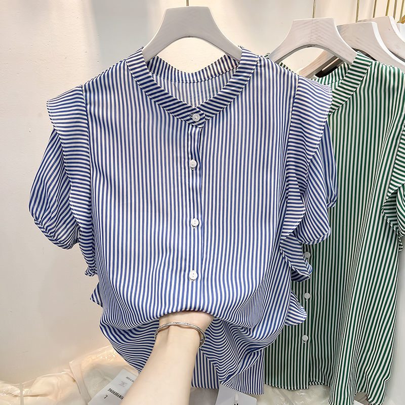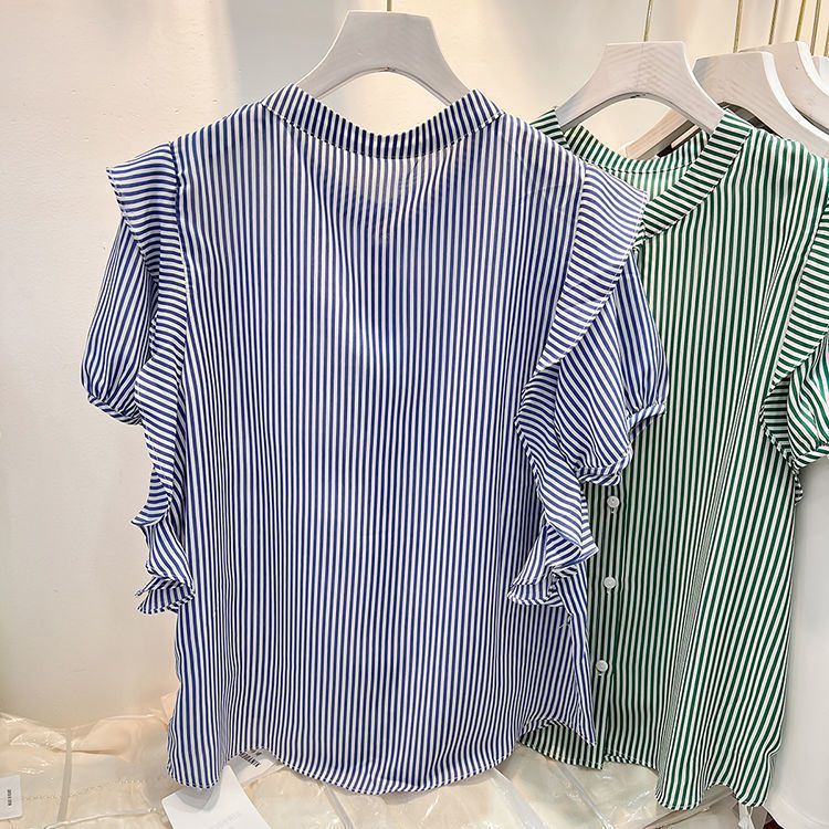 우아한 러플 스트라이프 쉬폰 셔츠 여자 2025 여름 느슨한 슬림 룩 레트로 한국 스타일 프렌치 탑