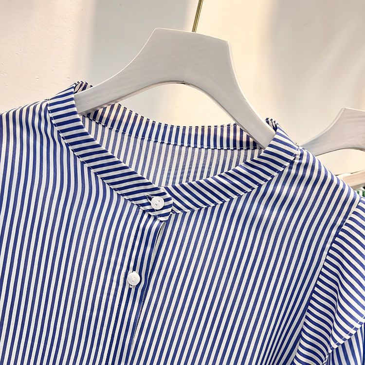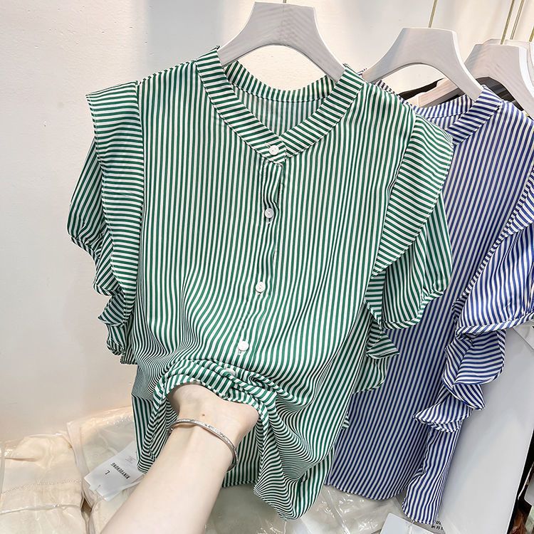 우아한 러플 스트라이프 쉬폰 셔츠 여자 2025 여름 느슨한 슬림 룩 레트로 한국 스타일 프렌치 탑스토어 가기