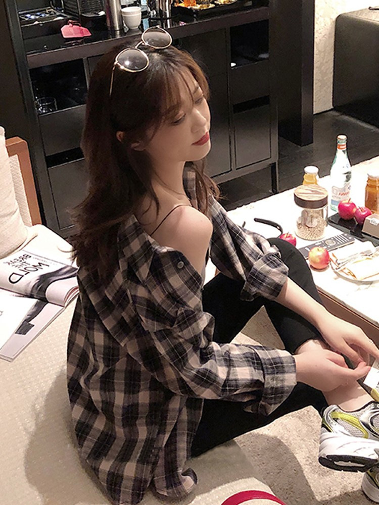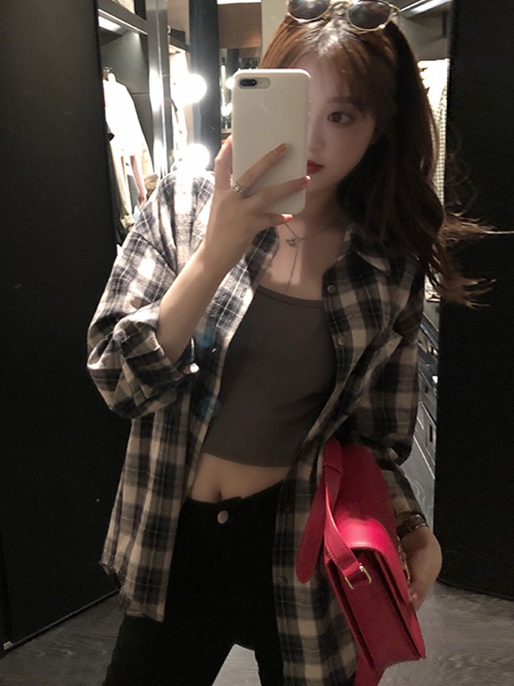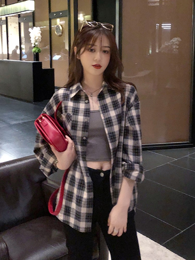 2021秋季新款复古港味格子衬衫女设计感小众外穿上衣长袖宽松衬衣