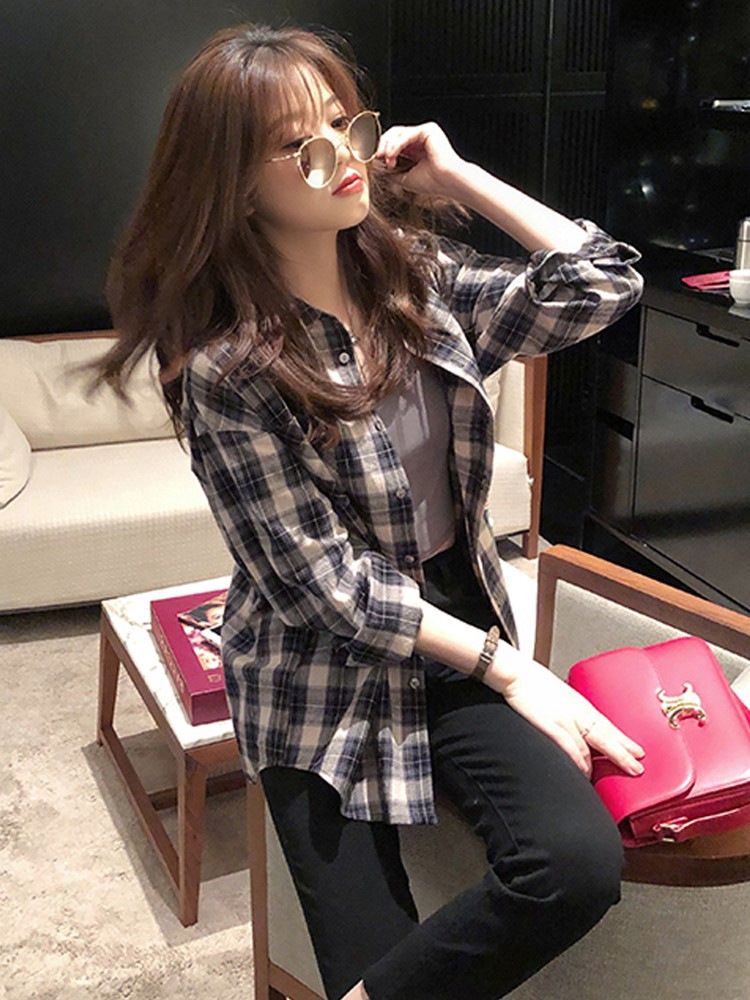 가을 2024 새로운 레트로 홍콩 스타일 체크 무늬 셔츠 여성 디자인 센스 틈새 의상 탑 긴 소매 느슨한 셔츠스토어 가기