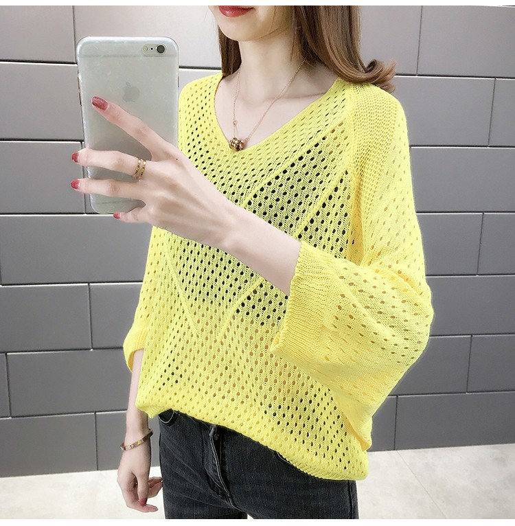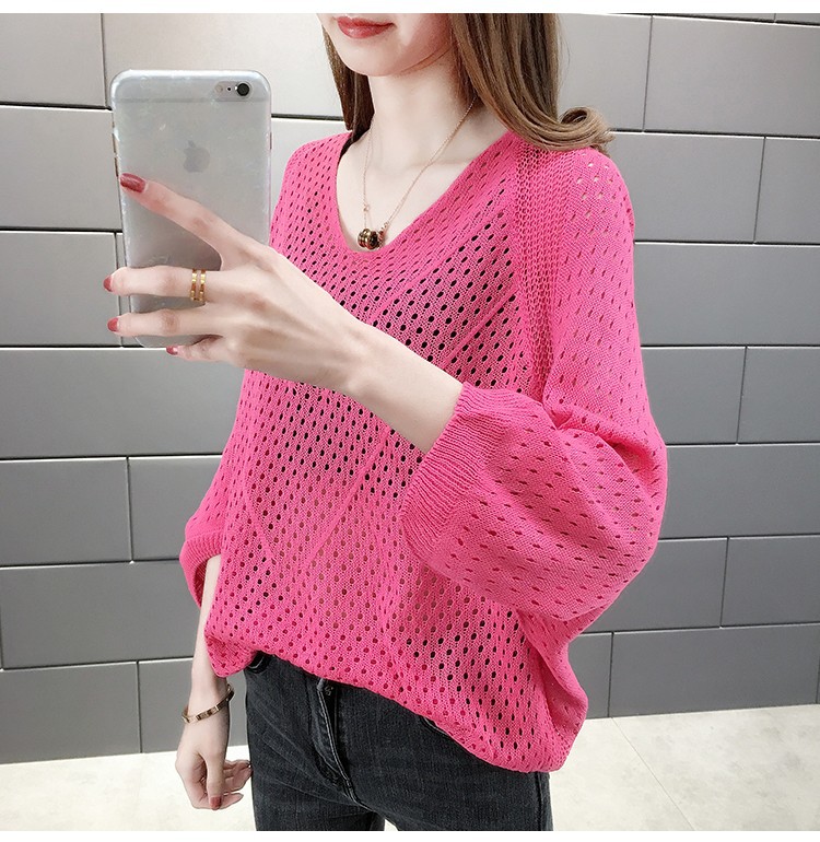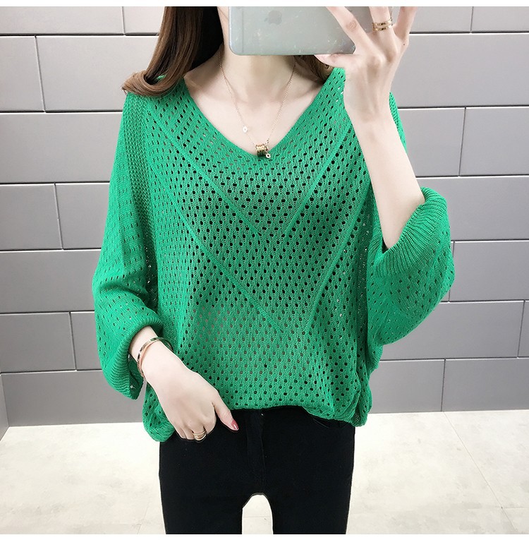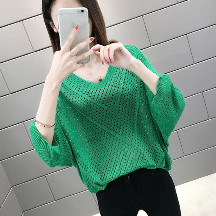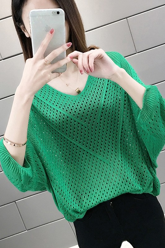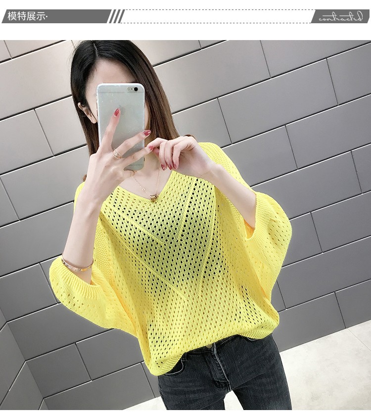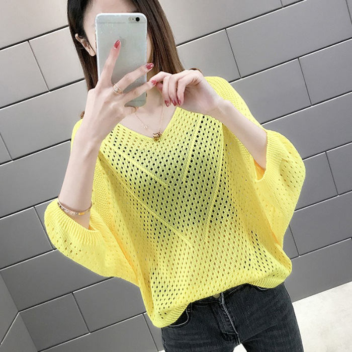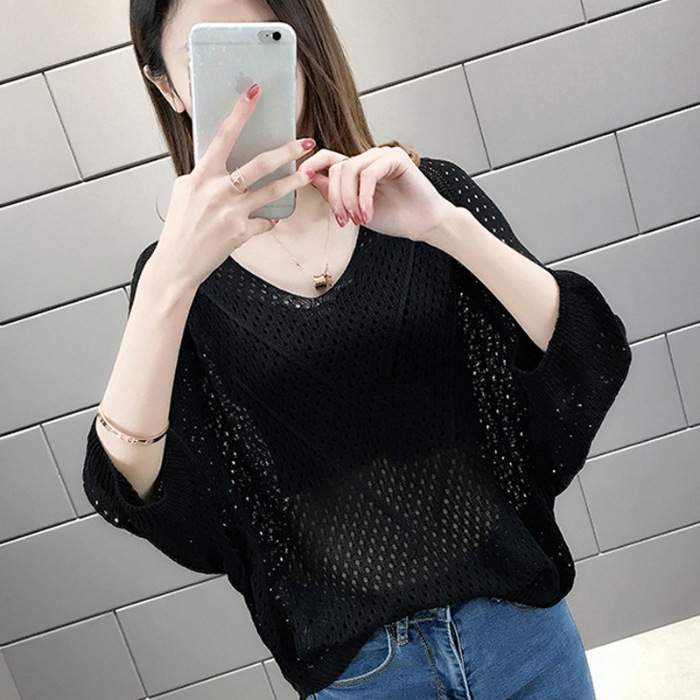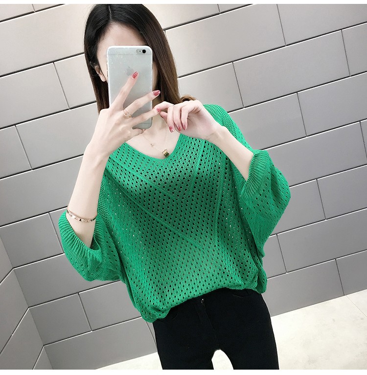 2024 여름 니트웨어 여자 올 매치 티셔츠 얇은 메쉬 블라우스 V 넥 탑 루즈 빈 배트 모빌 트렌디 셔츠