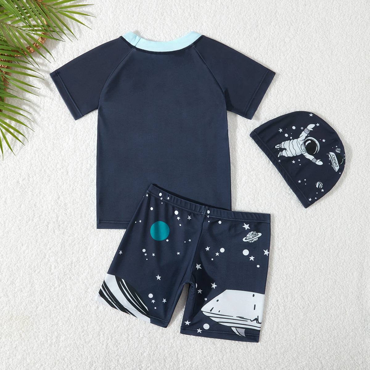 아동용 수영복, 남아용 스플릿 반팔 반바지, 수영모자, 3종 세트, 만화 패턴 수영복, 스포츠 만화 수영복