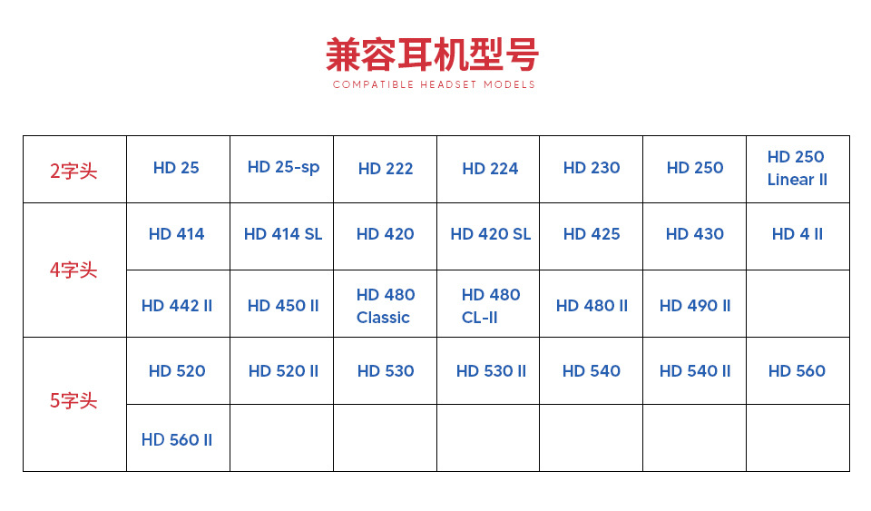 适用以下多种型号:HD 25-sp , HD 222, HD 224, HD 230,HD 250, HD 250 Linear II, HD 414, HD 414 SL,HD 420, HD 420 SL, HD 425, HD 430, HD 440 II, HD 442 II, HD 450 II, HD 480 Classic, HD 480 CL-II, HD 480 II, HD 490 II, HD 520, HD 520 II, HD 530, HD 530 II,HD 540, HD 540 II, HD 560, HD 560 II