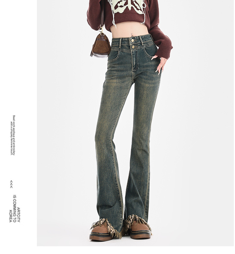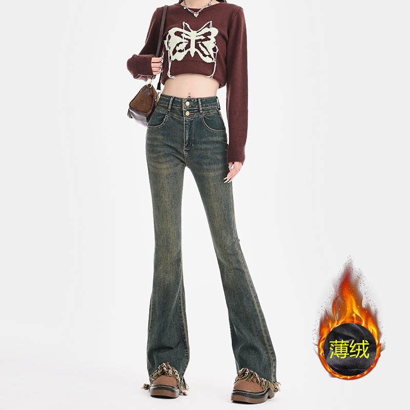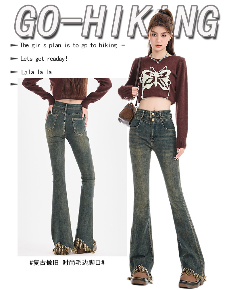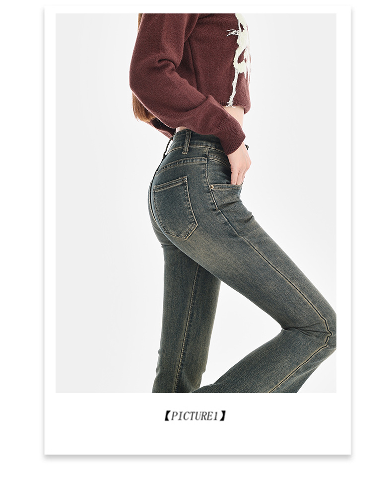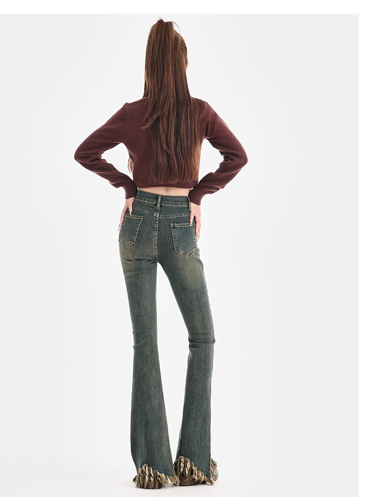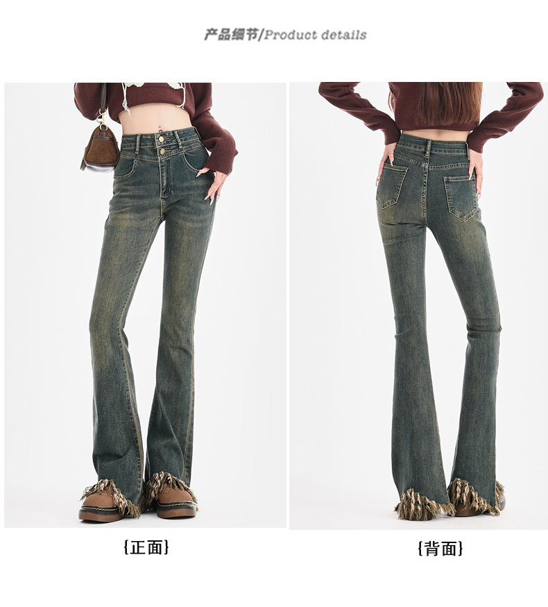 레트로 러프 에지 마이크로 플레어 청바지 여성의 가을과 겨울 2024 새로운 하이 웨이스트 슬림 키 패션 말굽 바지스토어 가기