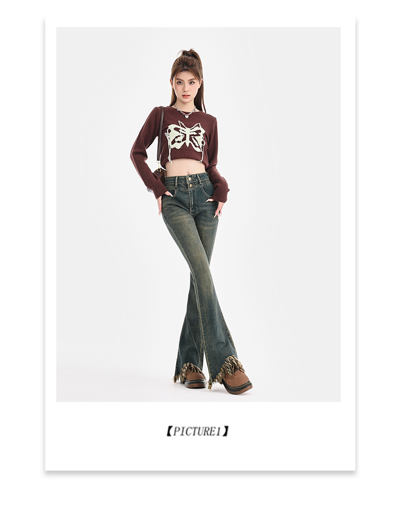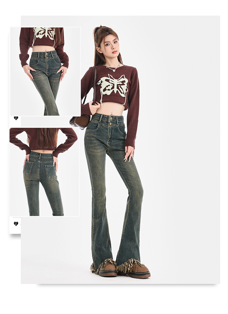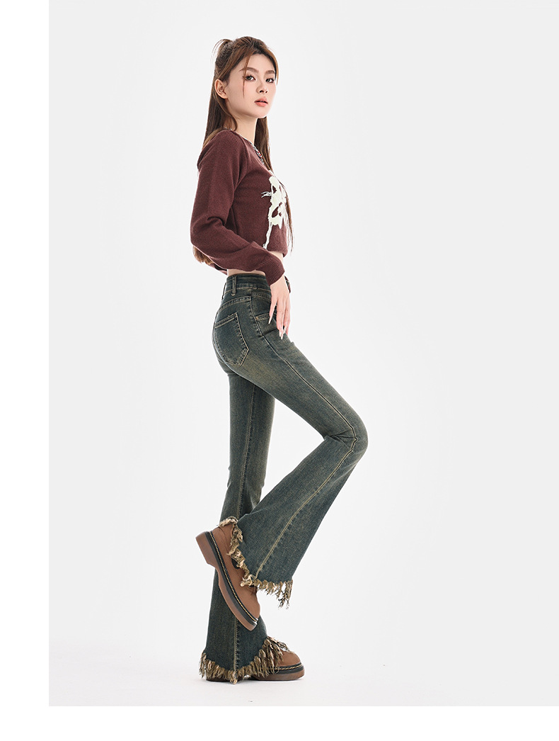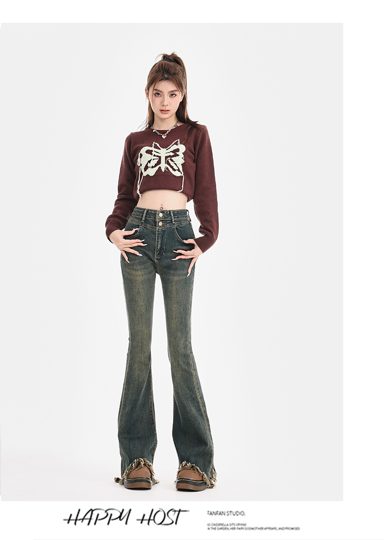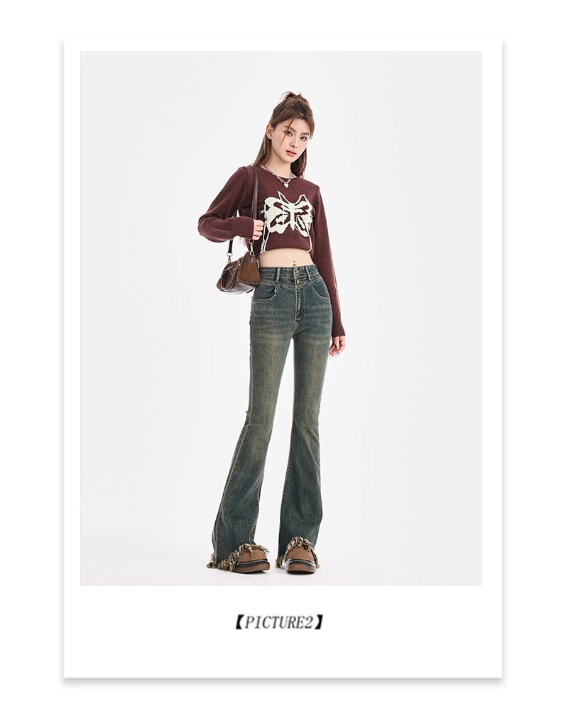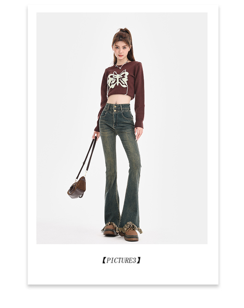 레트로 러프 에지 마이크로 플레어 청바지 여성의 가을과 겨울 2024 새로운 하이 웨이스트 슬림 키 패션 말굽 바지스토어 가기