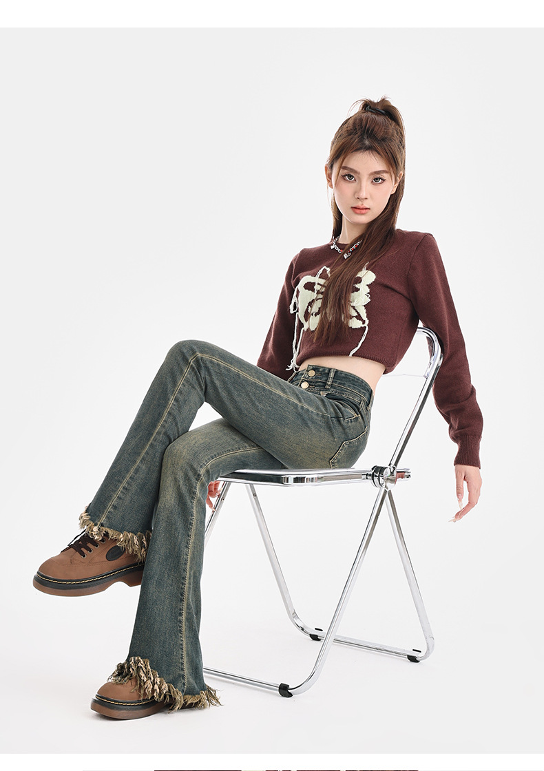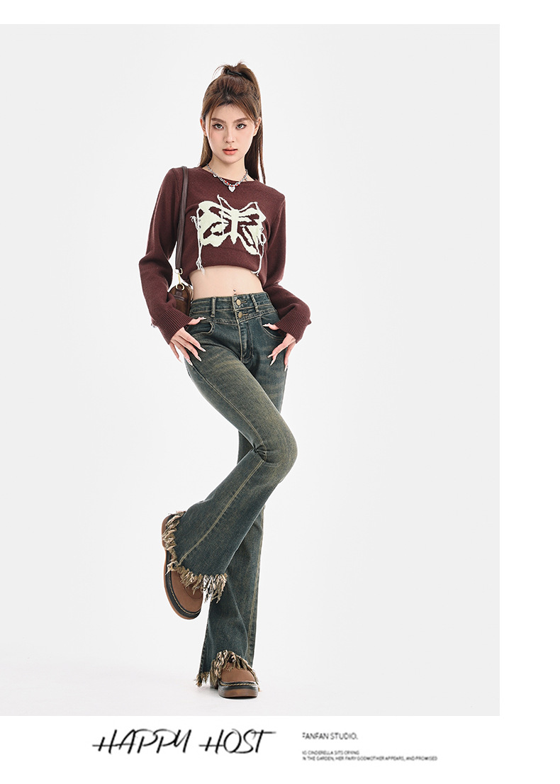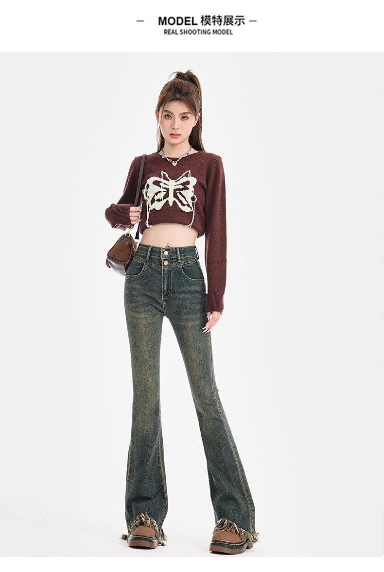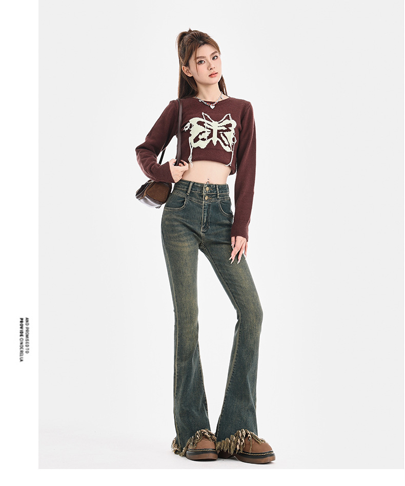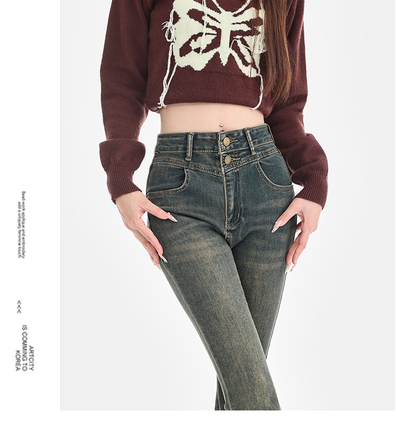 레트로 러프 에지 마이크로 플레어 청바지 여성의 가을과 겨울 2024 새로운 하이 웨이스트 슬림 키 패션 말굽 바지스토어 가기