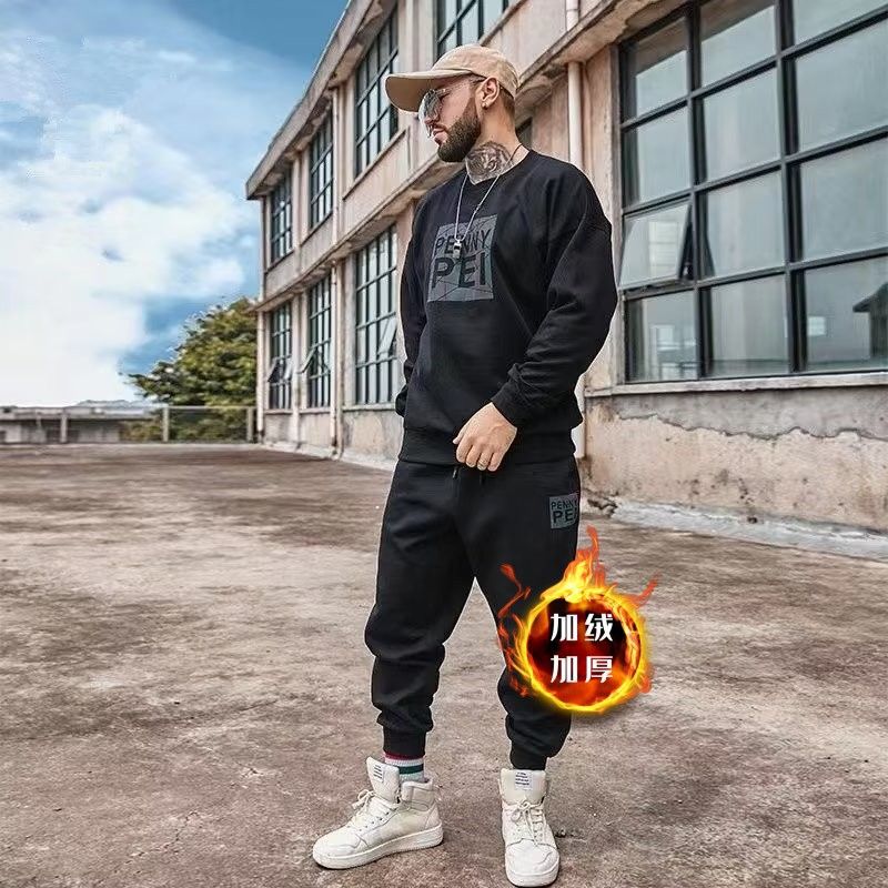 남성용 가을 겨울 풀오버 스웨트 셔츠 정장, 트렌디한 루즈 캐주얼 스포츠 투피스 세트, 벨벳 두꺼운 대형 남성 세트