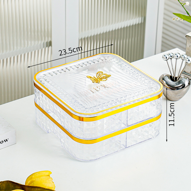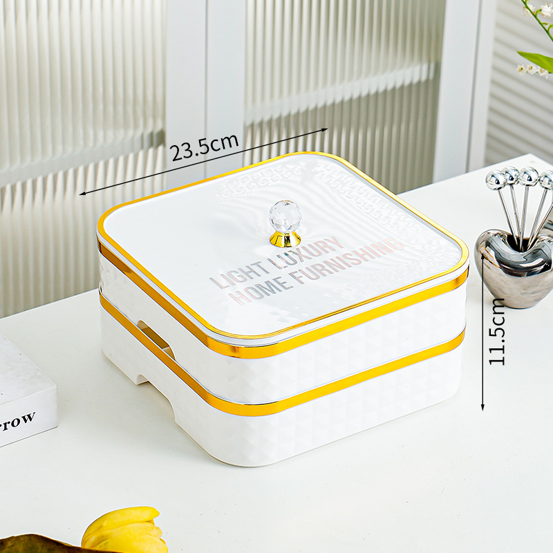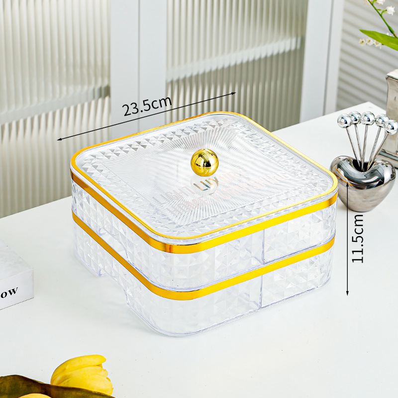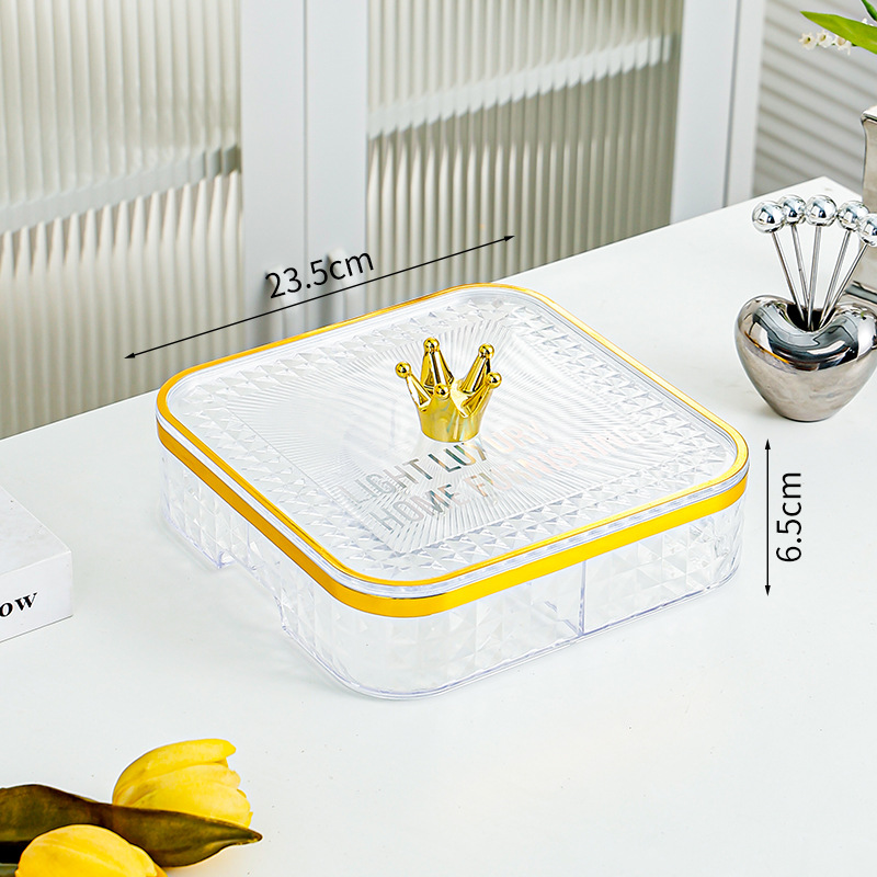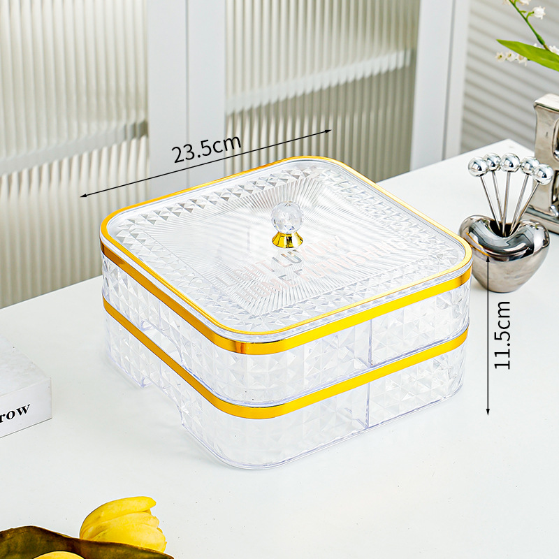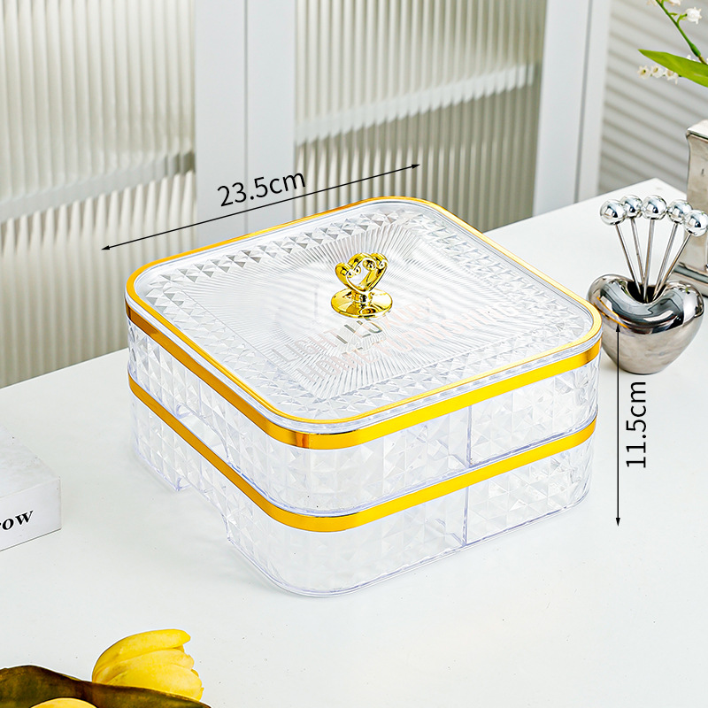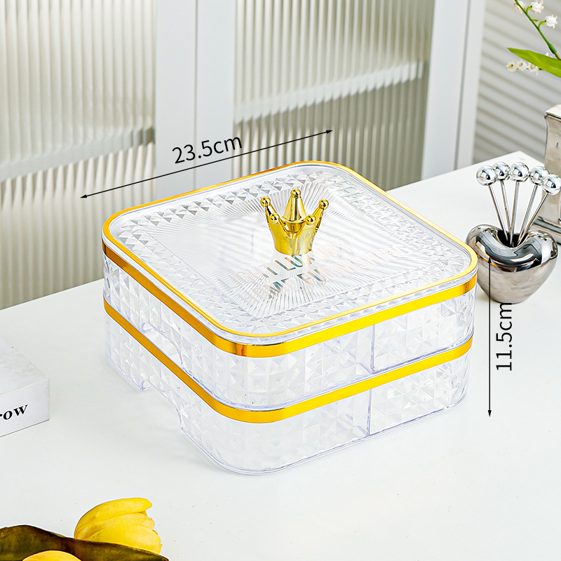 • 투명 사각 다이아몬드 + 작은 크라운이 있는 LH 골드 에지 더블 레이어 과일 접시
