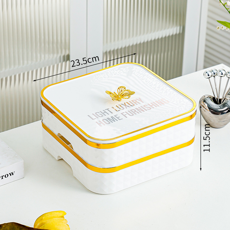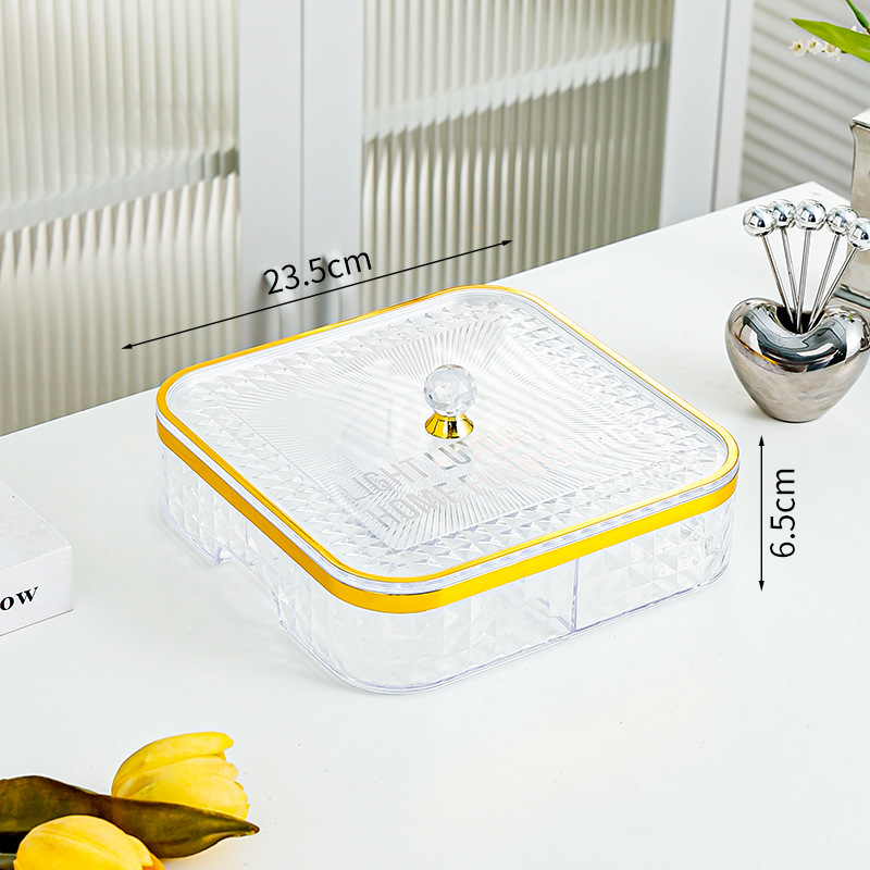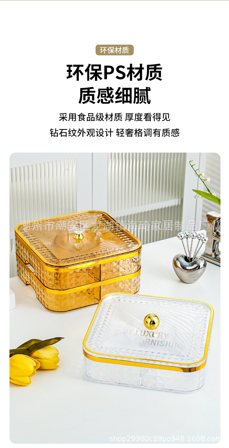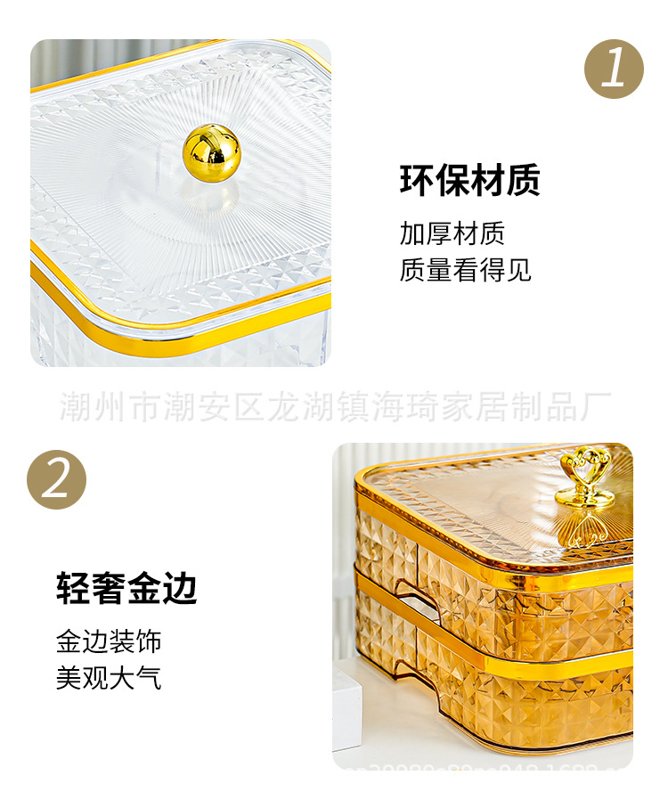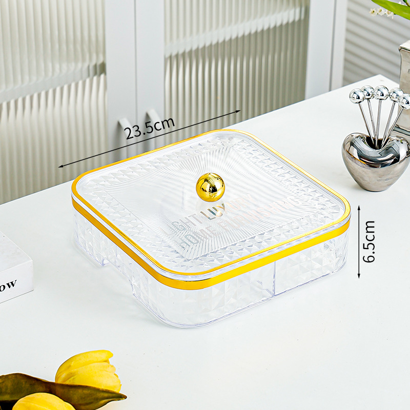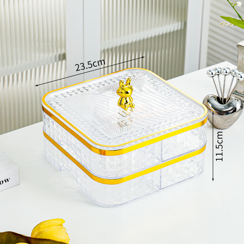 • 투명 사각 다이아몬드 + 작은 크라운이 있는 LH 골드 에지 더블 레이어 과일 접시