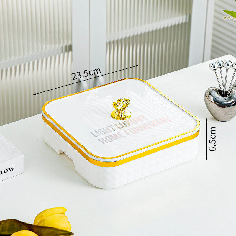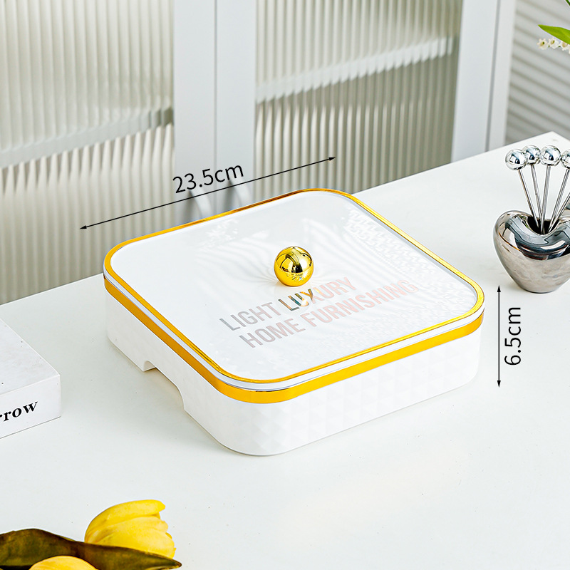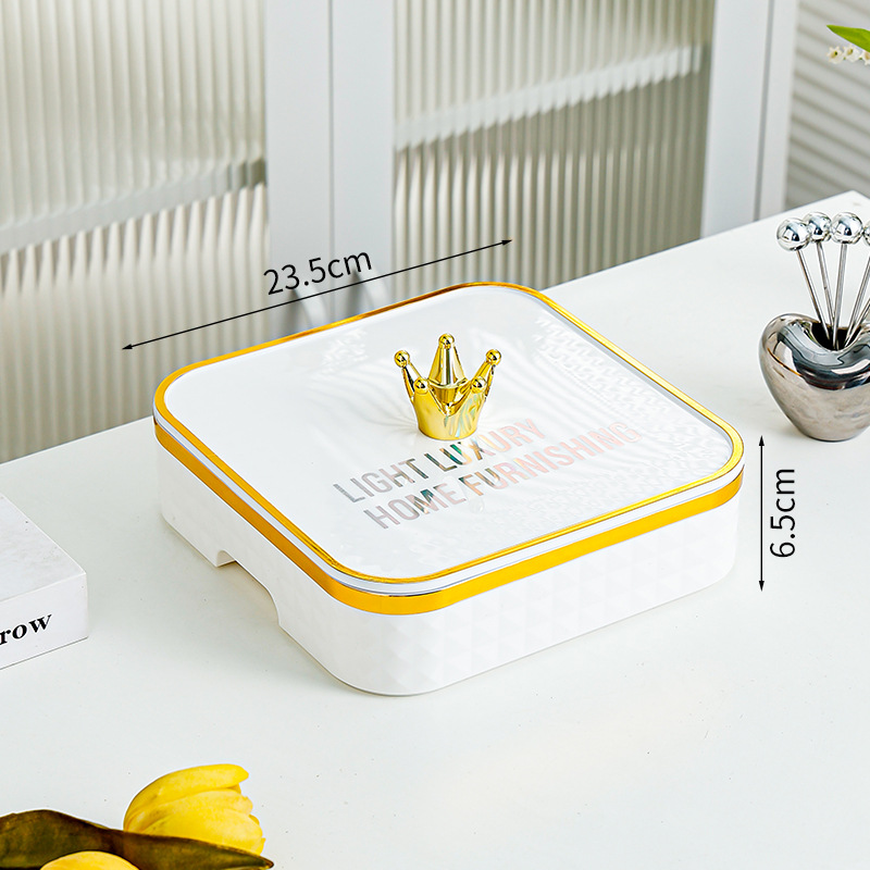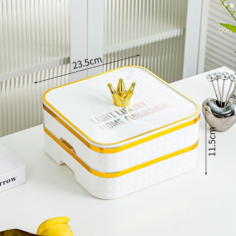 • 솔리드 화이트 스퀘어 다이아몬드 + 작은 크라운이 있는 LH 골드 에지 더블 레이어 과일 접시
