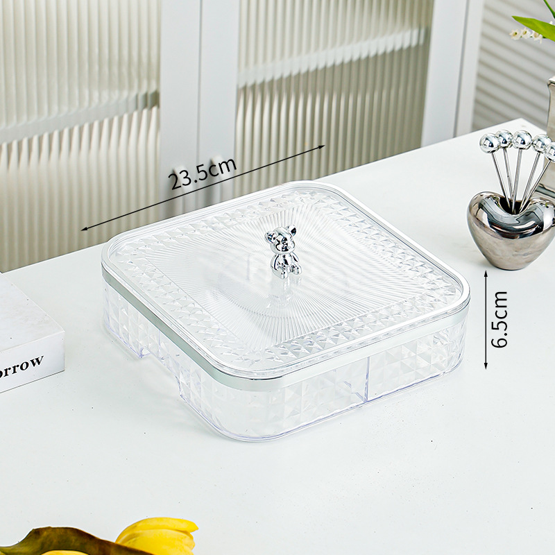 • 은색 곰 과일 접시가 있는 투명한 사각형 다이아몬드 은색 가장자리 단일 레이어