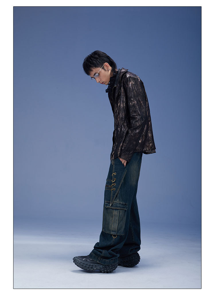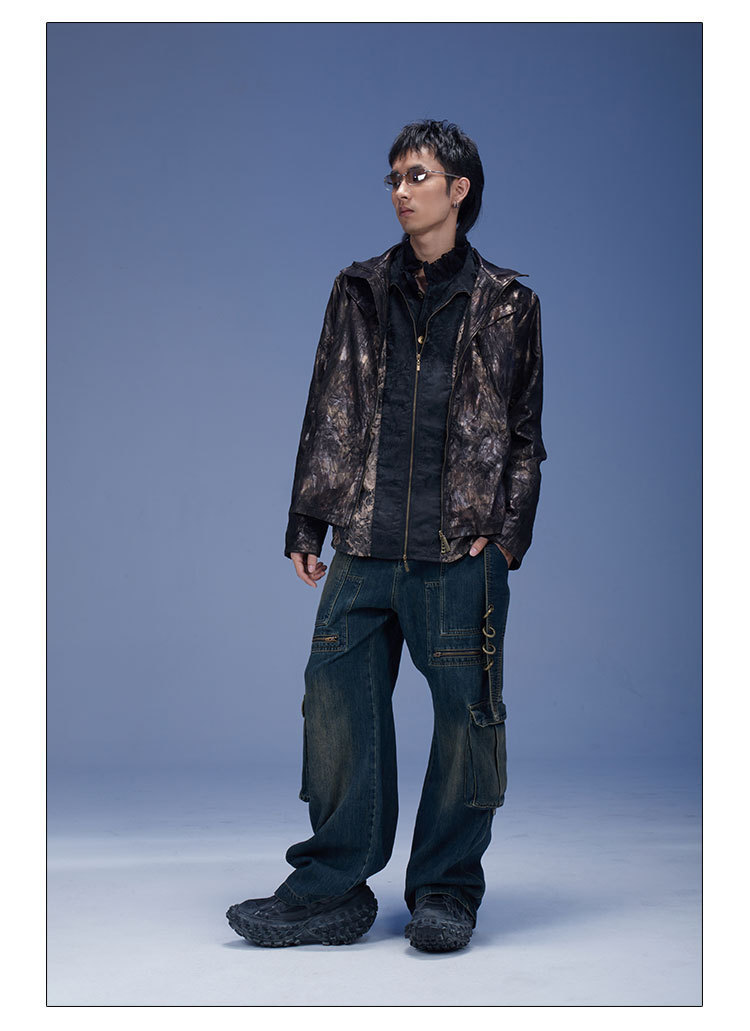 2024 새로운 디자인 센스 레트로 개척자 해체 포켓 중공업 낡은 느슨한 스트레이트 블랙 청바지