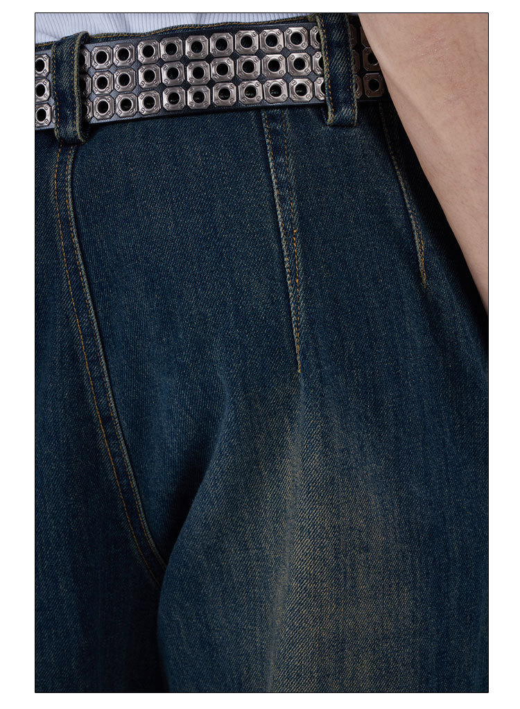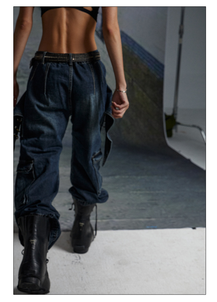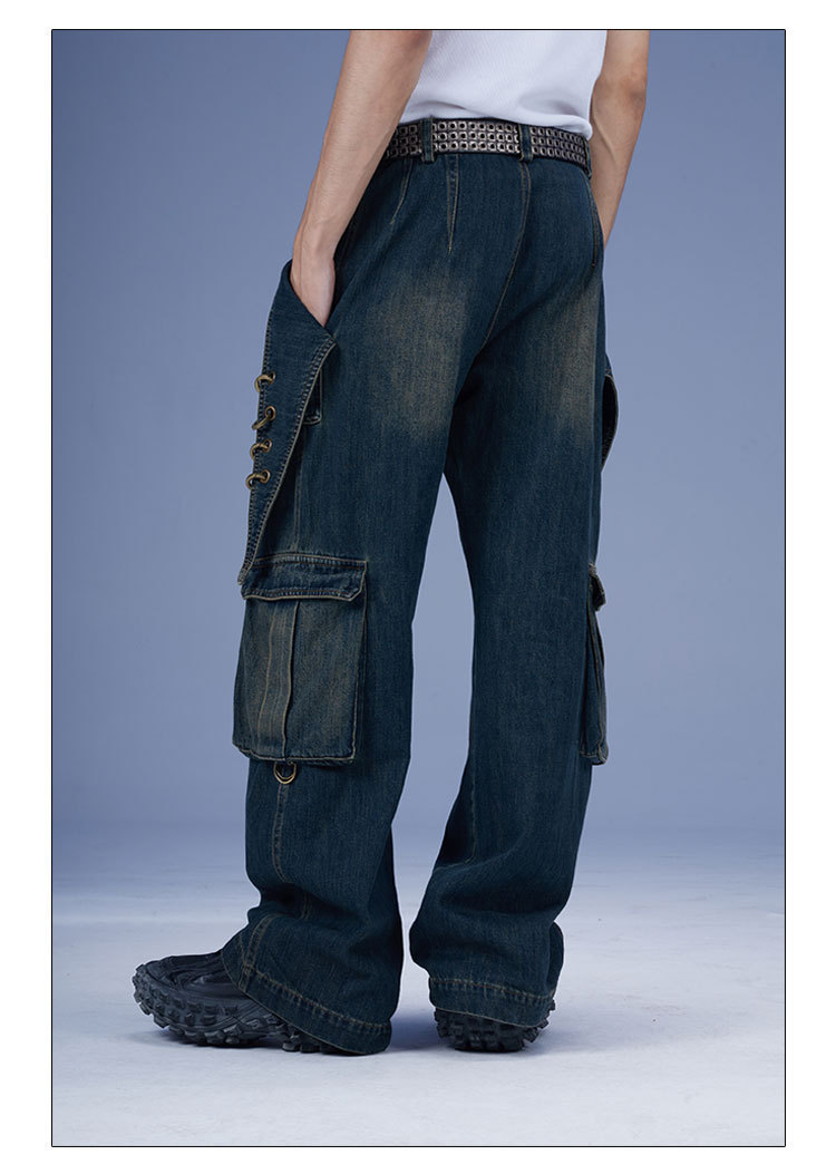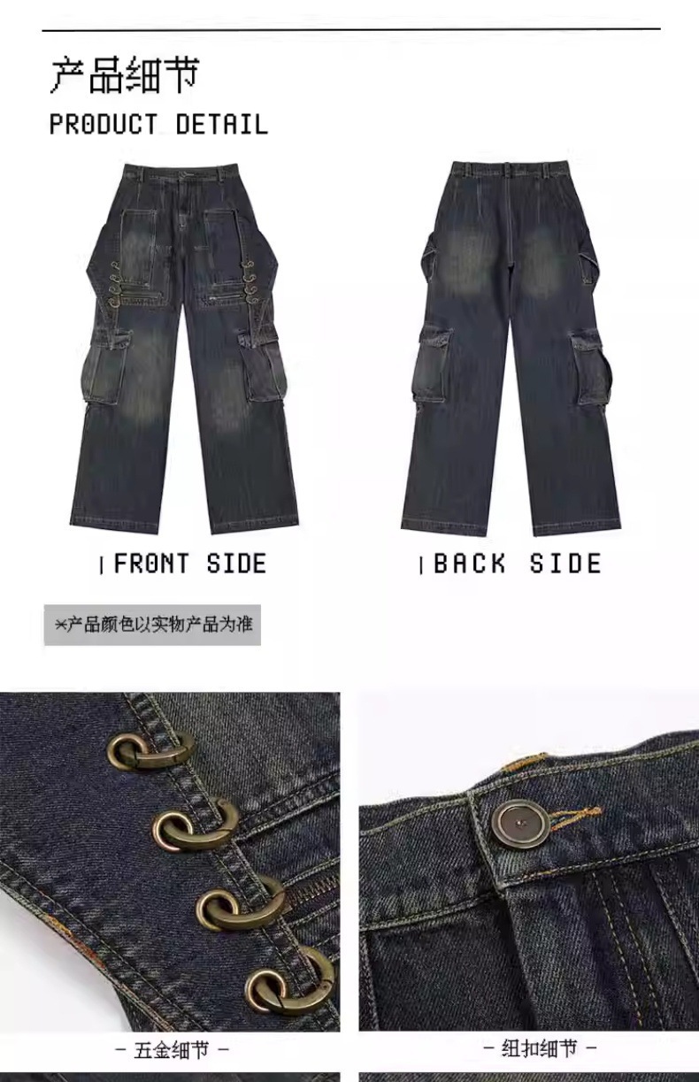 2024 새로운 디자인 센스 레트로 개척자 해체 포켓 중공업 낡은 느슨한 스트레이트 블랙 청바지스토어 가기