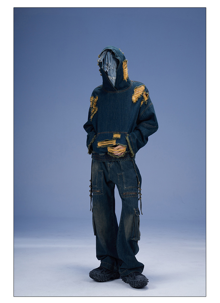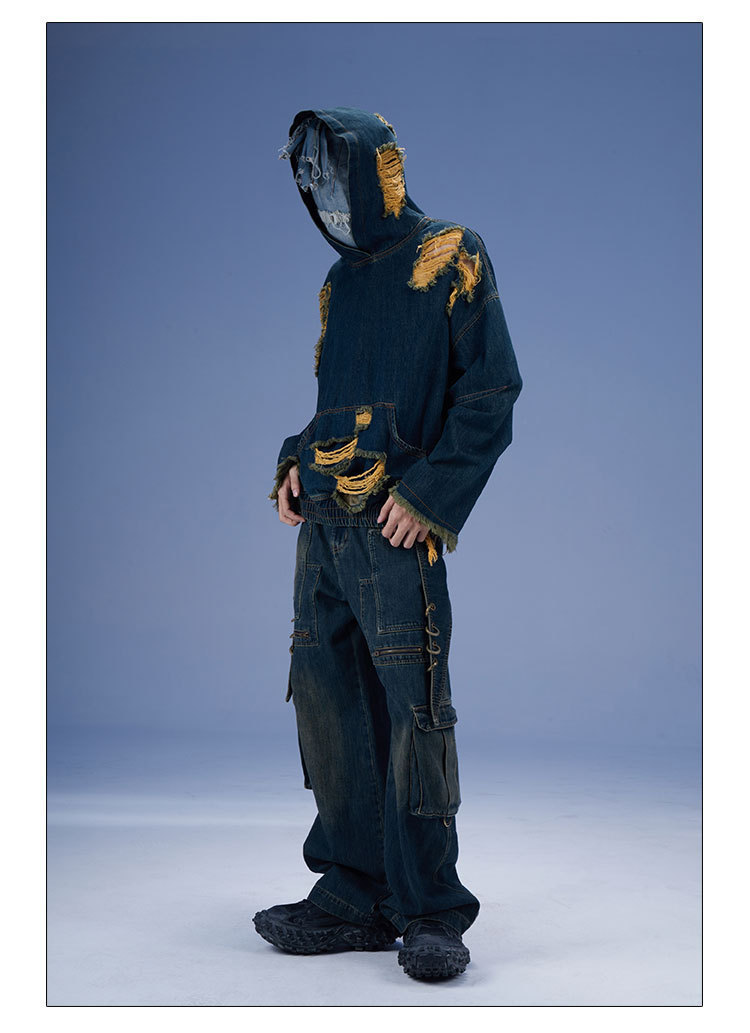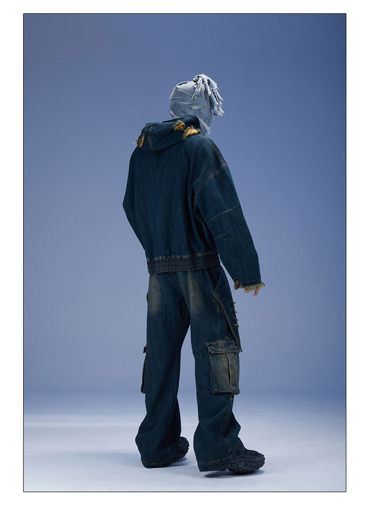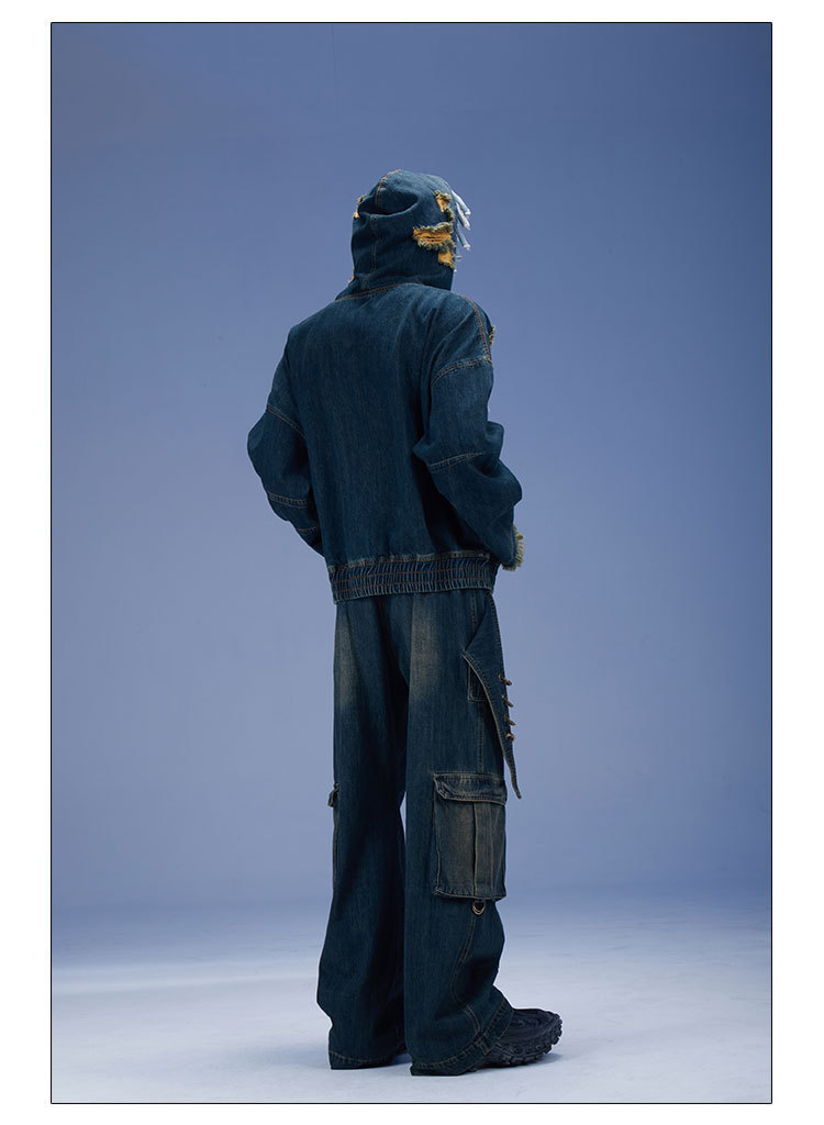 2024 새로운 디자인 센스 레트로 개척자 해체 포켓 중공업 낡은 느슨한 스트레이트 블랙 청바지스토어 가기